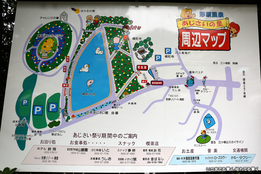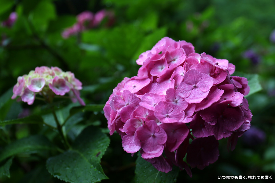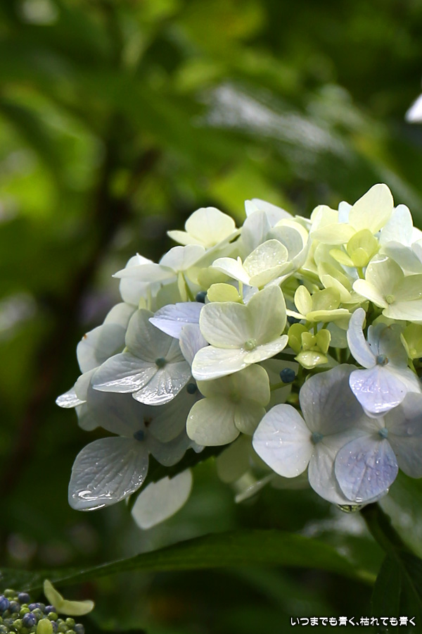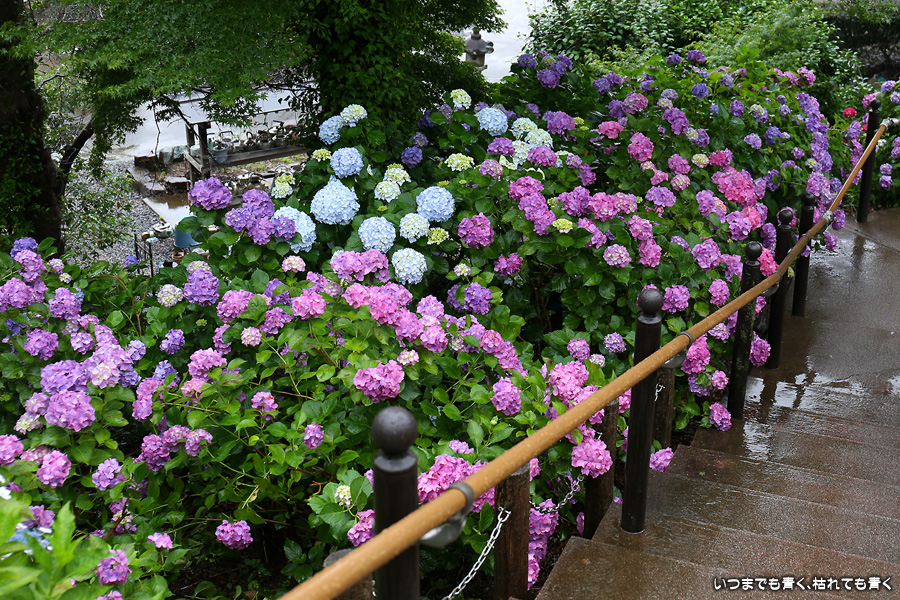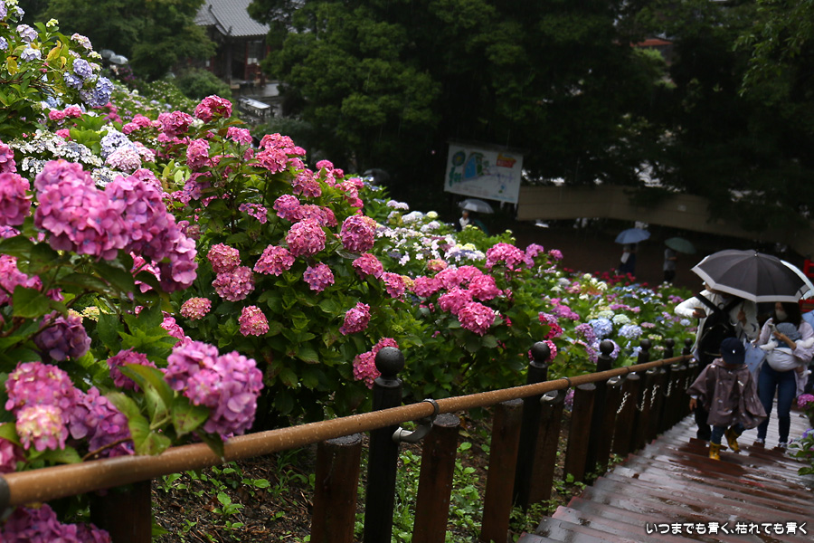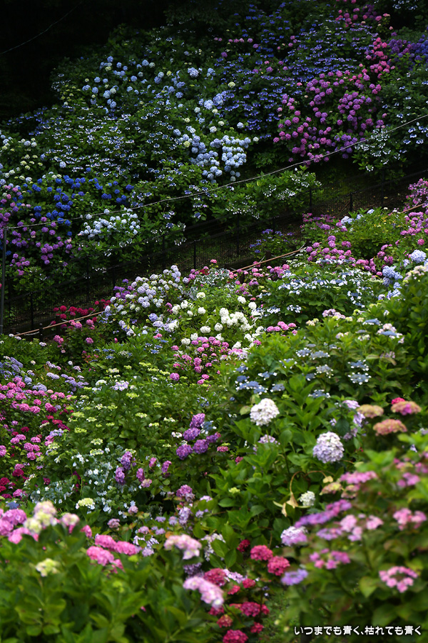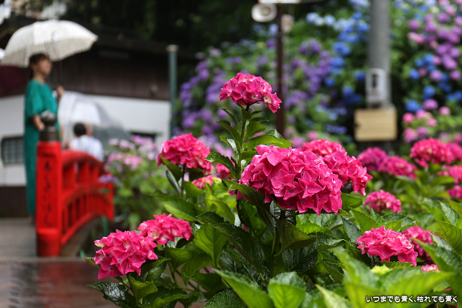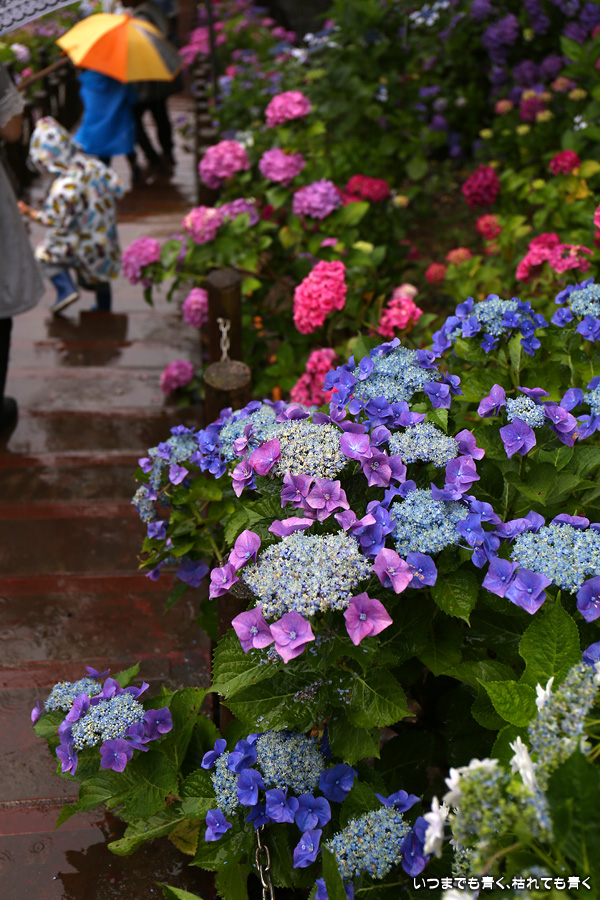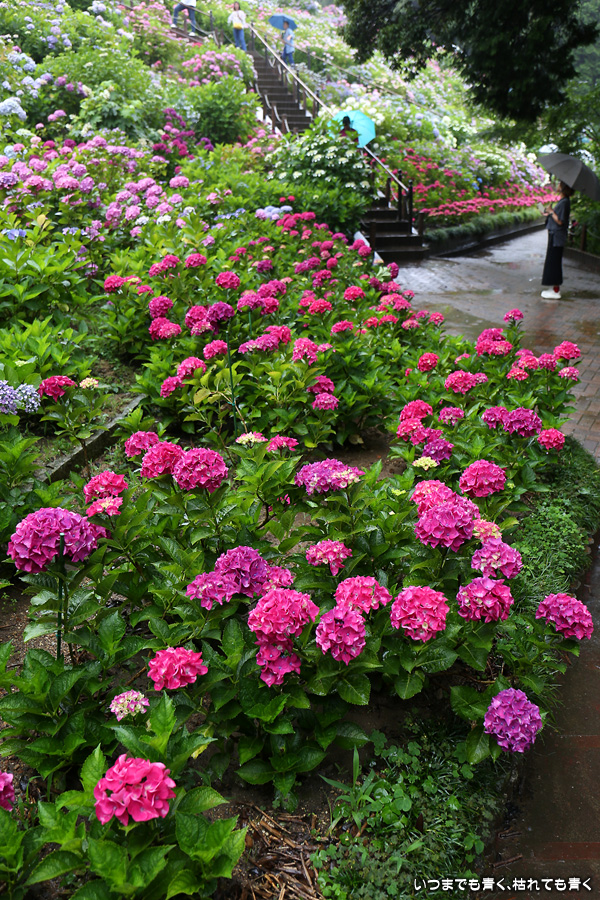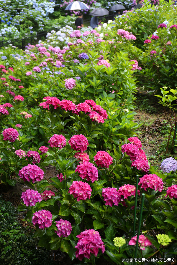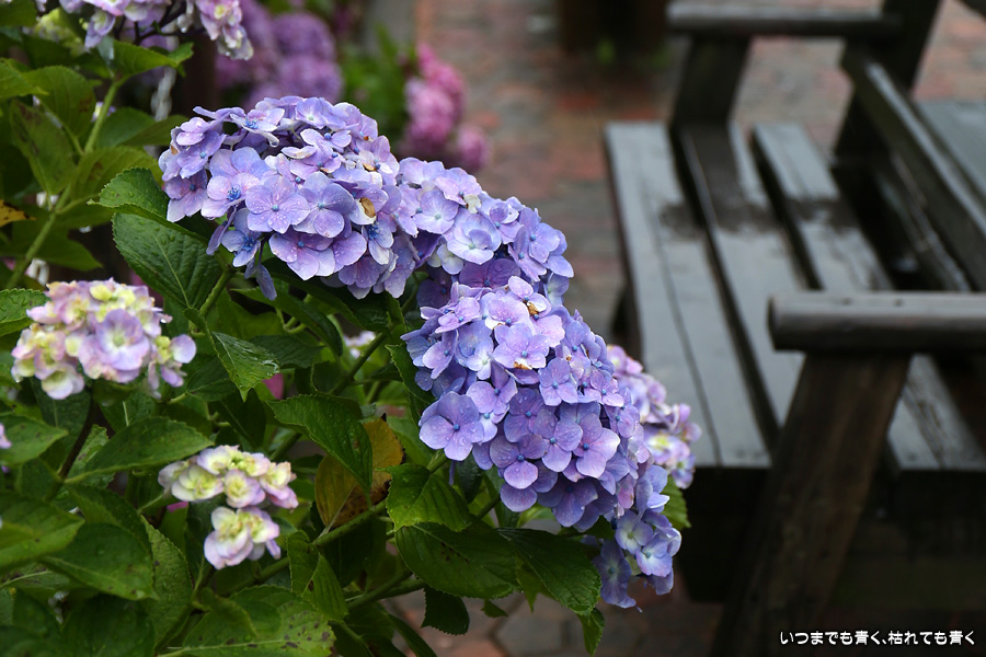形原温泉あじさいの里は、愛知県では有名な紫陽花の名所なのですが、紫陽花は多くても味気がないだろうと勝手に思っていて訪れることがなかったところです。なので、今回が初めての訪問となります。雨が降っていて紫陽花にはいい感じでしたが、望遠レンズを持ち込むことは難しく、傘をさしての標準ズームレンズでの撮影となりました。形原温泉あじさいの里は、思っていた以上に絵になる素敵なところでした。起伏在り、池あり、橋あり、丘ありの地形にいろんな種類、いろんな色の紫陽花が植えられていて、広い園内を退屈することなく時間を忘れて楽しむことができました。