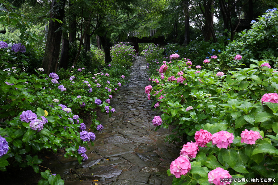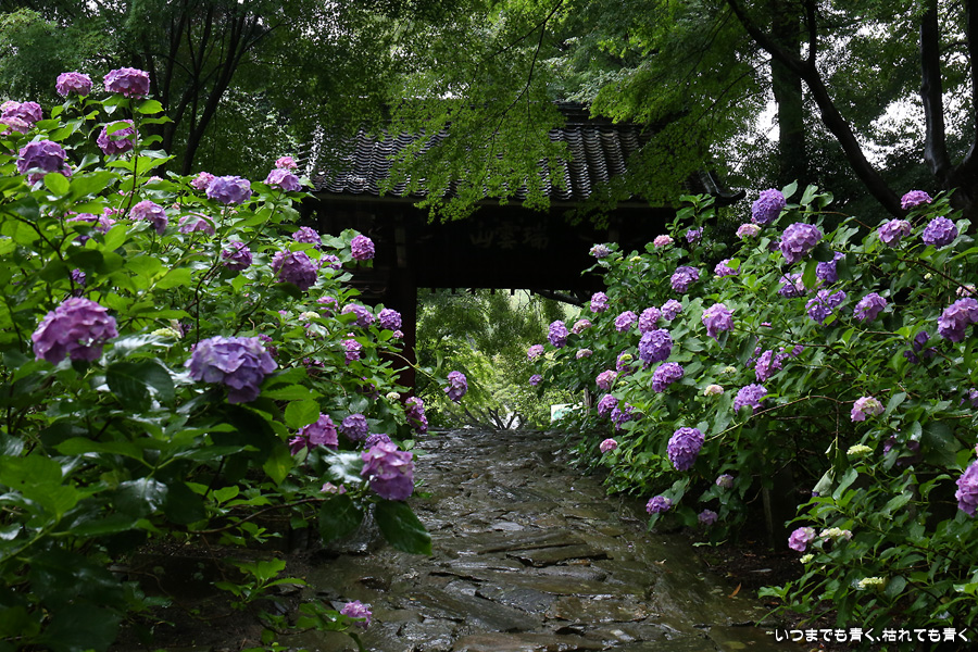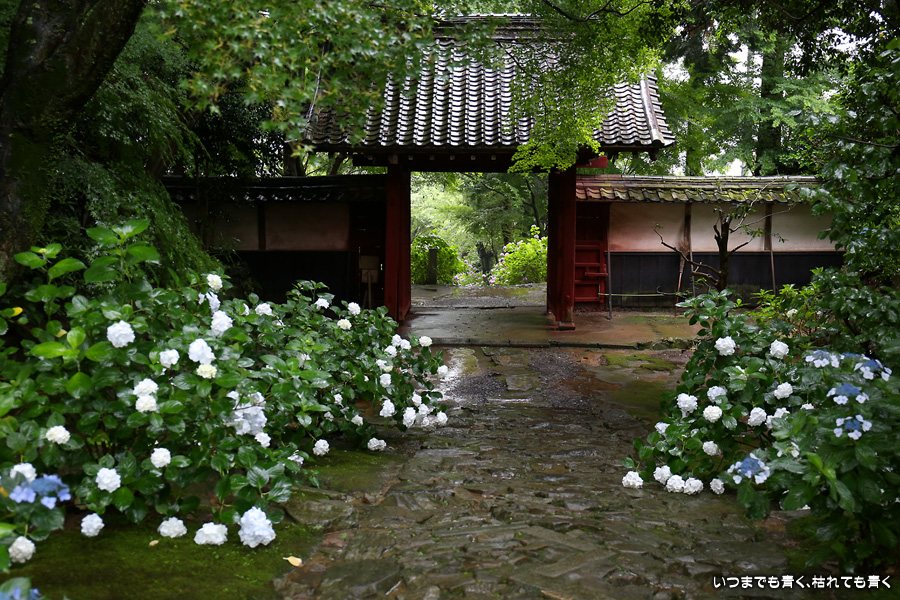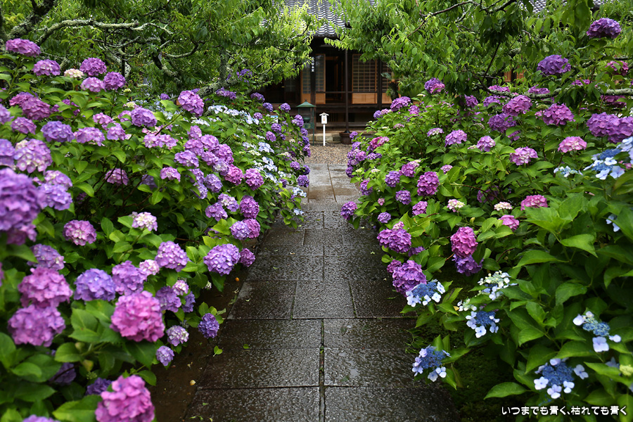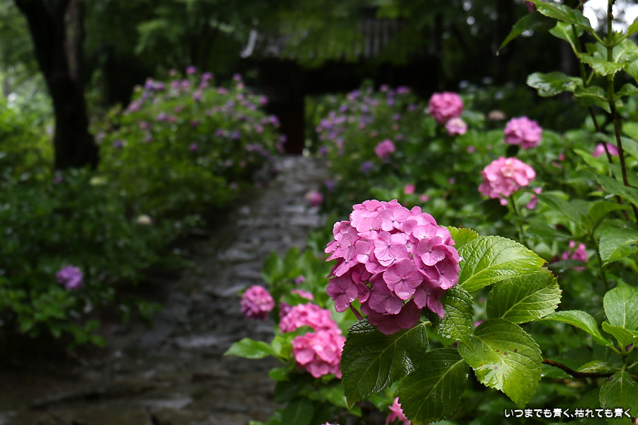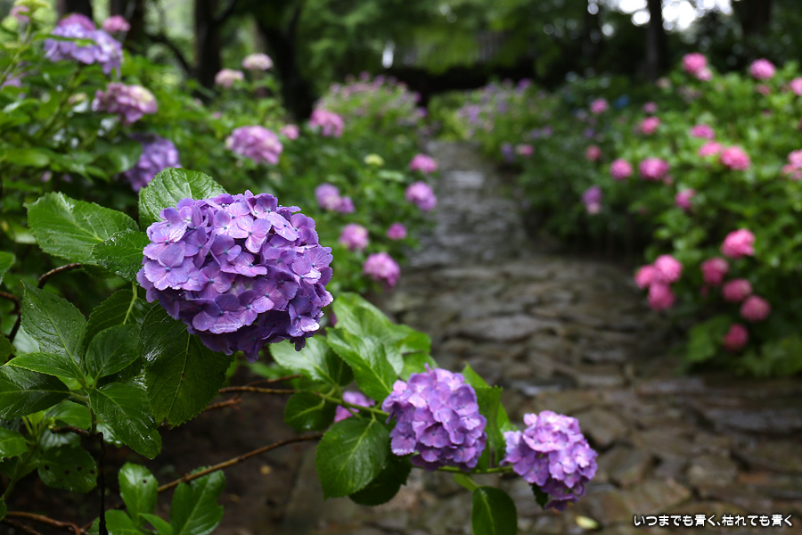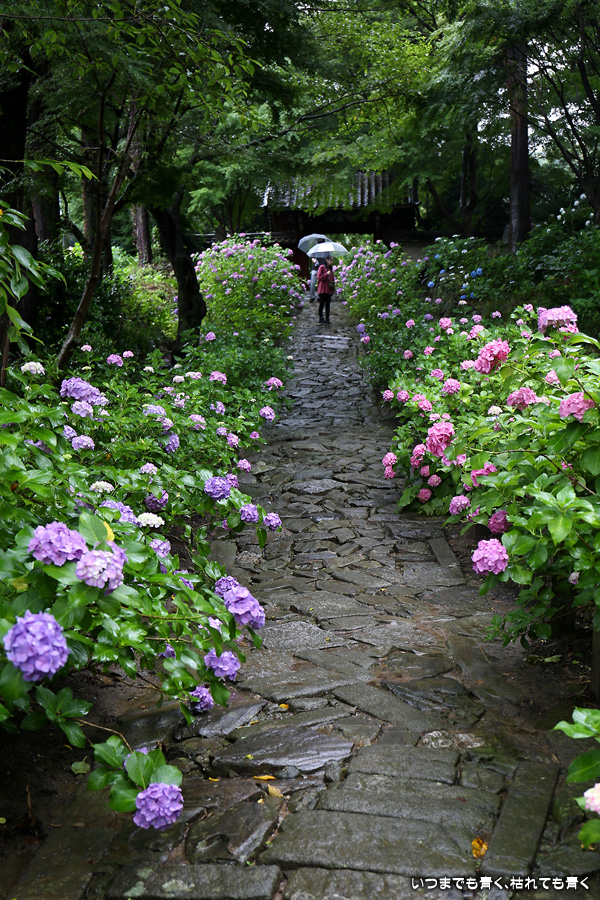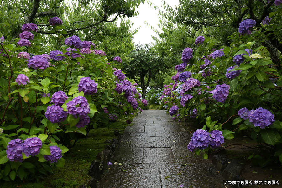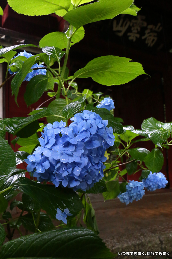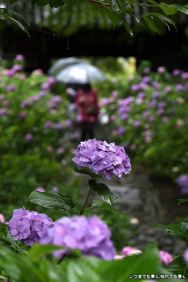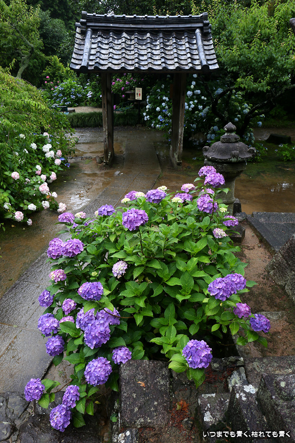 形原温泉あじさいの里の帰りに雨の本光寺の紫陽花も見たくて立ち寄りました。雨の日の撮影は大変ですが、紫陽花は雨の日のほうが美しく写真におさめることができたと思います。ひととおり撮影した後にもう一度境内に戻ろうとした時にアクシデントがありました。団体の大勢のおばちゃんを追い抜こうとして石畳からぬかるみに足を置いた瞬間、滑って転んで尻もちをついてしまいました。おばちゃんたち、「大丈夫?」と心配してくださるので「服はよごれましたが大丈夫です!」と言ってお礼を言って立ち去りましたが、お尻は泥だらけになり、膝を捻って少し痛めてしまいました。無理に追い越そうとしたこと、靴が古くなって滑りやすくなっていたことが良くなかったです。大怪我しなくて良かったです。