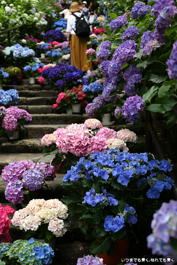 長谷寺の嵐の坂に紫陽花の鉢植えがびっしりと飾られています。大和三大観音である長谷寺、岡寺、壷阪寺でおこなわれている「あぢさゐ回廊」です。いろんな色の鮮やかな紫陽花はとれも美しいです。嵐の坂は立ち入り禁止にもなっておらず、この石段を鉢植えを避けて上ったり下りたりできます。写真を撮るには人が入って邪魔ですが、おかしな雰囲気になることも無く皆さん楽し気に写真を撮っていました。私も人を入れたり、じっと人がいなくなるのを待ったりと、のんびりと楽しみながら写真撮影をしました。岡寺と壷阪寺にも行きたいと思いましたが、それは来年の楽しみになりそうです。