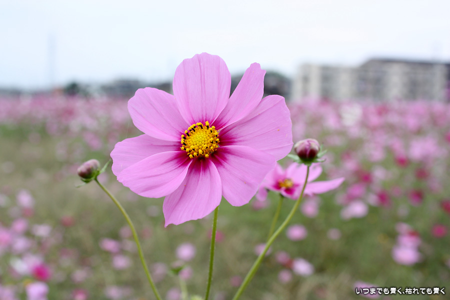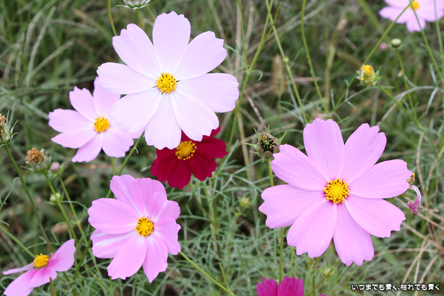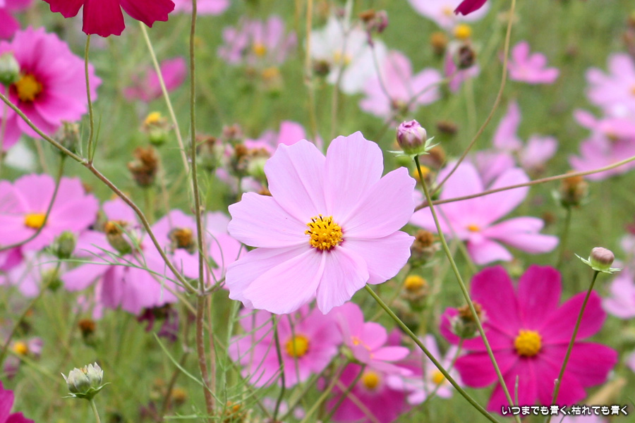 今日、カメラを片手に近くのコスモス畑2ヶ所に行ってきました。たまに小さな子供連れの家族がやってきて、コスモスをバックに写真を撮ったりしています。私も頼まれて写真を撮ってあげました。あらためてコスモスの花をよく見ると、色だけではなく形も微妙に違っていているのですね。コスモスという花にあまり興味もなく、漠然とコスモスをいう花をとらえていたように思います。コスモスをこんなにじっくりと見たのは、生まれて初めてかも知れません。四季の花をこうして楽しんで季節を感じながら時を過ごす楽しみ。老け込むのは嫌ですが、こういう楽しみを感じる事ができるようになったのは、やはり年齢なのでしょうね。そのうちに、あと何回見ることができるかなぁ、なんて思うのでしょうかね・・・。