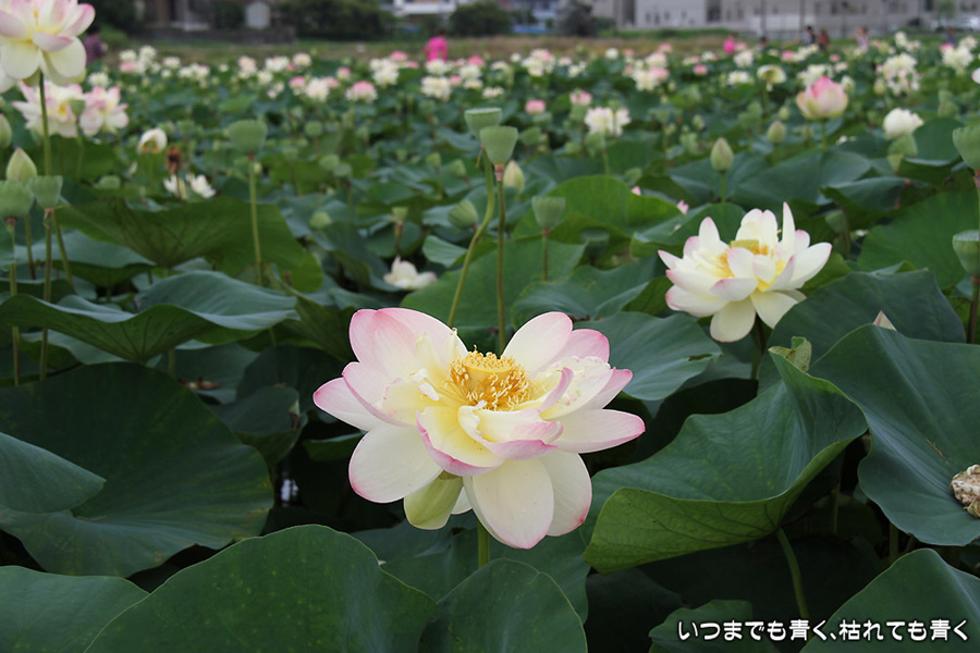 家から車で10分ほどの場所にある蓮田です。昨年は7月22日に見に行って見頃が過ぎていましたので、今年は早めに見に行こうと思って、今日の昼前に行ってきました。すでに花托だけになっているものもありましたが、まだまだ数多く咲いていて、ここしばらくは見頃の時期が続きそうです。