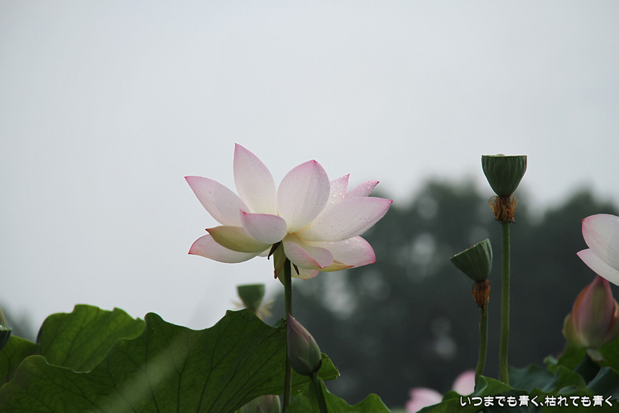 自宅から20kmほどのところにある「あいち健康の森公園」の蓮の花を見に行ってきました。「あいち健康の森公園」は初めてですが、いろんな花が楽しめる公園のようです。蓮は朝が勝負!ということでせっかく早起きして出かけたのに、着いたら本降りの雨。どうなることかと思いましたが、蓮を見ていた2時間ほどだけ運よく雨がやみ、なんとか雨を気にせずに楽しむことができました。時期的にはやや遅かったという感じでしたが、淡いピンクの花がとても美しかったです。