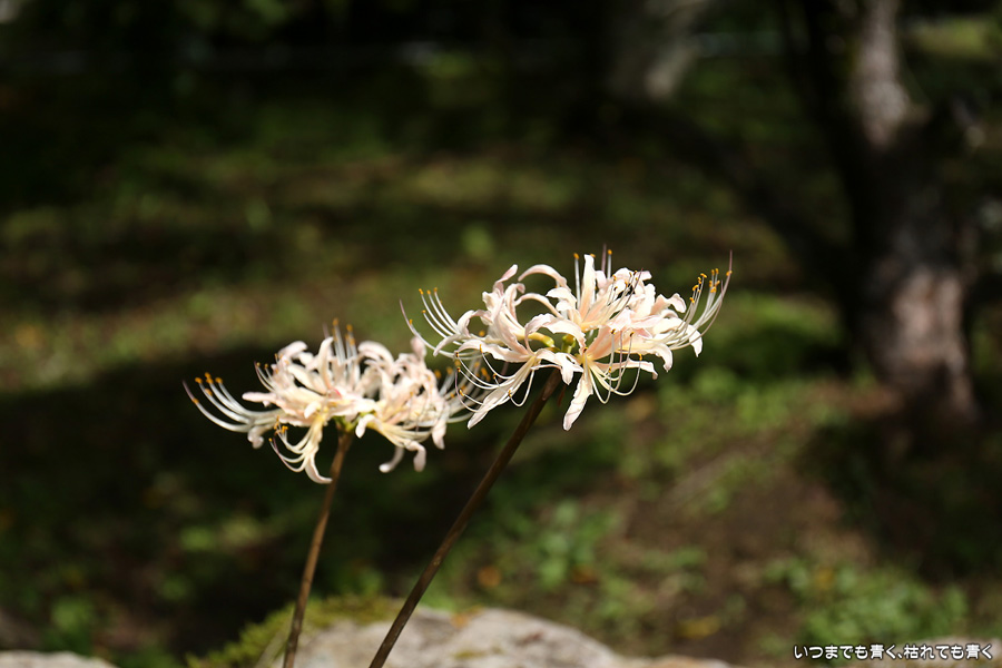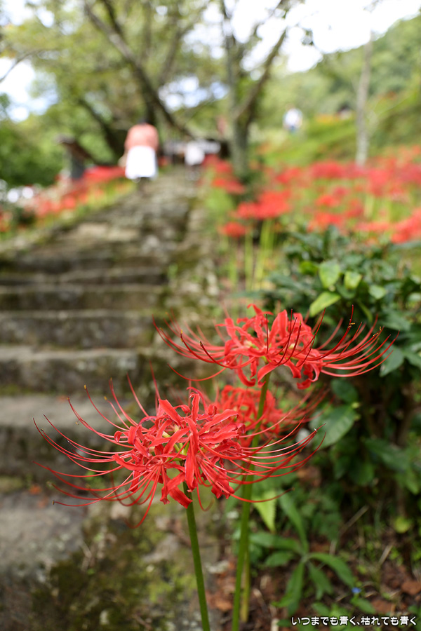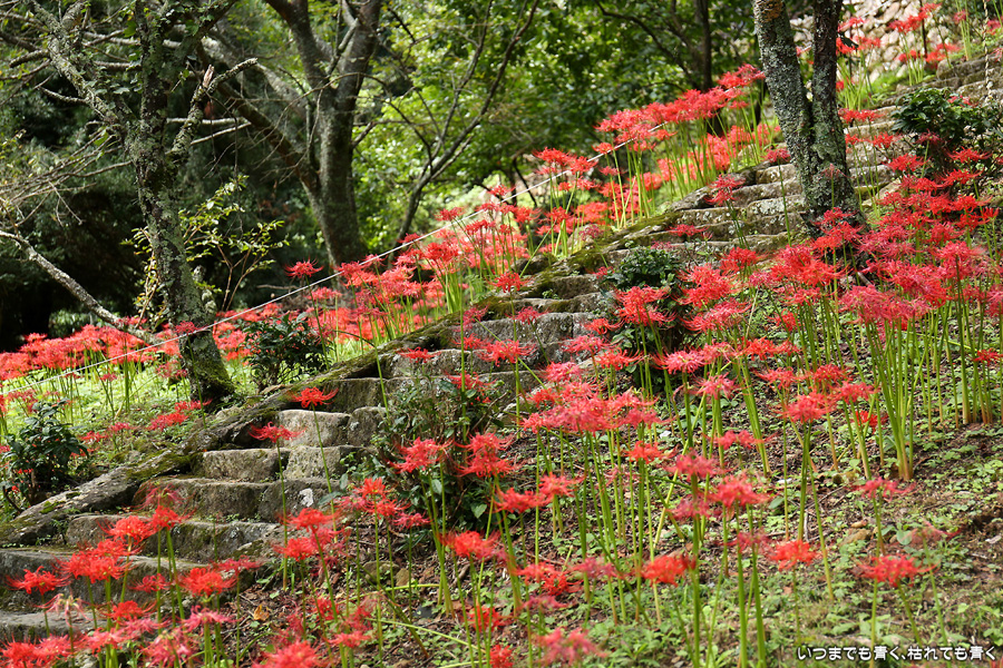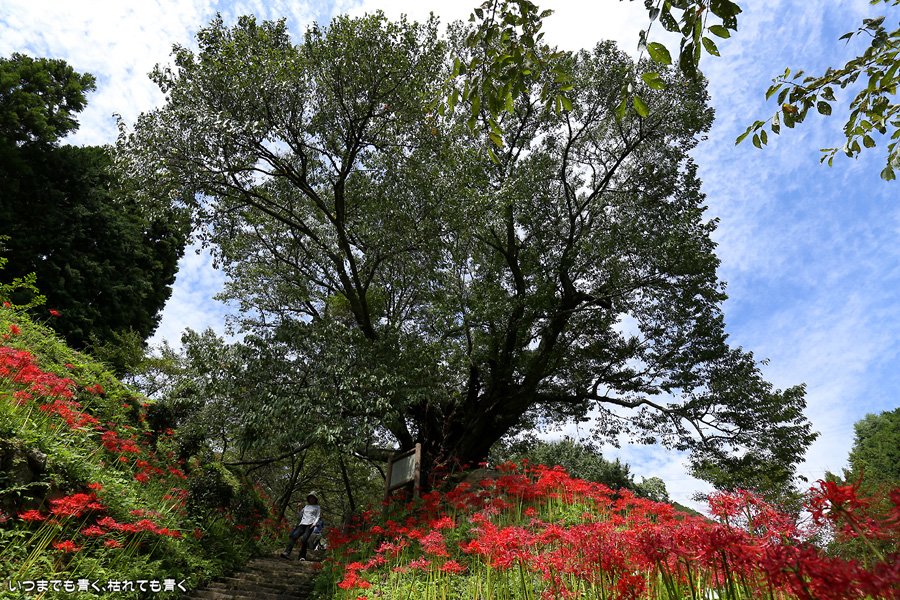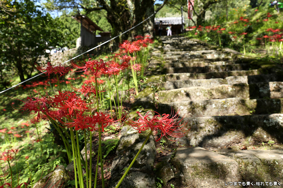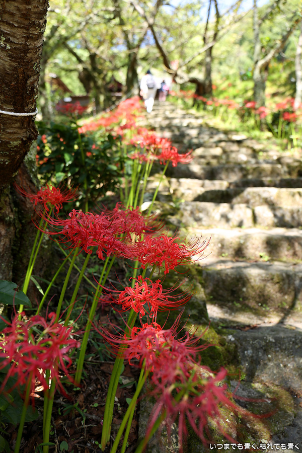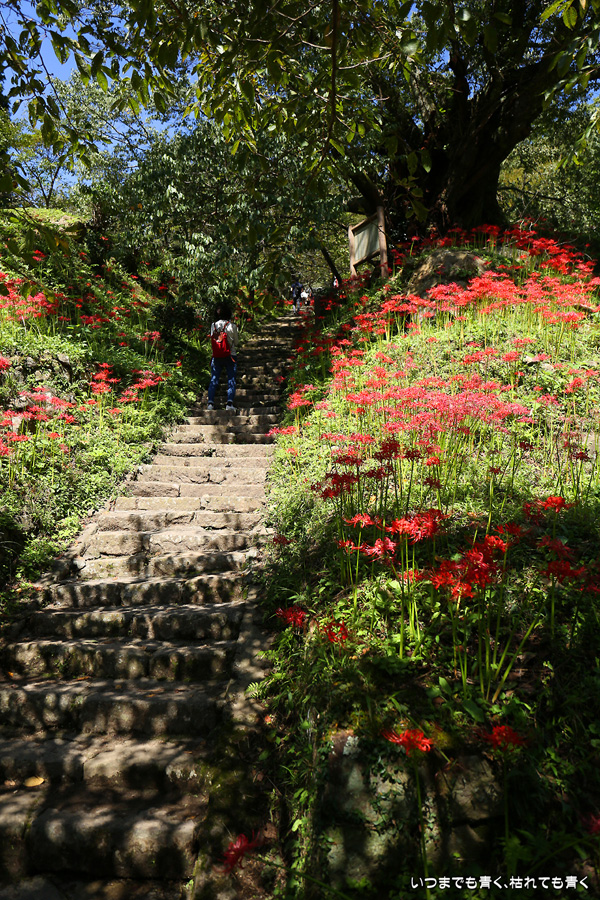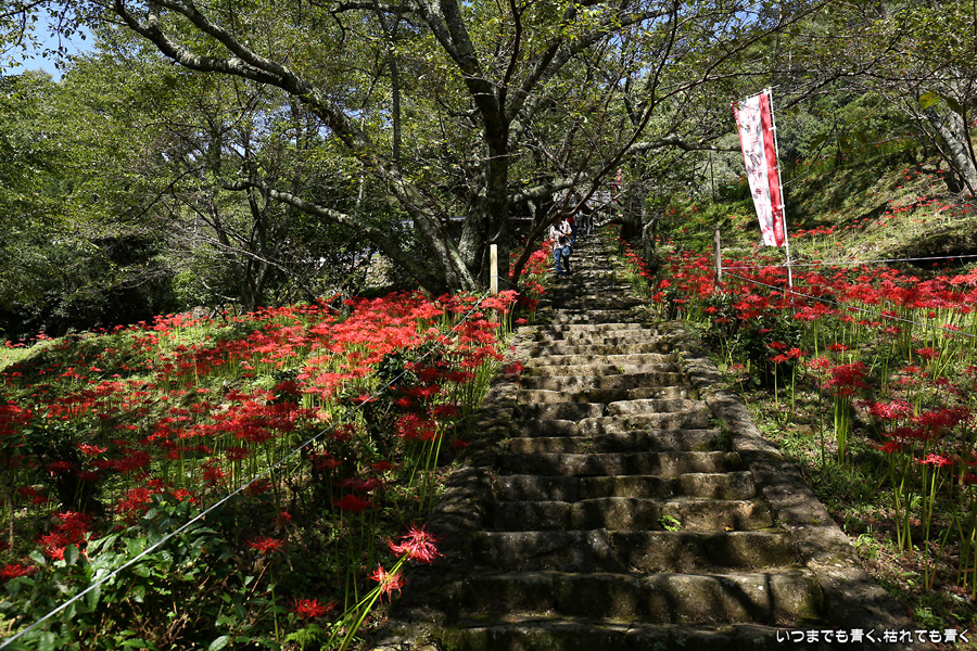 長い200段の石段も、彼岸花を見ながらならばあっという間で苦になりませんでした。5年前に鹿と猪の被害を受けて彼岸花の数が激減し、現在は県、市、ボランティアの方々の力によって植栽されているそうですが、維持はなかなか難しいようです。春は千年桜も有名です。