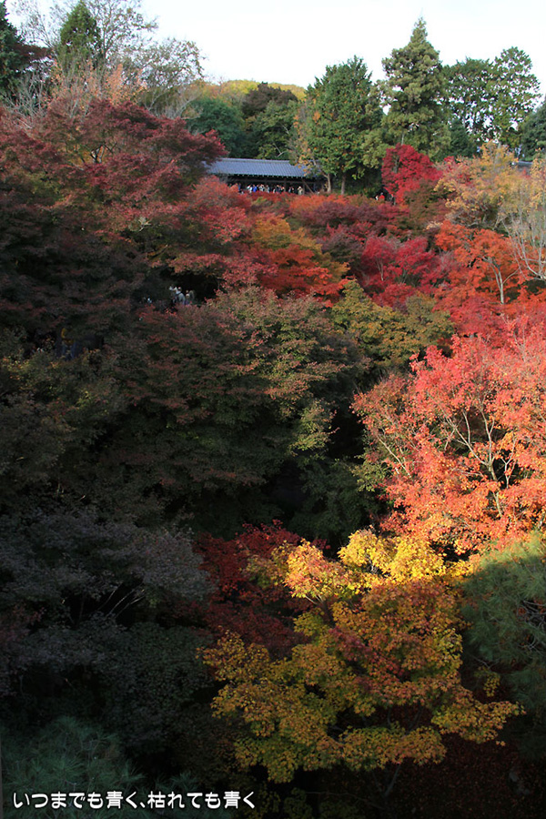 冬の京都、春の京都は何度か行きましたが、今年は秋の京都を楽しみたいとずっと思っていました。予定では、来週あたりが紅葉の見頃かなと思っていたのですが、インターネットで東山のモミジは見頃になっていると出ていたので、急遽、家族で出かけてきました。最初の東福寺は、「京の秋、モミジの通天橋」と言われるように、通天橋からの眺めと、通天橋とモミジの構図がとても素晴らしいところです。ここは過去にも何度か訪れたことがありますが、通天橋の拝観券を買うのに長い行列ができているのはこの時期ならではの光景でした。 真っ赤な紅葉の中の通天橋を期待して楽しみにしていたのですが、中に入るとまだ緑の葉も多くてやはり少し早かったようで、少しがっかりというのが正直な感想でした。それと、人がいっぱいで通天橋や下の庭園は歩くのがやっとという感じで、写真を撮るのも一苦労でした。写真は、あまり人をいれないように撮ったので、それほど人が多く感じないかもしれませんが。