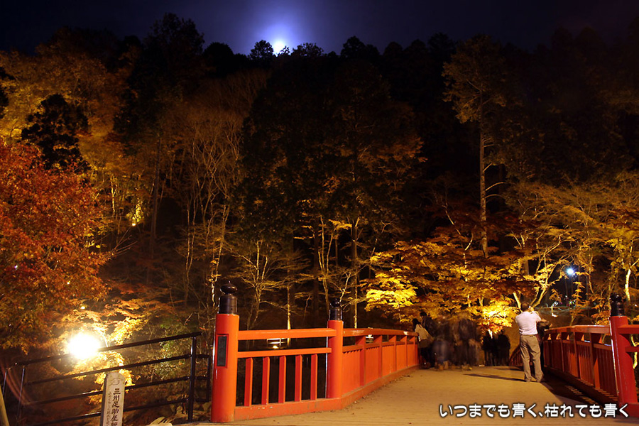 11月28日に仕事帰りにひとりで香嵐渓に行った時の写真を家族が見て「ぜひ行きたい!」というので、今日、仕事を早く切り上げて再び香嵐渓の紅葉ライトアップに行ってきました。今回は、標高254mの飯盛山にも登ってきました。けっこうきつかったですが、山頂で撮った、ライトアップを背景にした家族写真はとてもきれいに撮れました。ただ、ストロボ+スローシャッターでの撮影だったため、ストロボ発光のあと少し動いてしまったところは、背後のライトアップと人物が重なり面白い雰囲気の写真となりました。残念ながらその家族写真は掲載しておりませんが、途中で撮影した奥さんと娘たちの写真は一枚掲載しました。