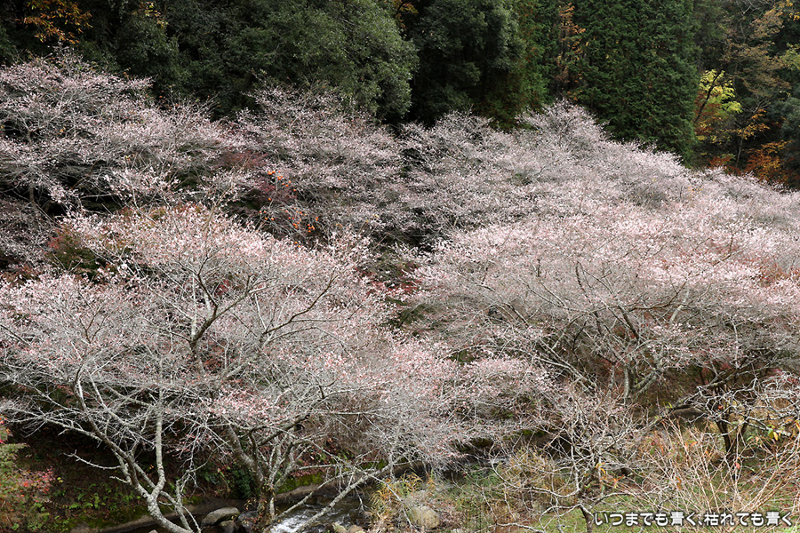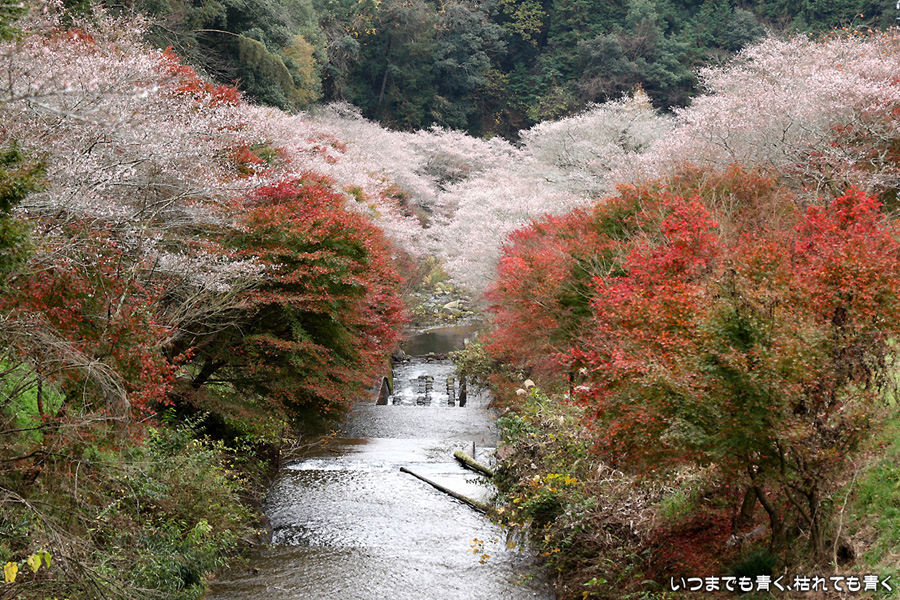 我が家から30km以上離れた市内、小原の四季桜を見てきました。昨年は渋滞に巻き込まれて少し手前の小原ふれあい公園までしかたどりつくことができませんでしたので、今年は朝早くから出発し川見四季桜の里を楽しんできました。今年は四季桜の開花は早くて、すでにもう散り始め。遠くから見るとピンクに見えますが、近くに行くと花がちらほら残っている程度という感じです。逆に紅葉は染まりきれずに赤と緑が混じったまま散り始めています。ピンクと赤の競演はまた来年に期待しましょう。