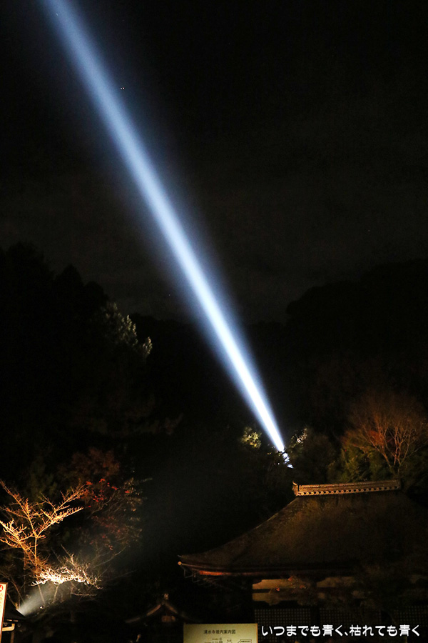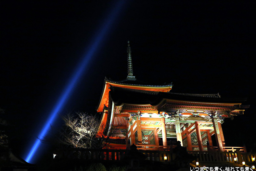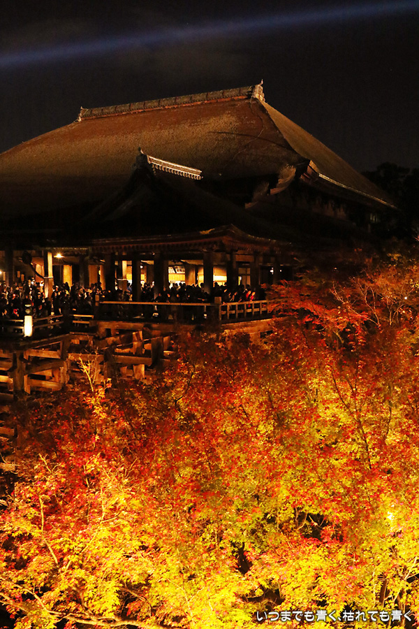 今年の秋の京都のしめくくりは、清水寺夜の特別拝観のライトアップです。清水寺の夜の拝観は、春、夏、秋と年三回行われていて、私は春の東山花灯路の時にけっこう来ているのですが、秋の紅葉の時期に来るのは初めてです。そもそも紅葉の時期は、嵐山、東福寺や南禅寺近辺に行くことが多いので、どうしても清水寺は来る機会が減ります。夜なので紅葉の色づき具合はわかりませんが、本堂の舞台からみるライトアップされた紅葉、奥の院から見るライトアップされた清水の舞台は、とても美しいものです。観音様の慈悲の心を表している青い光の筋が幻想的で、朱色の仁王門や三重塔、ライトアップでオレンジ色に染まる清水の舞台とよく合います。