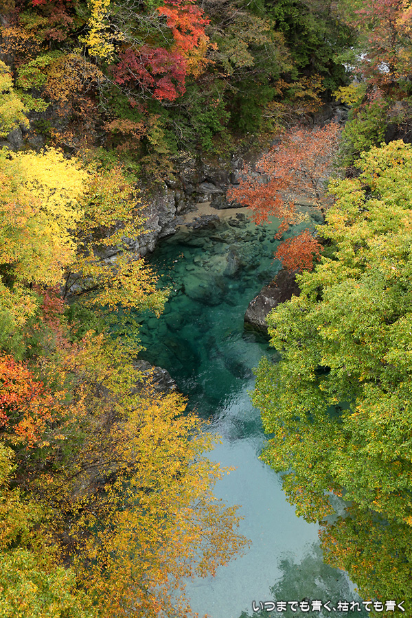 今年の最初の紅葉狩りは岐阜の山奥へ向いました。最初は付知峡です。家を出るときは日が出ていたのに、付知峡は雨。久しぶりの晴れた休日だったのに、あえて雨降る場所に行くことになってしまいました。紅葉よりもコバルトブルーの川が美しくて、そちらに見入ってしまいました。