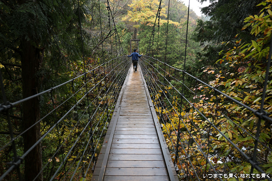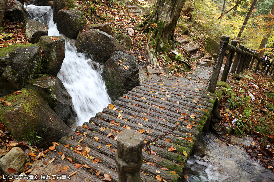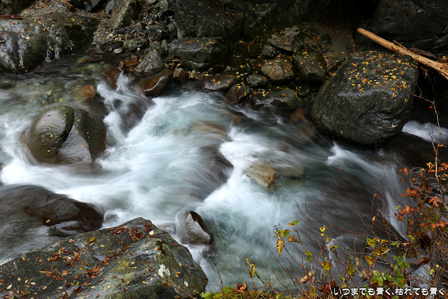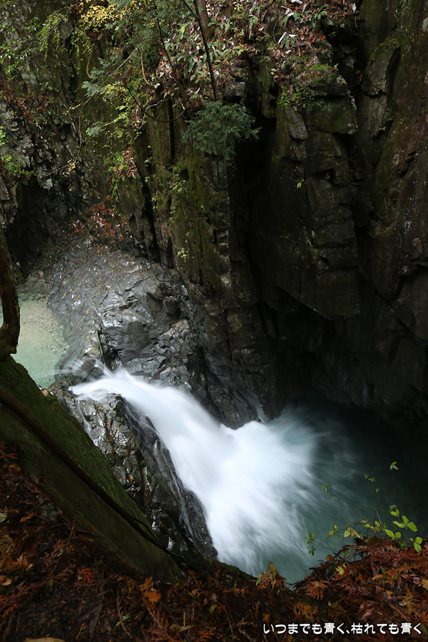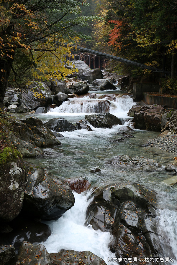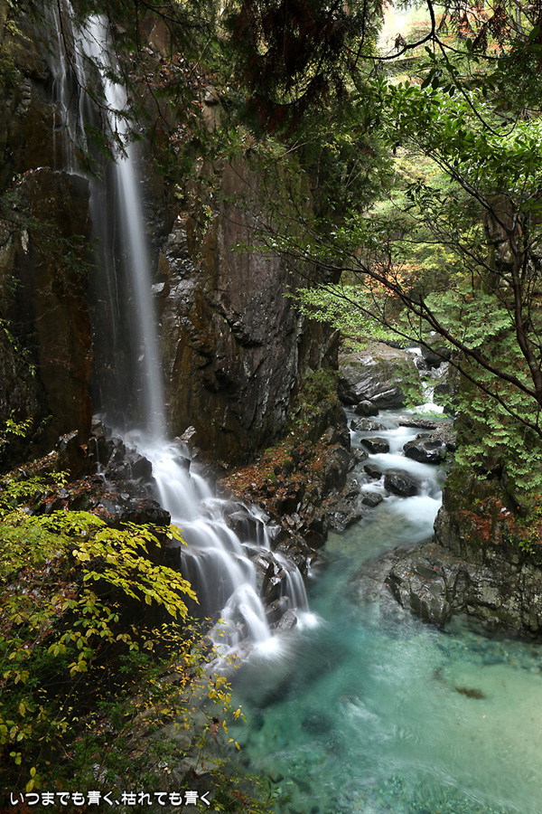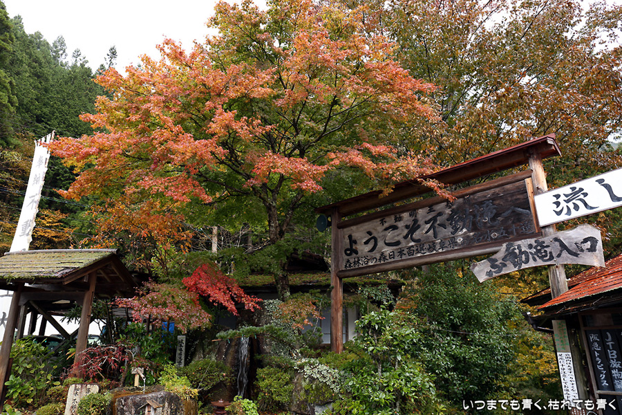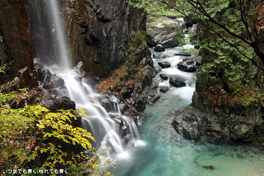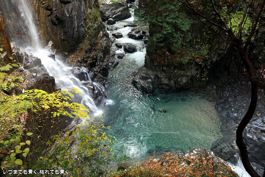 次は、付知峡不動滝に来ました。不動滝、観音滝、仙樽の滝の三滝があり、一番落差のあるのは観音滝ですが、観音滝は水路から水を流しているようで人工滝のようでした。そのせいか、観音滝の名前はあまり表面に出ず、不動滝と観音滝を合わせて不動滝と呼んでいるようです。コバルトブルーの滝つぼを眺めながら水の音を聞いていると、心落ち着きます。滝のまわりの紅葉はまだちょっと早めで、紅葉の写真というより滝の写真という趣です。