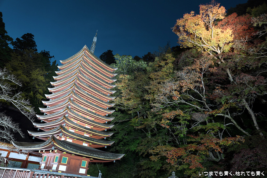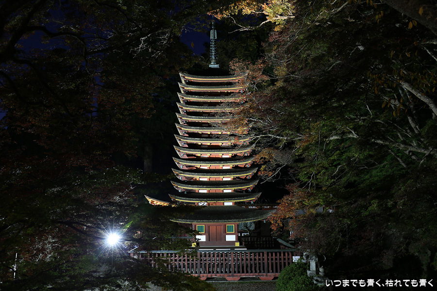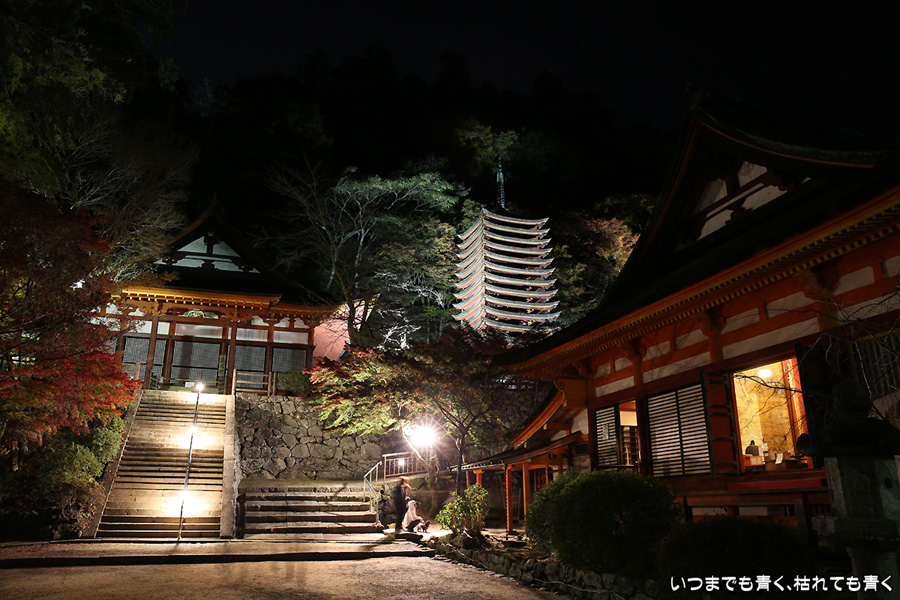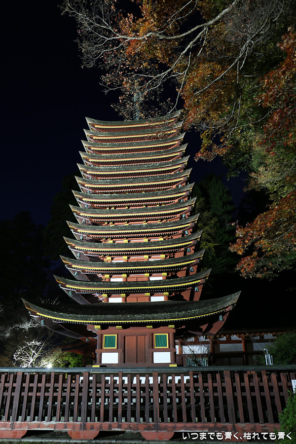 帰りにもう一度談山神社に寄って紅葉ライトアップを楽しんできました。永観堂や大覚寺などと違い、ここは永源寺と同じく昼の拝観券で夜も入ることができるので親切です。十三重搭は光があたり美しいですが、紅葉には光が少なくて紅葉のライトアップという観点ではイマイチかなと感じました。
