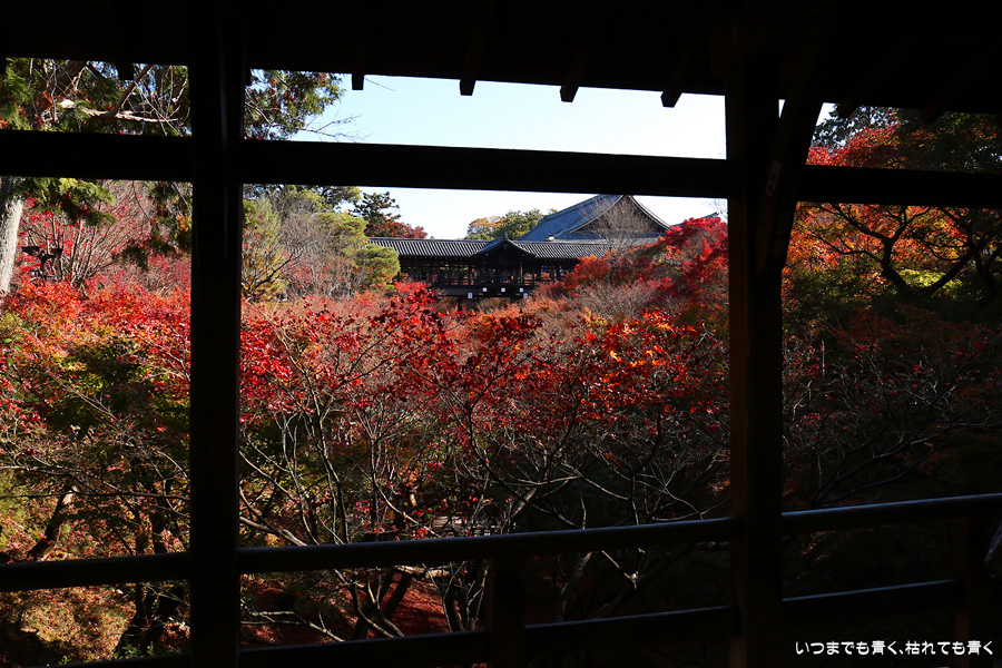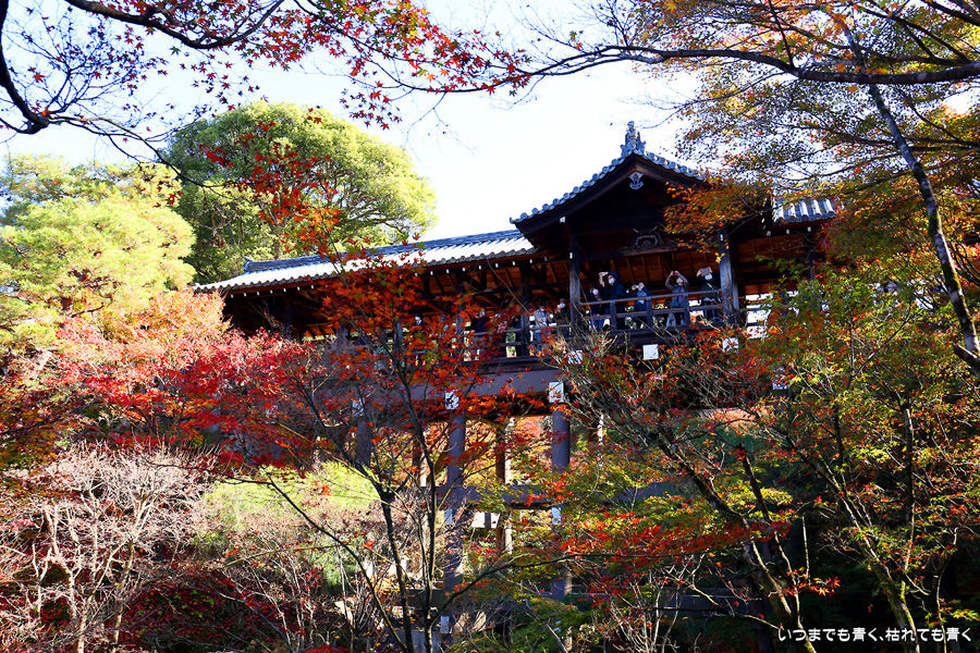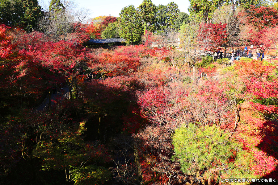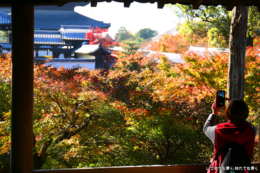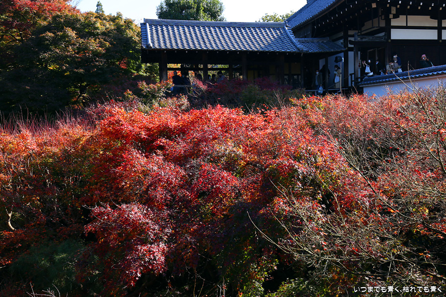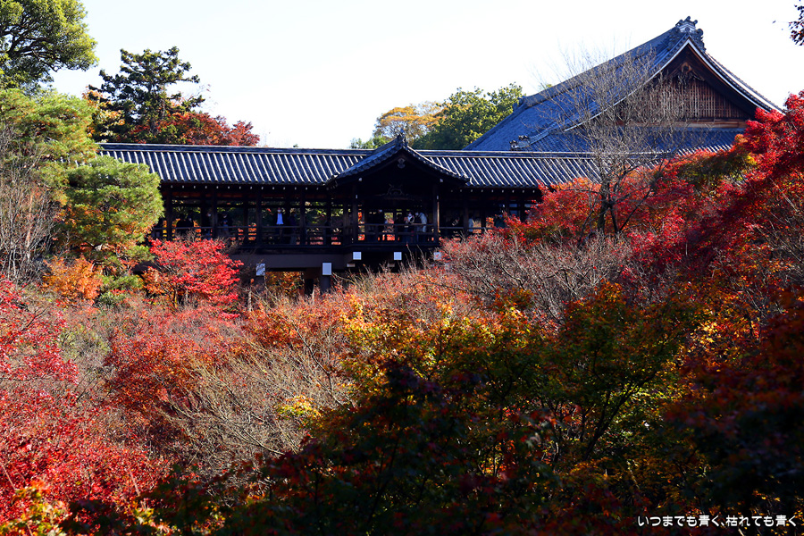 今回の京都3日間紅葉めぐりは、人の少ない穴場めぐりだったのですが、東福寺は何度も来ているのに最近は2015年から来ていないとわかって、どうしても東福寺の紅葉を見たくて混雑覚悟でやってきました。しかし、通天橋で人のいない写真が撮れるほど人が少なくて、嬉しい誤算でした。少し見ごろの時期が過ぎている感じはしますが、さすがに東福寺の紅葉は圧巻です。