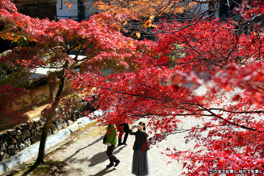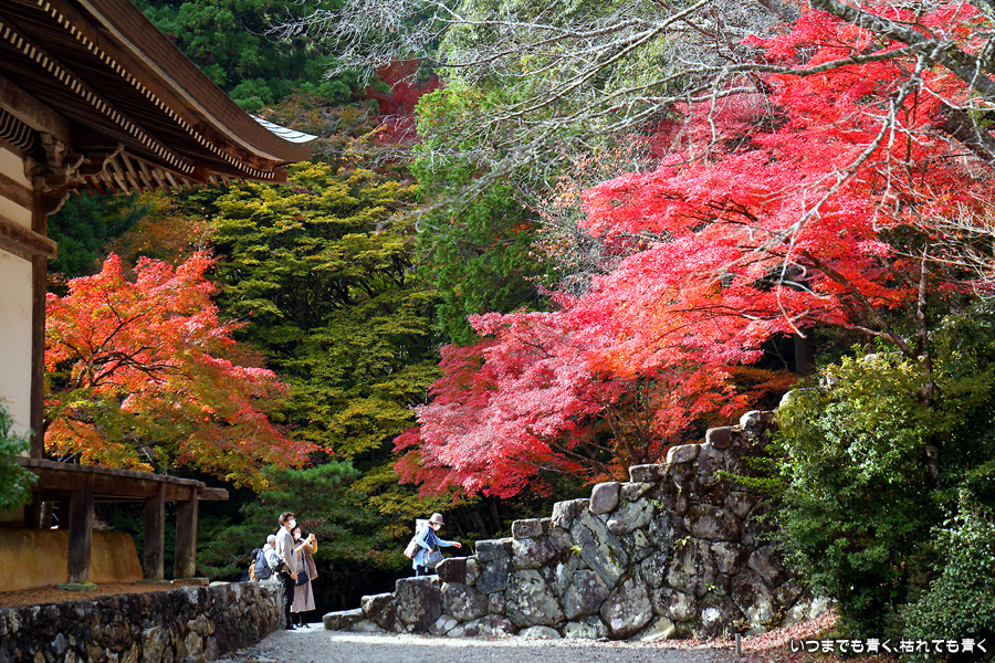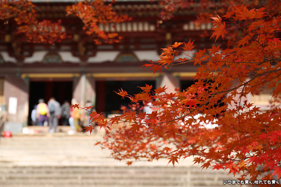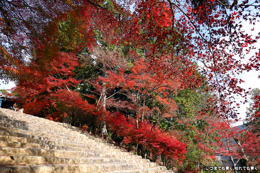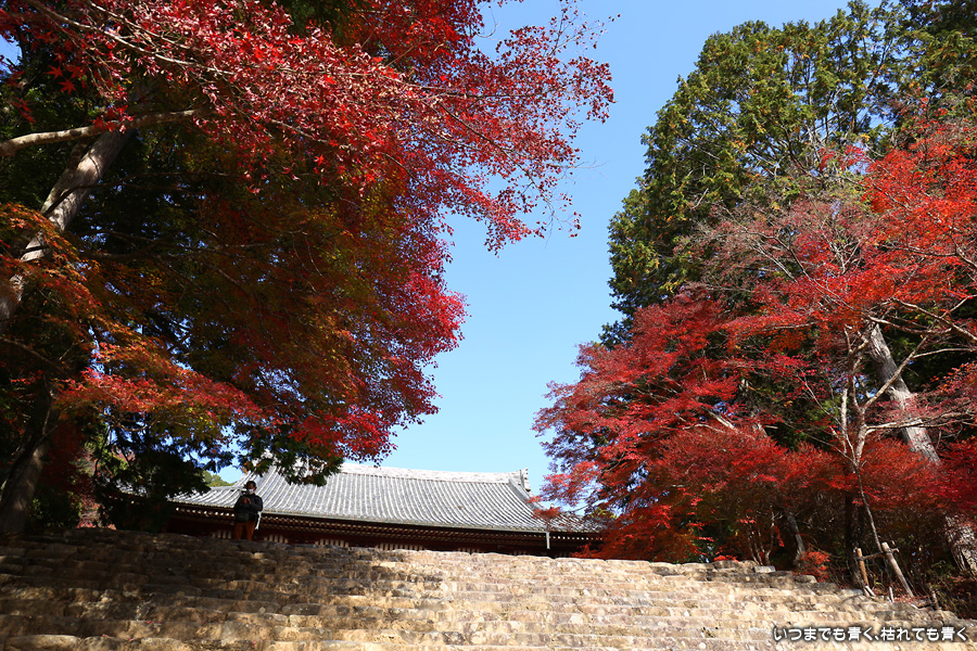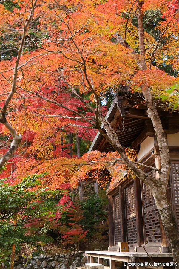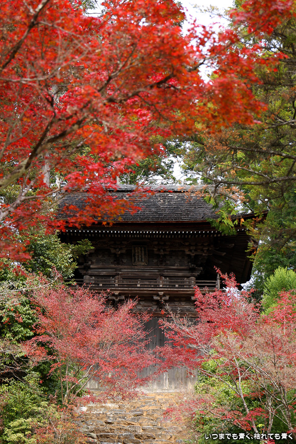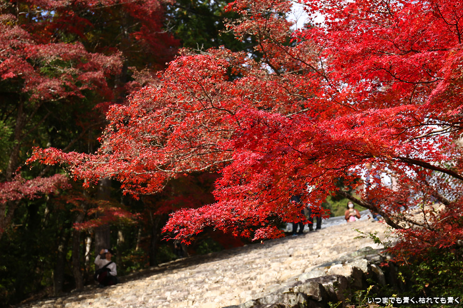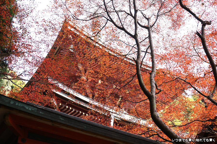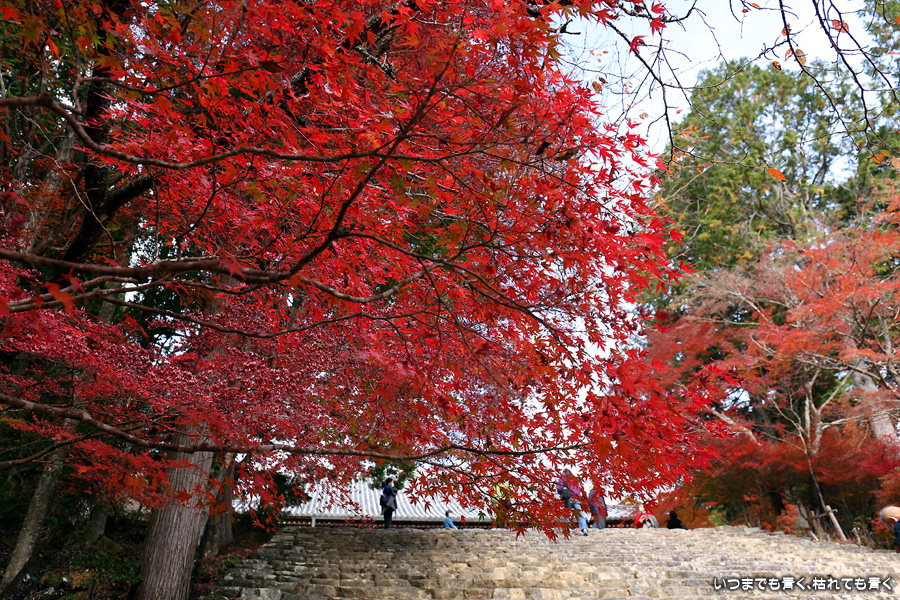 神護寺は5年ぶりになりますが、今回は紅葉が一番美しいのではないかと思える時期に来ることができました。長い時間いても飽きることなくいろんな構図を捜しながら写真を撮っていました。自己満足できる写真も多くて充実した時間を過ごすことができました。ただ、金堂まわりの撮影にあまりにも夢中になりすぎ、地蔵堂の方に行くのを忘れてしまいました。地蔵堂まわりの紅葉を見忘れただけではなく、今回もまた「かわらけ投げ」をせずに帰ってきてしまったことになります。「かわらけ投げ」は次回の楽しみに残しておくことにします。写真の最後の4枚は、楼門からの境内ではなく参道での写真です。