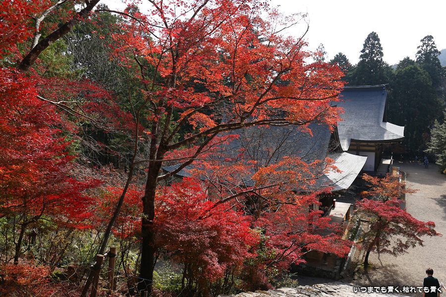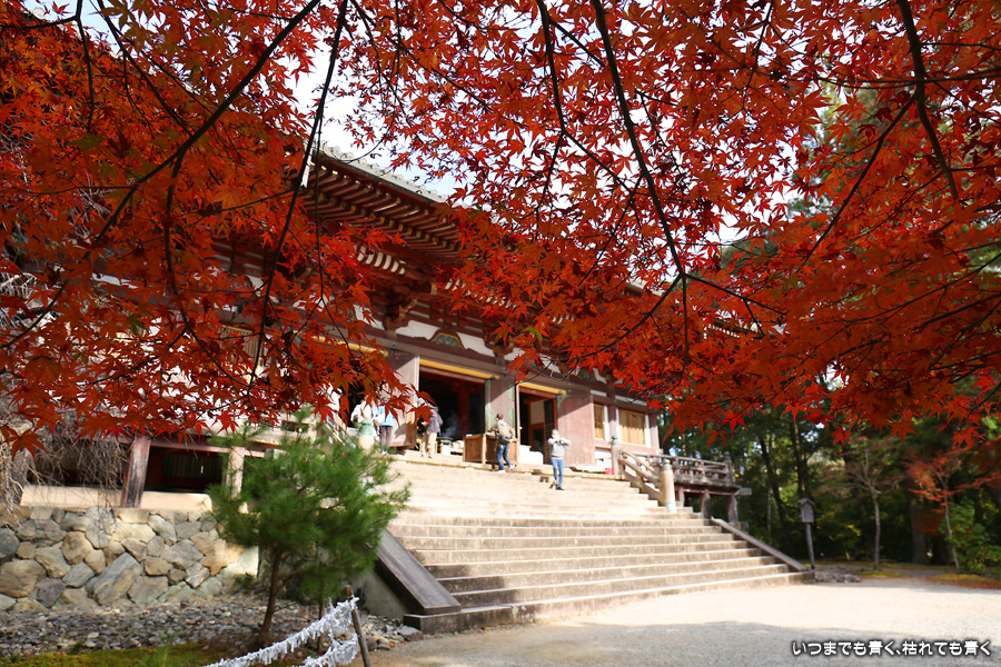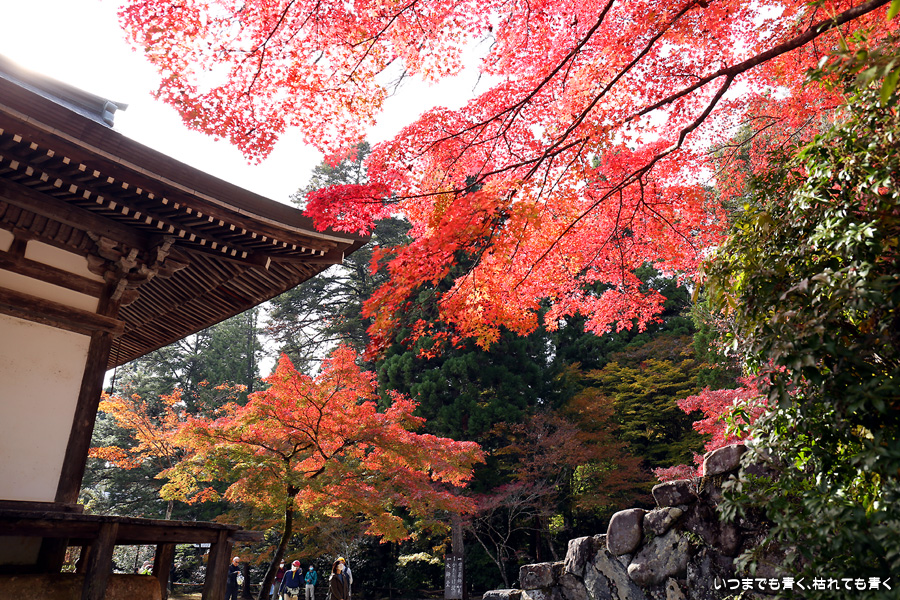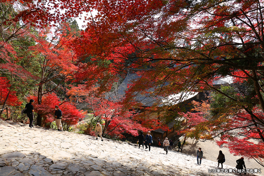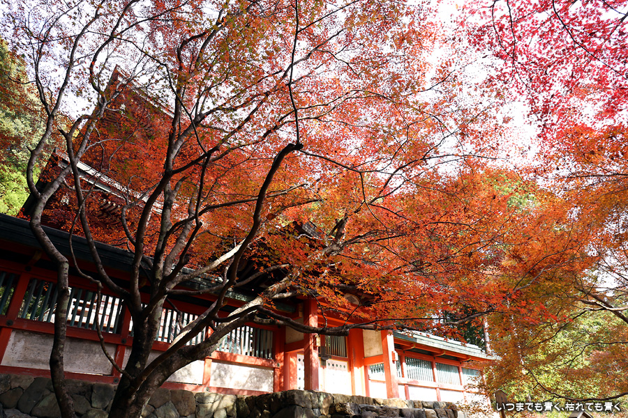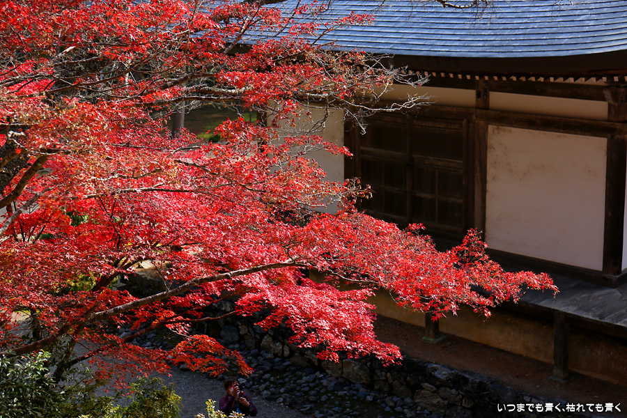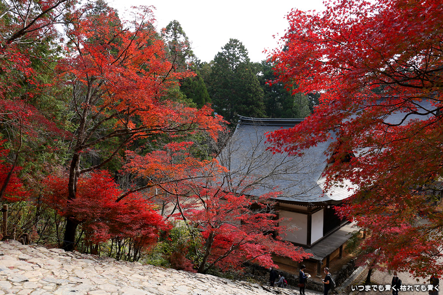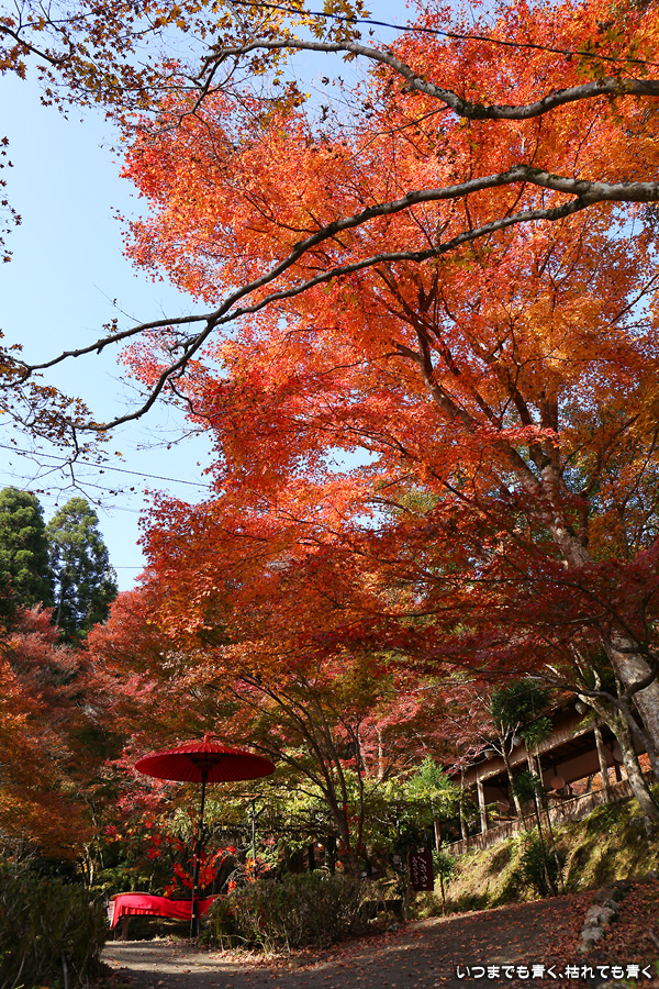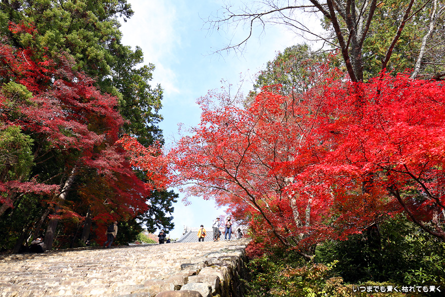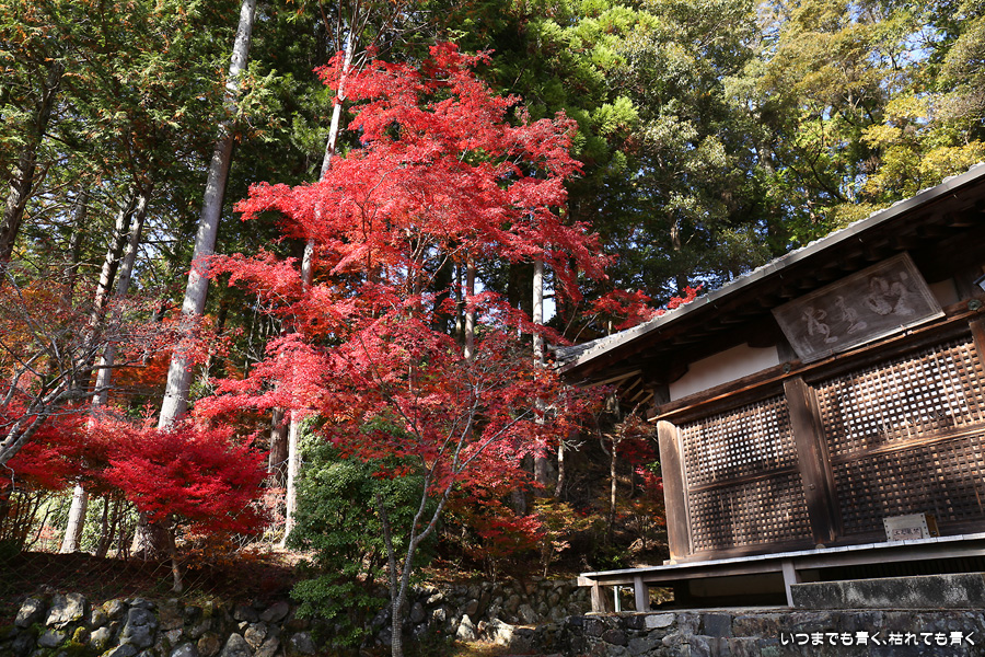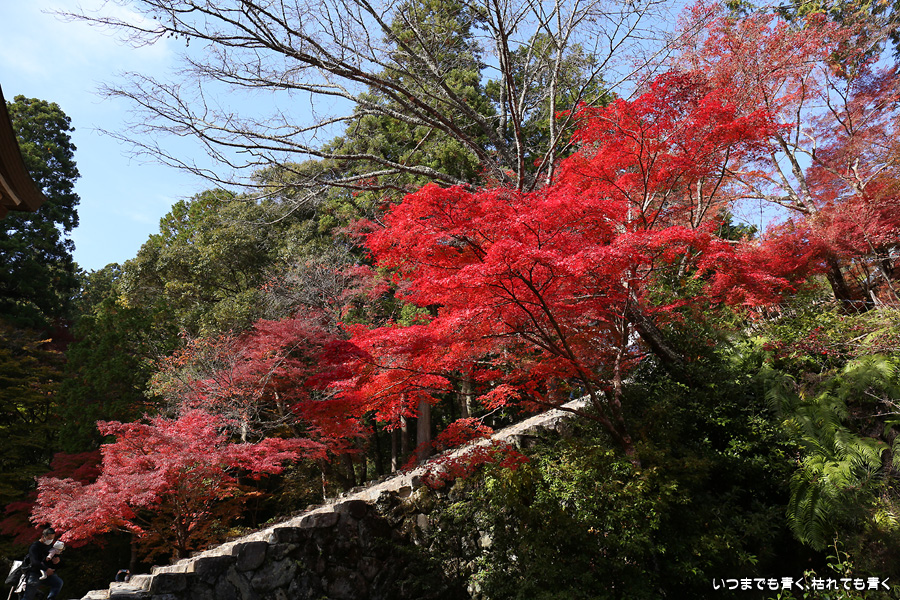 神護寺は5年ぶりになりますが、今回は紅葉が一番美しいのではないかと思える時期に来ることができました。長い時間いても飽きることなくいろんな構図を捜しながら写真を撮っていました。自己満足できる写真も多くて充実した時間を過ごすことができました。ただ、金堂まわりの撮影にあまりにも夢中になりすぎ、地蔵堂の方に行くのを忘れてしまいました。地蔵堂まわりの紅葉を見忘れただけではなく、今回もまた「かわらけ投げ」をせずに帰ってきてしまったことになります。「かわらけ投げ」は次回の楽しみに残しておくことにします。写真の最後の4枚は、楼門からの境内ではなく参道での写真です。