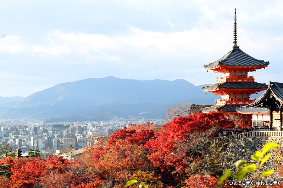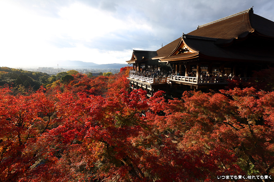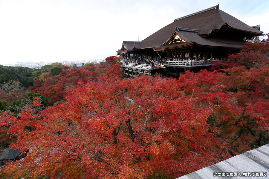 清水寺の紅葉はライトアップしか見たことがなく、今回は昼間の清水寺の紅葉を見たくてやってきました。想像以上にボリューム感あって色鮮やかで迫力のある紅葉で圧倒されました。人が多いため、ベストポジションをゆっくりと探して撮影するということはできませんでしたが、そんな細かいことはどうでもよくなるくらい素晴らしい紅葉でした。