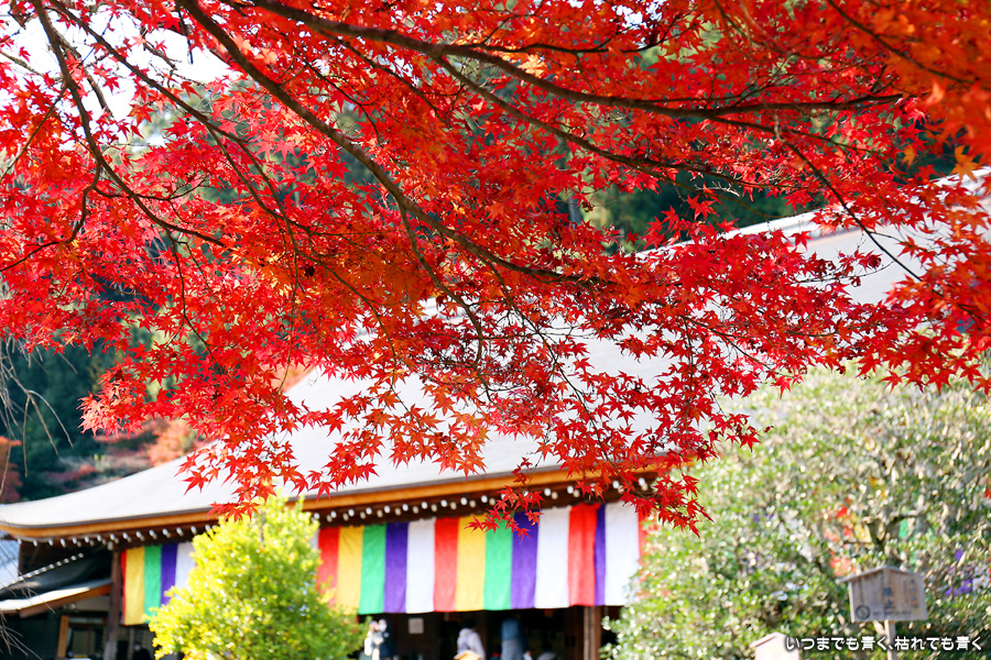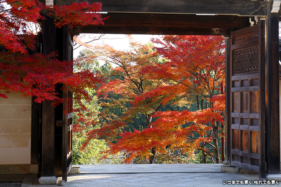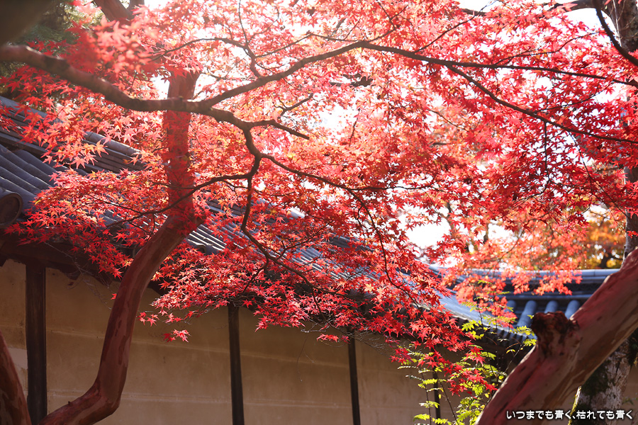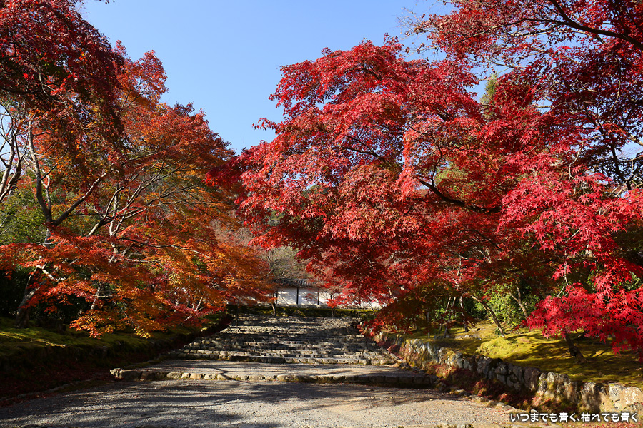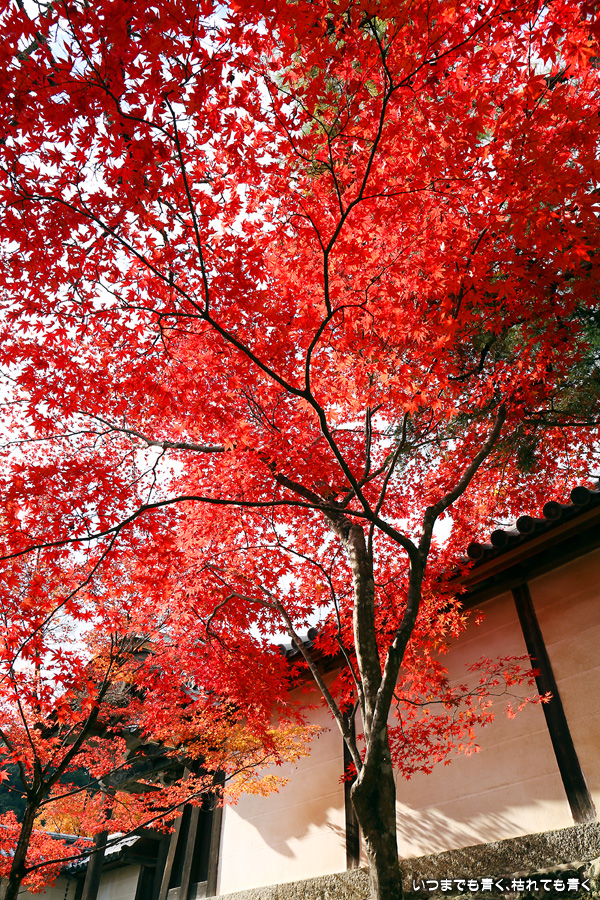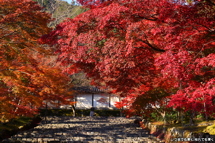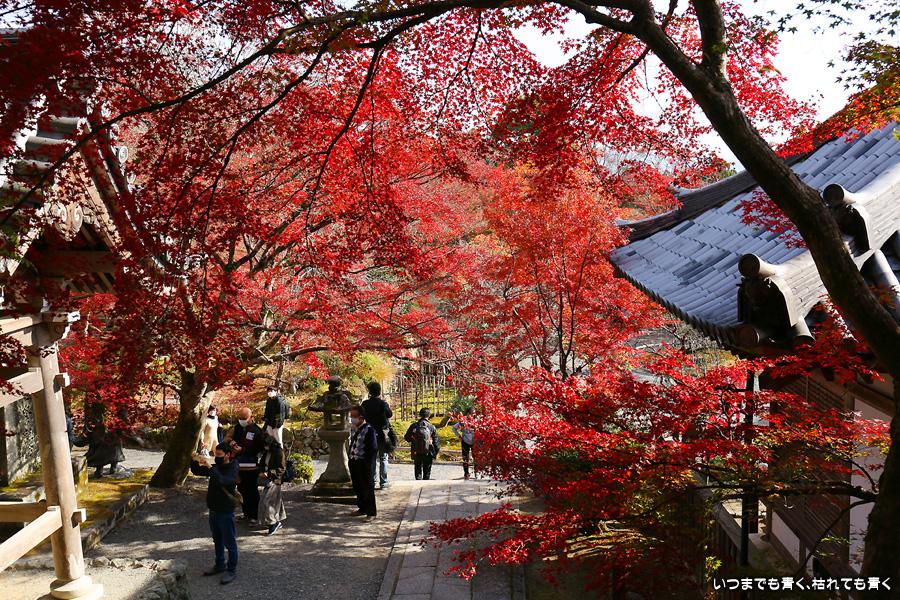 朝一番で人の少ない時に「紅葉の馬場」の写真を撮ろうと思って行きましたが、すでに人は途切れることはなく持久戦となりました。待ったわりには写真としてはありきたりでしかなく、自分なりの構図を探すべきだということをあらためて認識しました。二尊院の紅葉は何度も見に来ていますが、今年もとても素晴らしい紅葉でした。本堂では、のんびりと縁側に座って紅葉を眺めることもできます。