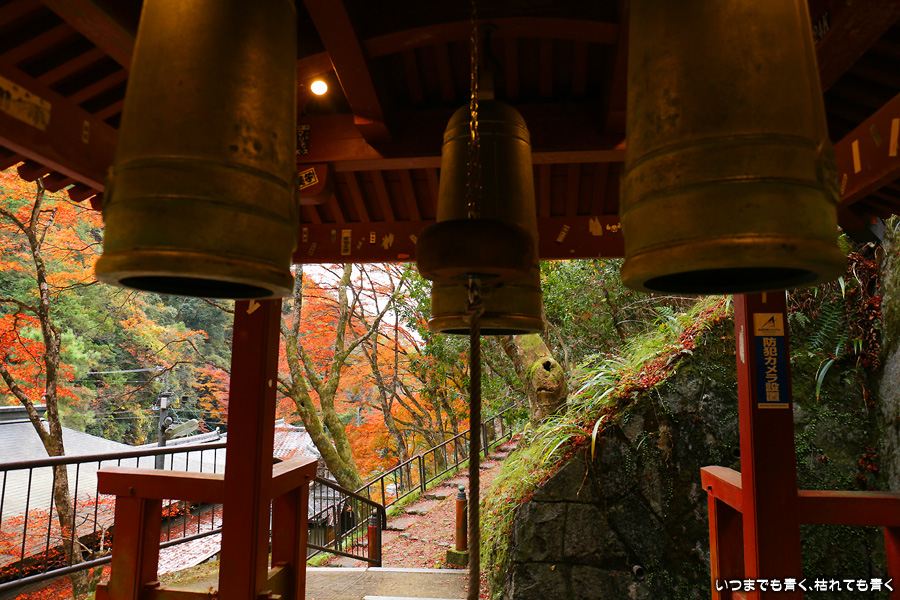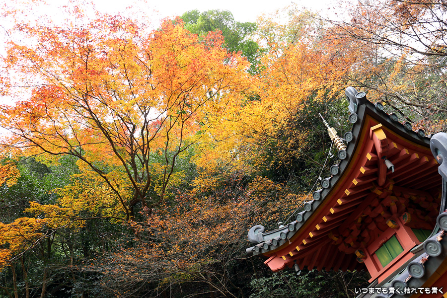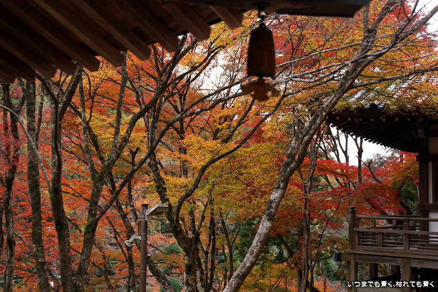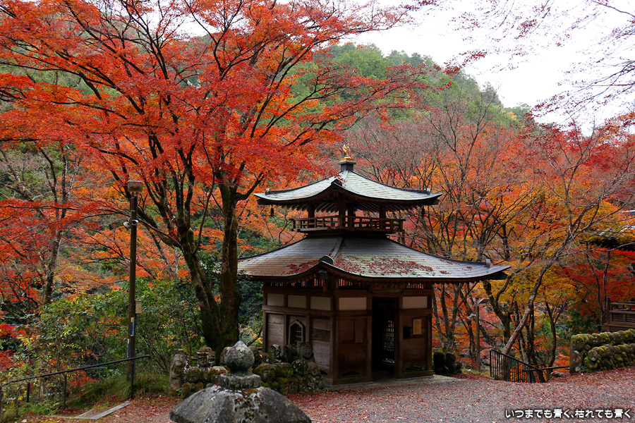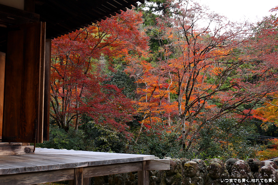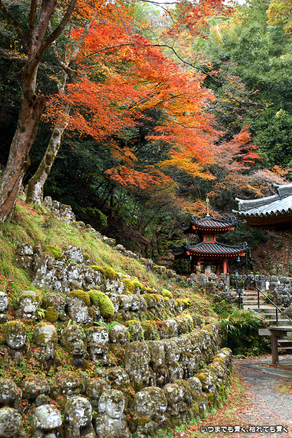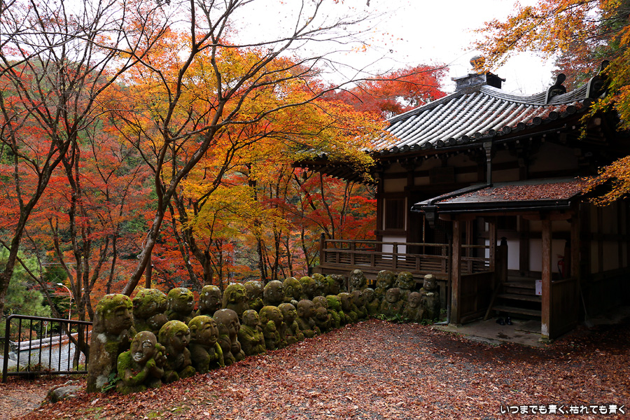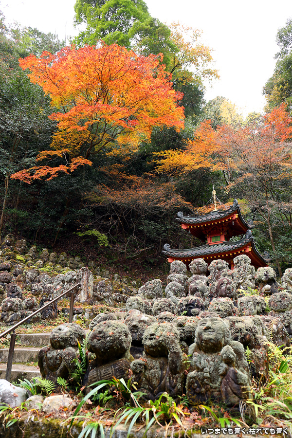 化野念仏寺からさらに奥に入るとあるのが愛宕念仏寺で6年ぶりの訪問となります。このお寺も1時間サスペンスドラマでよくロケ地となっていたお寺です。ここの紅葉は真っ赤ではなく黄色やオレンジ色ですが、数多くの羅漢の石像、本堂、多宝塔、ふれ愛観音堂、地蔵堂とよく似合います。