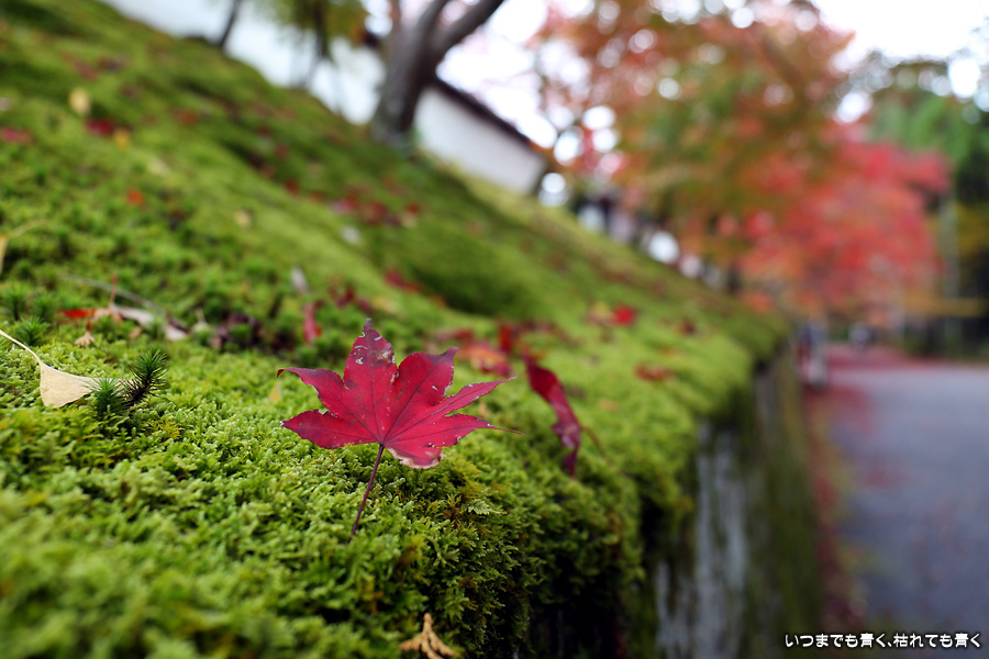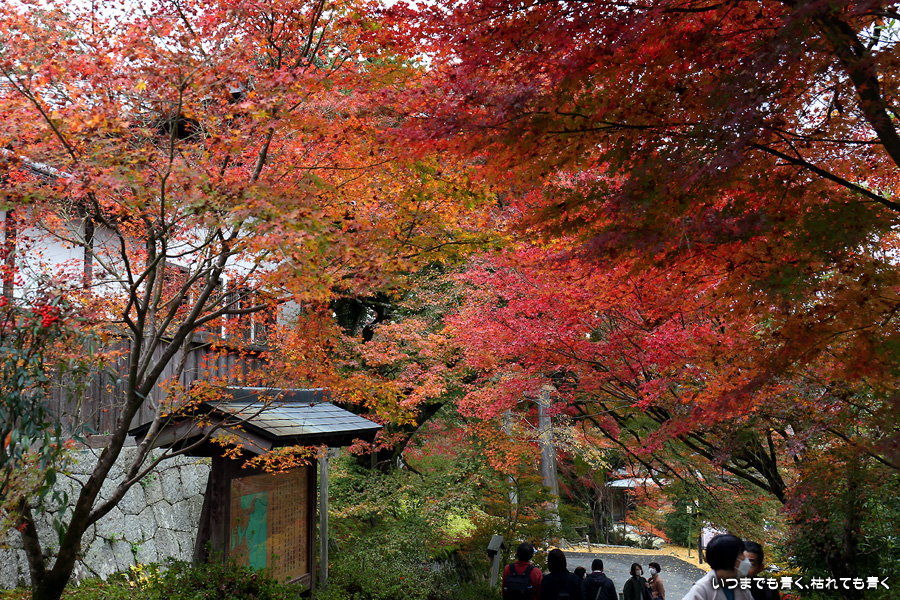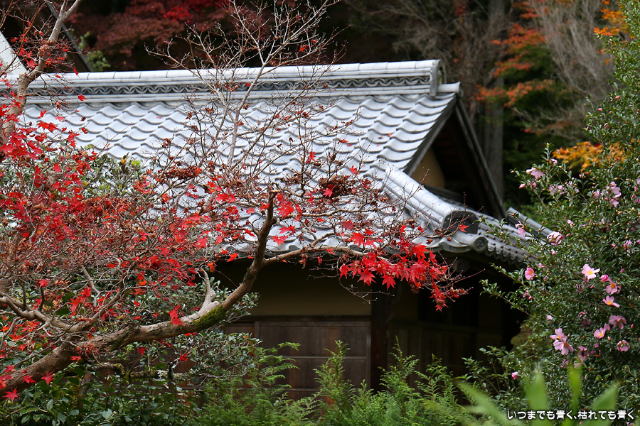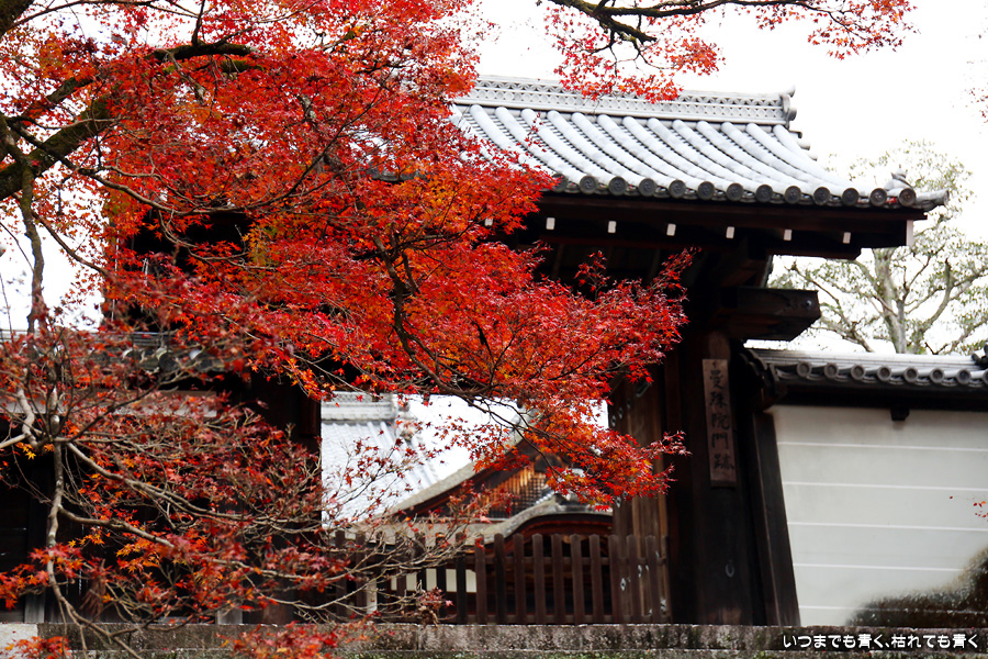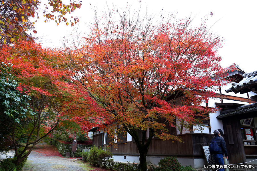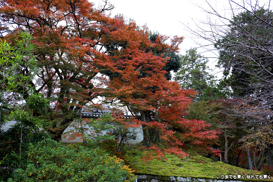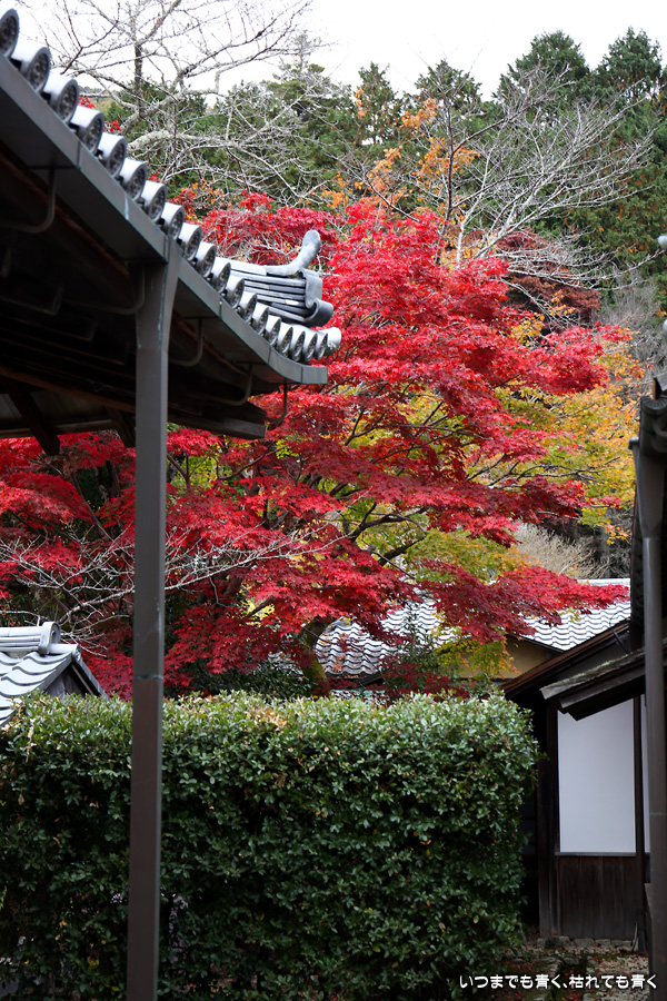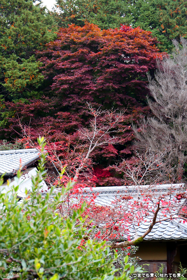 4年ぶりの曼殊院ですが、その時と大きく変わっているのは、今まで梅林があったところに新しい宸殿ができて、その前には「盲亀浮木之庭」と呼ばれる広い石庭ができていることでした。大玄関から大書院に向かう斜めの通路もなくなっていました。書院前の庭園は今まで通りですが、宸殿の方はかなり以前の雰囲気とは異なっています。宸殿は150年ぶりの復興再現だそうです。ちなみに宸殿とは門跡寺院にある歴代天皇・皇室関係者の位牌を祀る施設です。紅葉は見頃でしたが天候がよくないので華やかさよりも落ち着いた雰囲気の紅葉でした。
