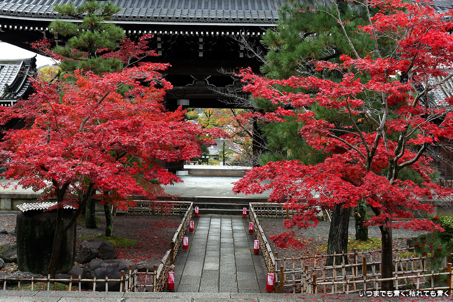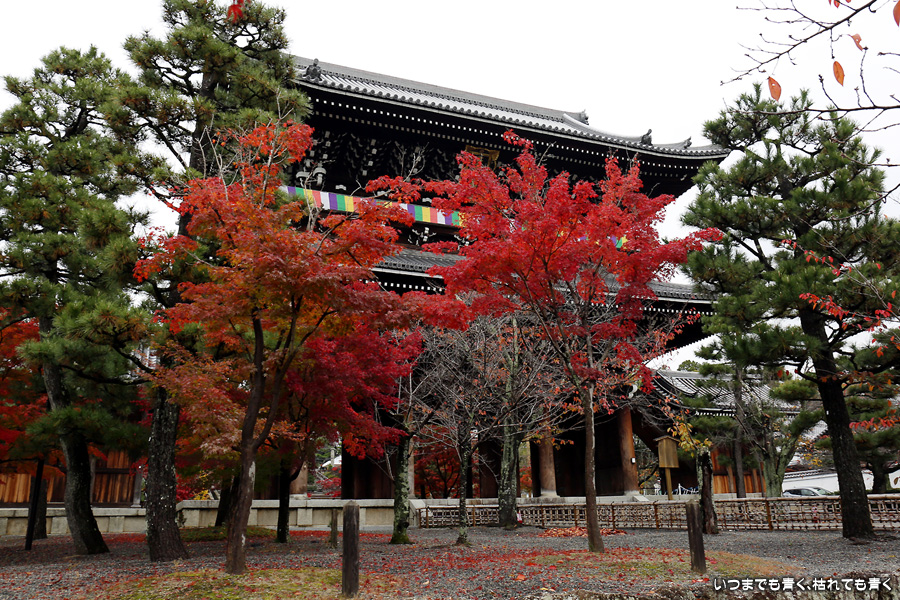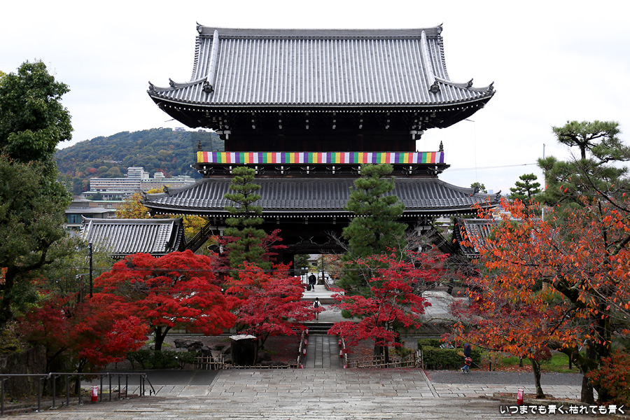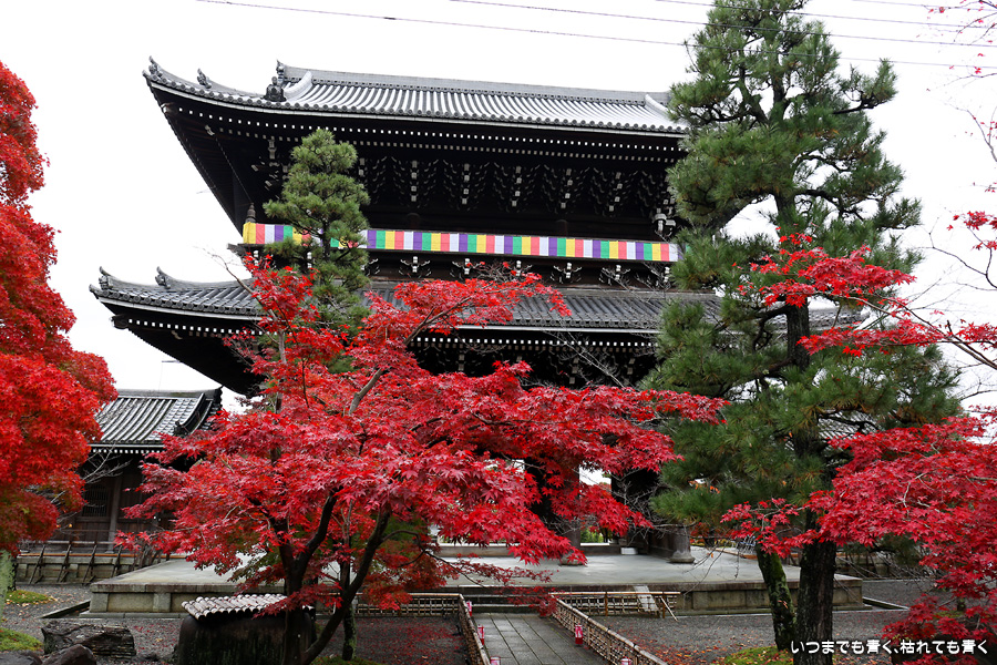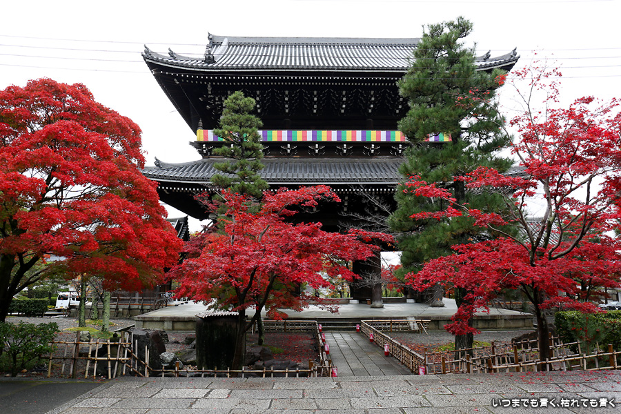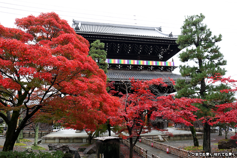 秋の京都ぶらりひとり旅の二日目は、金戒光明寺の駐車場に車を置いて徒歩で寺社を巡ることとします。金戒光明寺には紅葉の美しい庭園もあるのですが、今回も山門近辺の紅葉見学のみとしました。山門周りの紅葉は真っ赤に美しく染まっていて山門と紅葉が絵になります。ただ、電線がどうしても入ってしまう構図にせざるを得ない場合もあって、山門近くの電線だけは無くせないものだろうかといつも思ってしまいます。