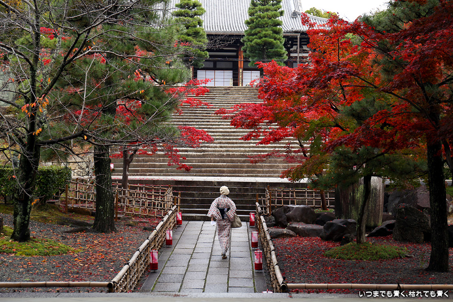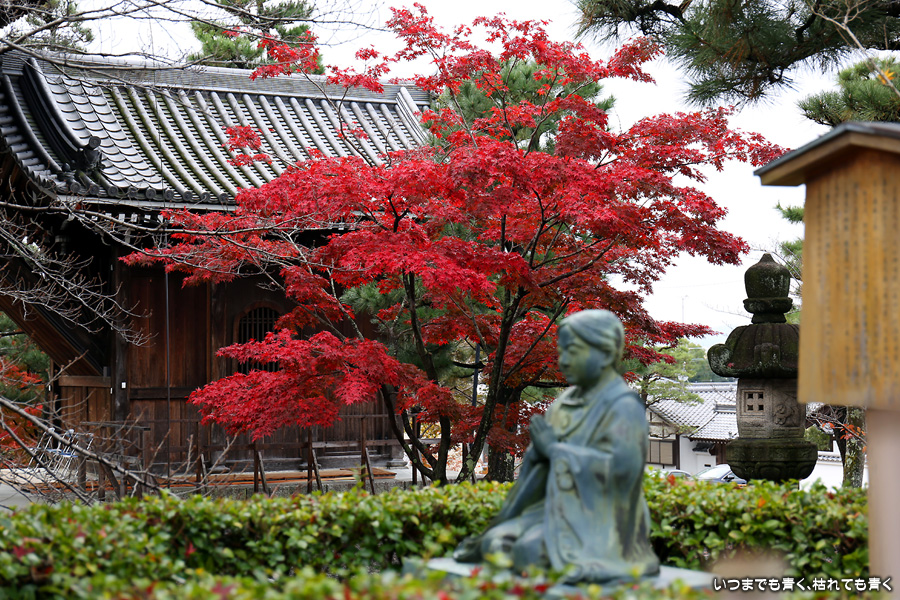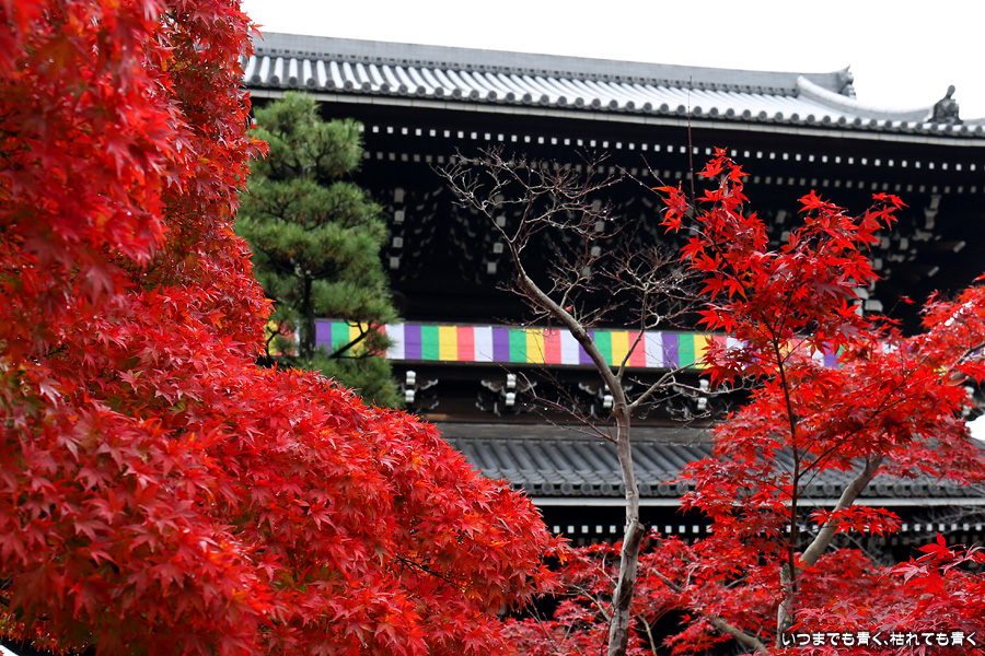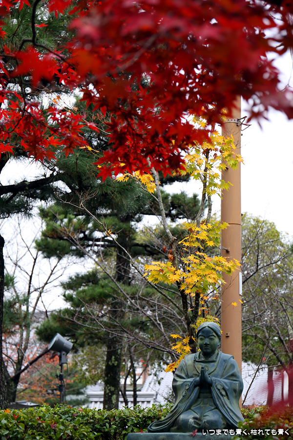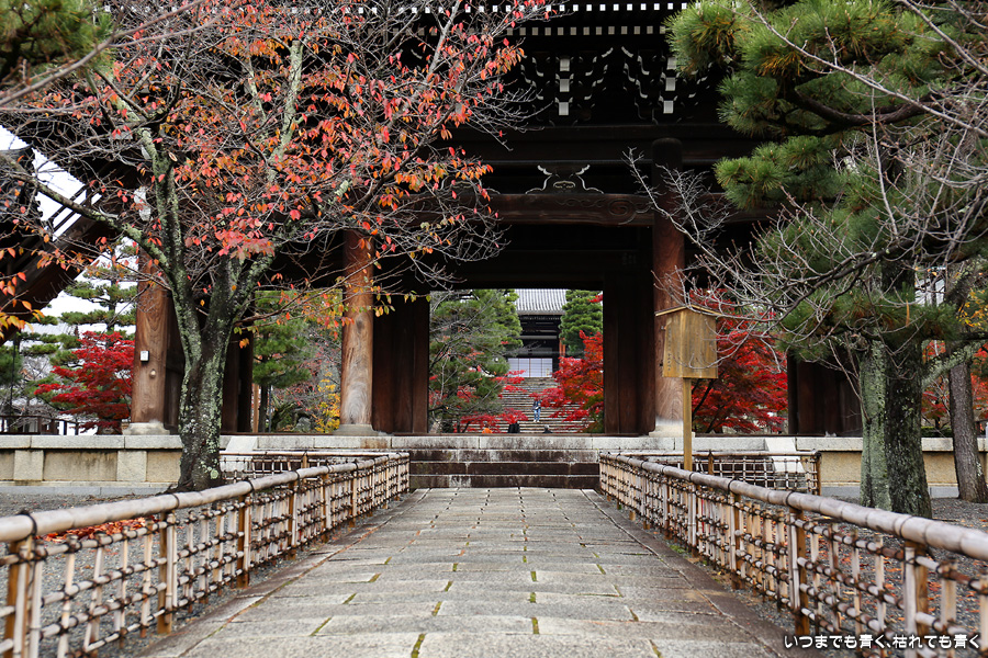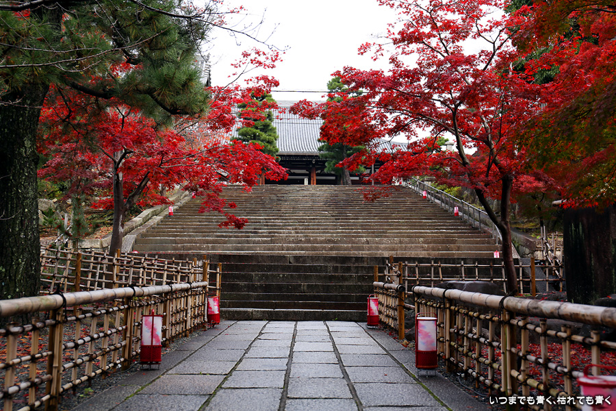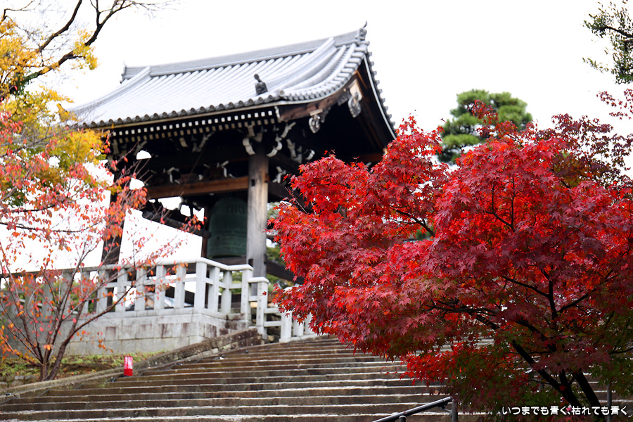 秋の京都ぶらりひとり旅の二日目は、金戒光明寺の駐車場に車を置いて徒歩で寺社を巡ることとします。金戒光明寺には紅葉の美しい庭園もあるのですが、今回も山門近辺の紅葉見学のみとしました。山門周りの紅葉は真っ赤に美しく染まっていて山門と紅葉が絵になります。ただ、電線がどうしても入ってしまう構図にせざるを得ない場合もあって、山門近くの電線だけは無くせないものだろうかといつも思ってしまいます。