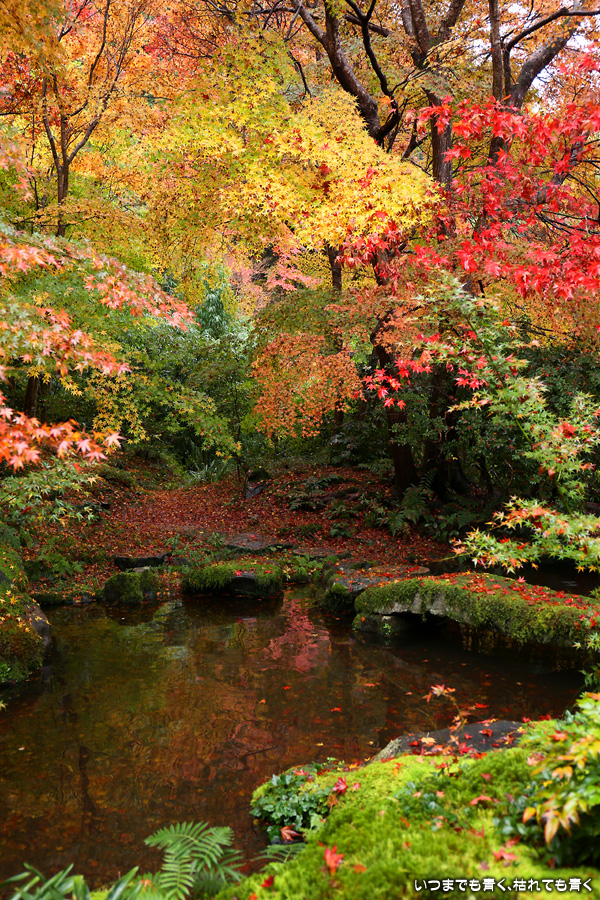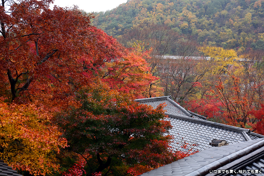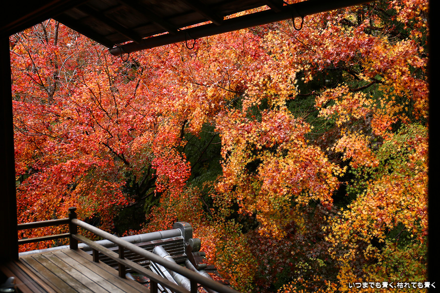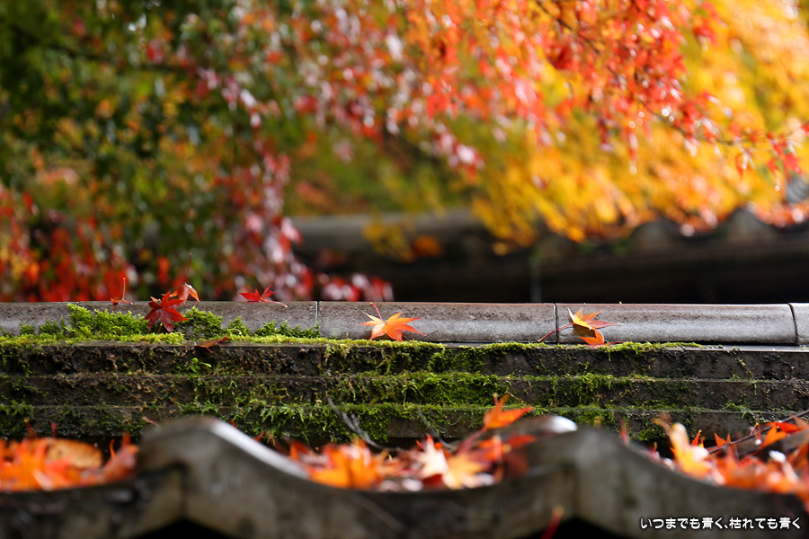 瑠璃光院は、コロナ以前から予約制であったことと拝観料が2,000円と高いということで、なんとなく「見せてやる」というような高飛車的なイメージを持っていました。なので今年も最初は行くつもりなかったのですが、5泊6日京都ぶらり旅の出発日前日の11月19日時点でちょうど真ん中の11月23日が本降り雨予報でどうしようかと考えた時に、瑠璃光院ならば室内だし行ったことがないので行ってみるのもいいかということで拝観を決めました。すぐに予約を調べると、23日は祝日ながら天気予報が良くないせいか13時にまだ空きがあり予約もできました。そういう経緯で拝観した瑠璃光院ですが、思っていた以上にとても良かったです。どこからも絵になる情景ばかりで眺めて写真を撮っていたらあっというまに1時間は経ってしまいます。ただ、時間制でも追い出されたりすることはなく、ゆったりと楽しむことができました。真面目な私は長居はよくないと思って後ろ髪引かれる思いで出てきましたが、もう少し長居をさせていただいて構図をいろいろと考えればいい写真が撮れたかもしれません。特に雨に濡れた庭は風情を感じられて素敵でした。また、机に映り込む有名な写真の撮影は、私が撮った位置よりももう少し下から撮るのが正しかったようです。お寺の方の対応は、事前に勝手に抱いていた高飛車的な対応とはまったく異なり、とても丁寧で親切でした。たぶん、来年から瑠璃光院ははずせない場所になりそうです。