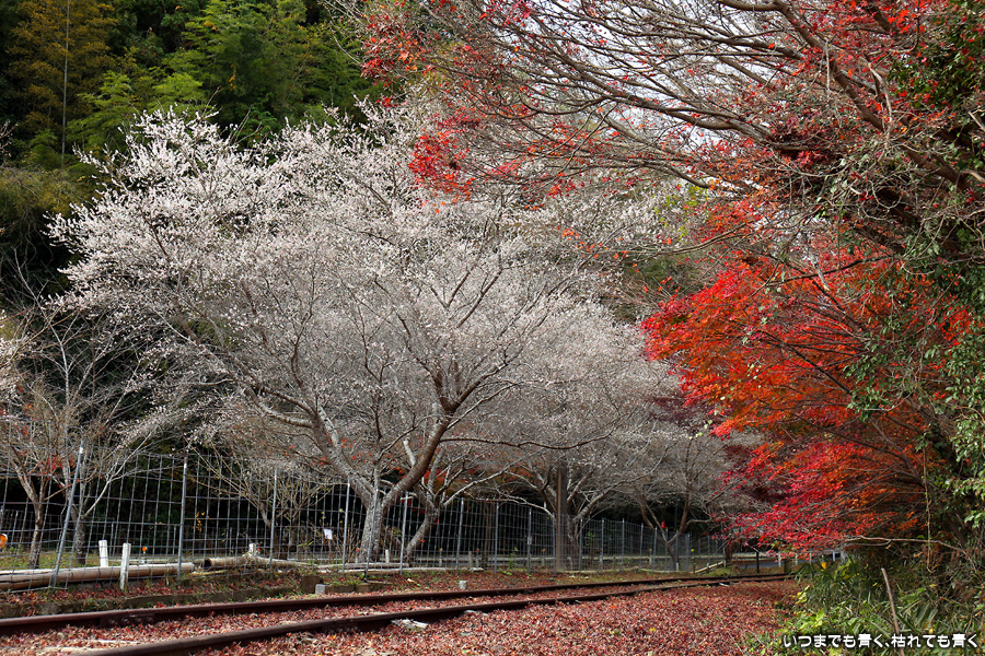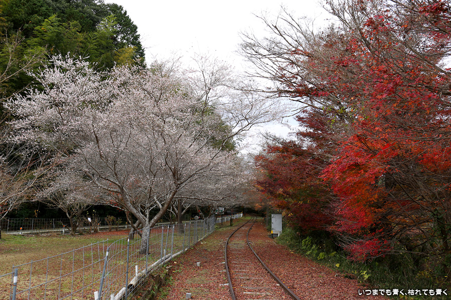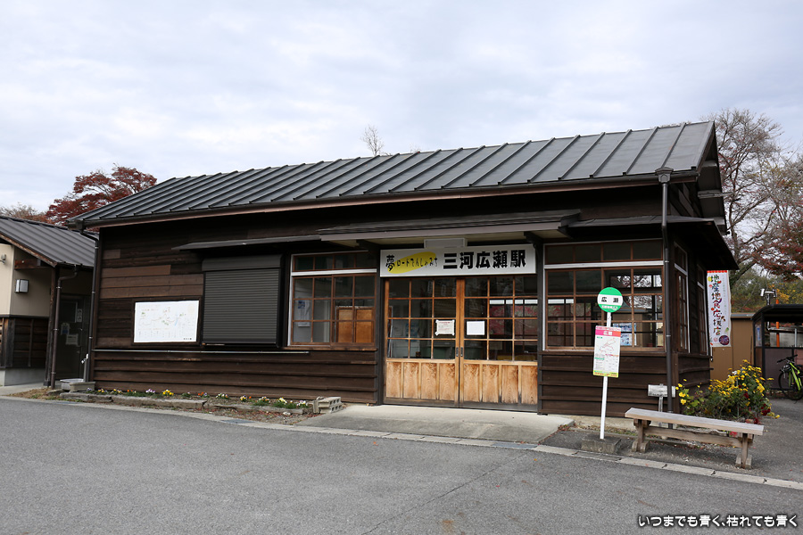 名鉄三河線は、山線(知立駅から北側)、海線(知立駅から南側)で一部廃線となっています。山線は猿投駅〜西中金駅間が1990年に電車からレールバス(気動車)に変更、2004年に廃線となっています。三河広瀬駅は、その中の中間駅となります。廃線跡は分断されていますが、三河広瀬駅の両端は踏切だったところを除きまだ線路が残っていて、今でも列車が走って来そうな雰囲気があります。三河広瀬駅周辺は紅葉と四季桜が美しく、この日も幼児連れの奥様方が多く来ており写真を撮っていました。
