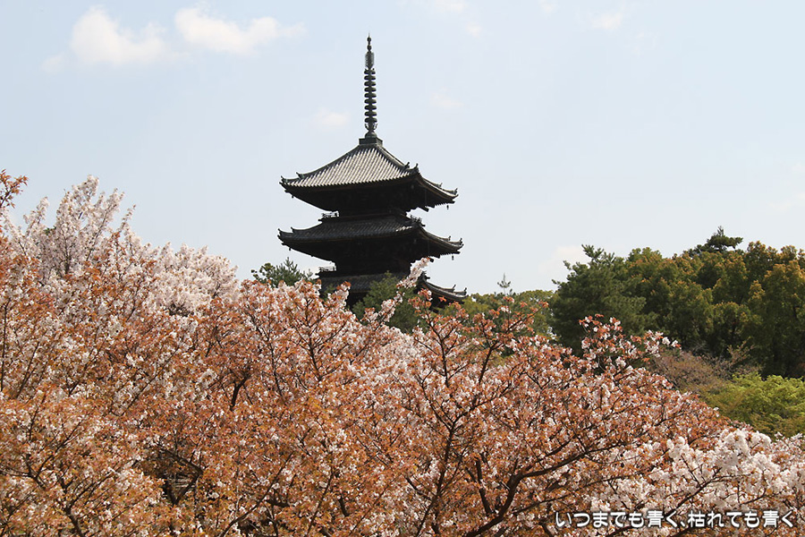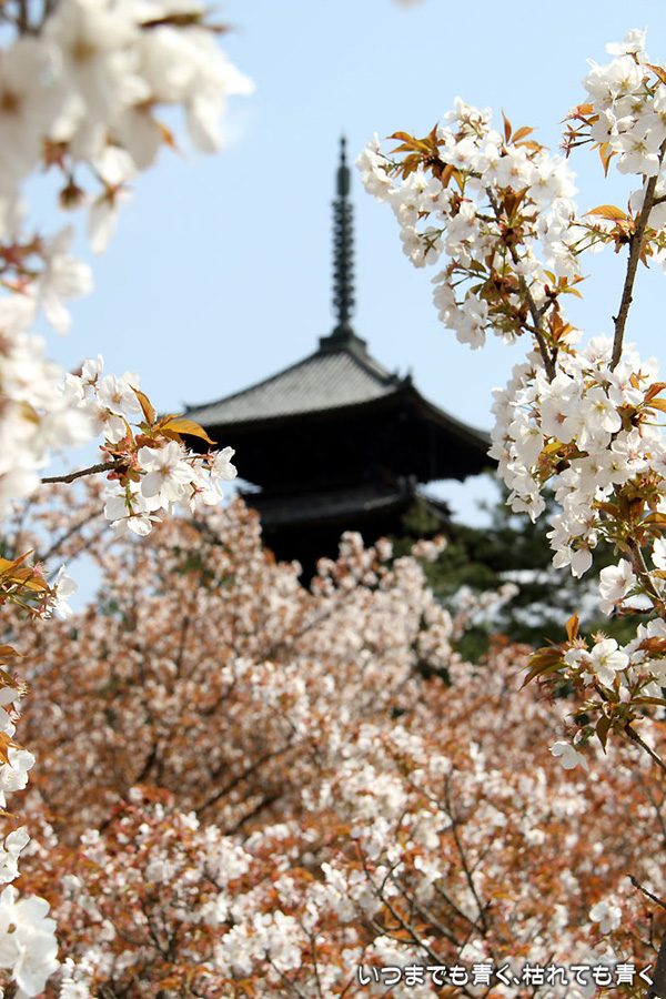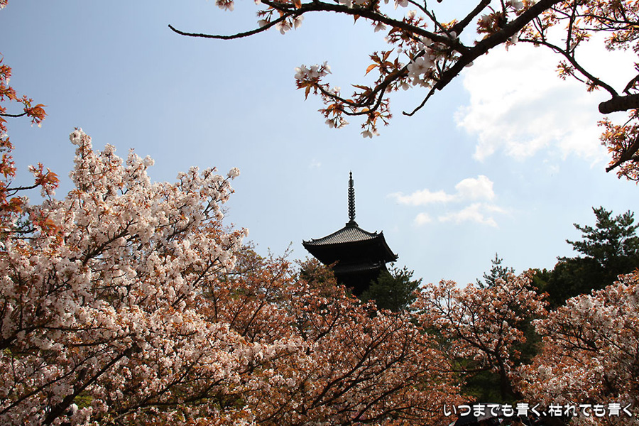 昨年、京都の桜を見に訪れた時の御室桜はまだ開花前だったので、今年は絶対に見ようと思って奥さんと長女を連れて京都に来ました。 しかし、遅咲きの御室桜も今年は開花が早いのか、もう葉のほうが多くなっていました。 残念ながら満開の御室桜の中にそびえる五重塔を見ることができませんでした。御室桜は、また来年リベンジです