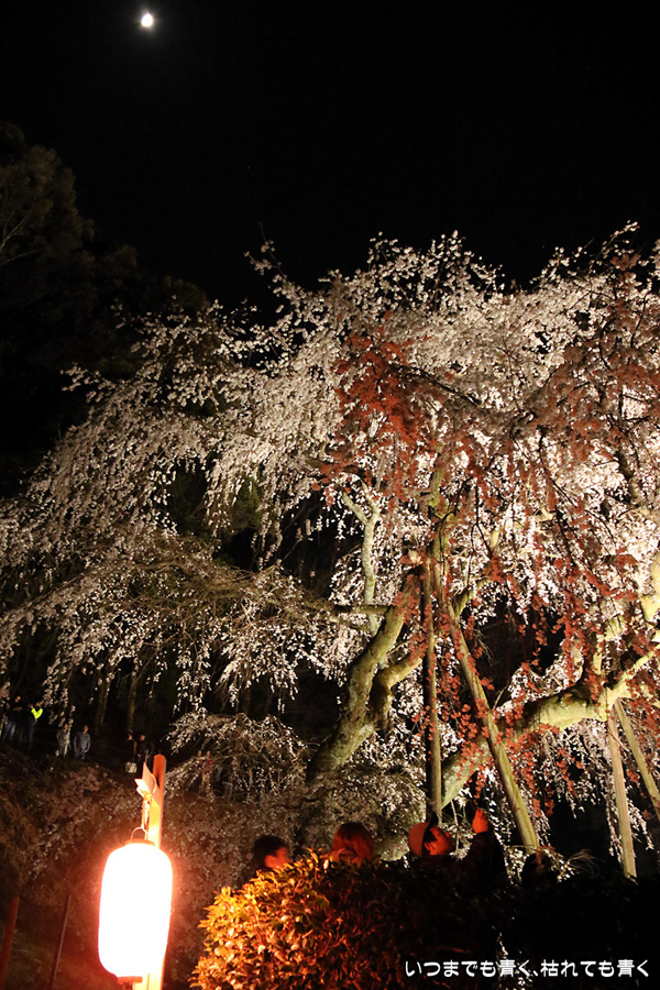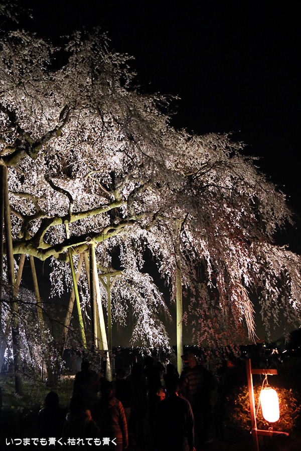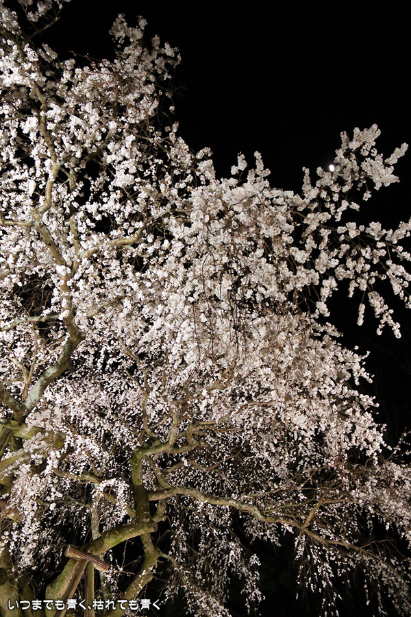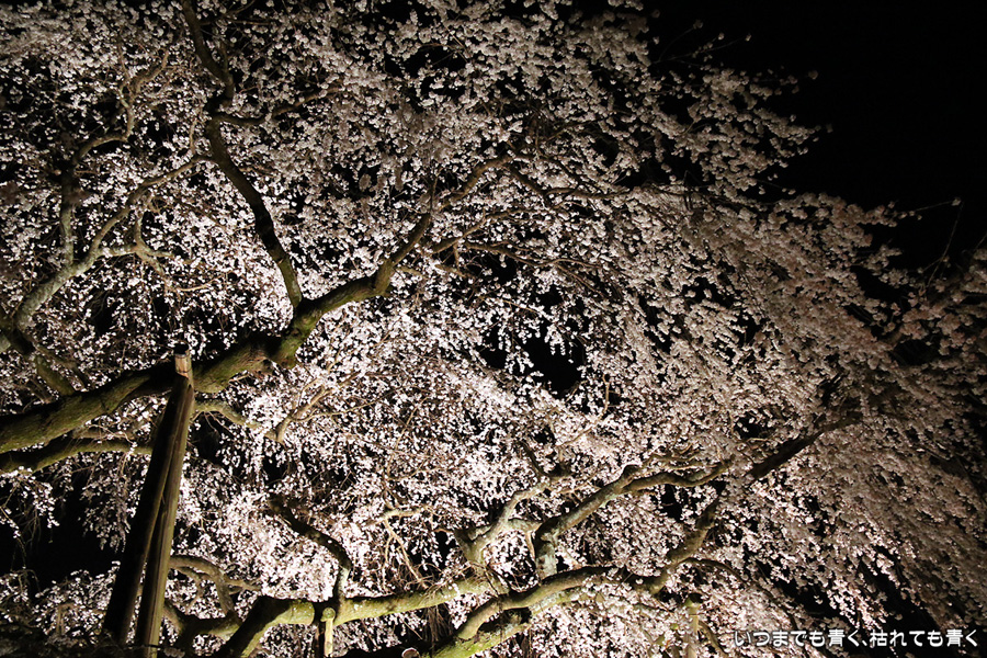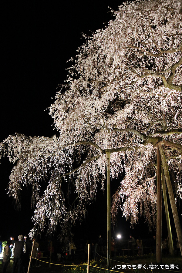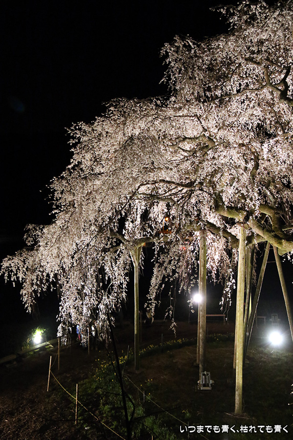 1300年ほど前に持統天皇が村積山行幸の際にお手植えされたと伝えられ、天然記念物に指定されているしだれ桜です。今日はちょうど見ごろでたくさんの人が集まっていました。ライトアップも見たくて夜にも行きましたが、昼よりも存在感がありました。三脚を据えて撮影している人が多かったですが、私は時間もなかったので手持ち撮影。おかげでピントのあまい(手ブレとも言います)写真ばかりになってしまいました。