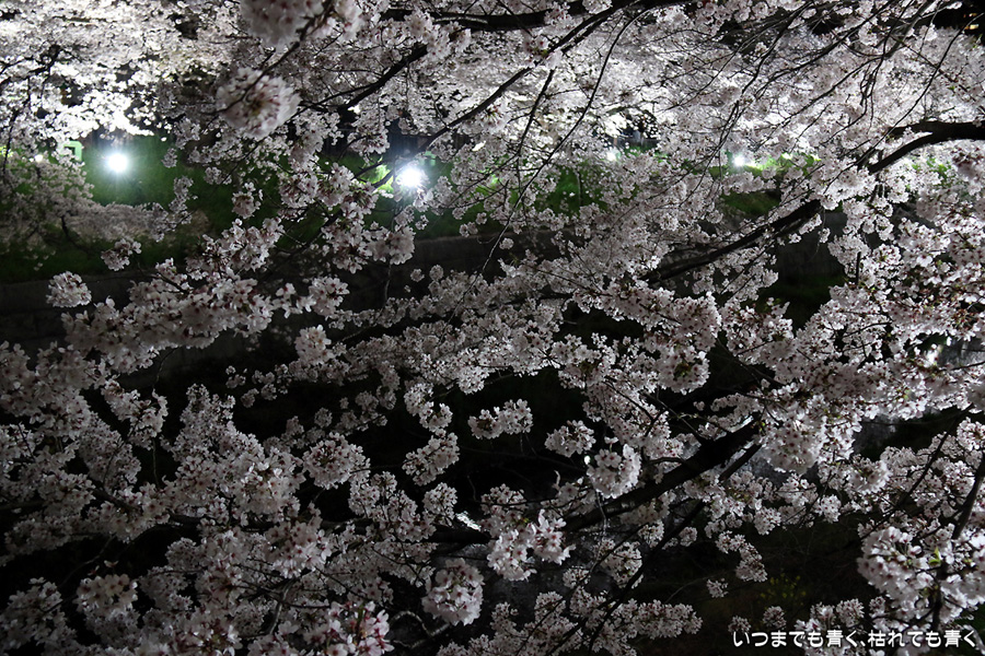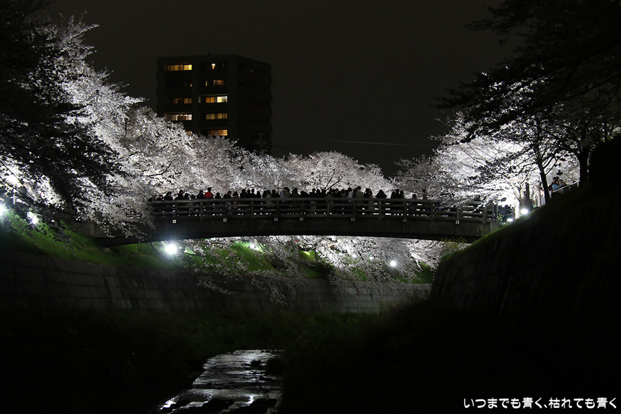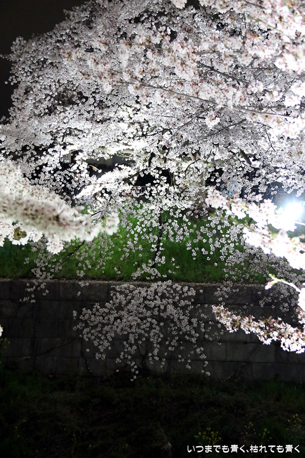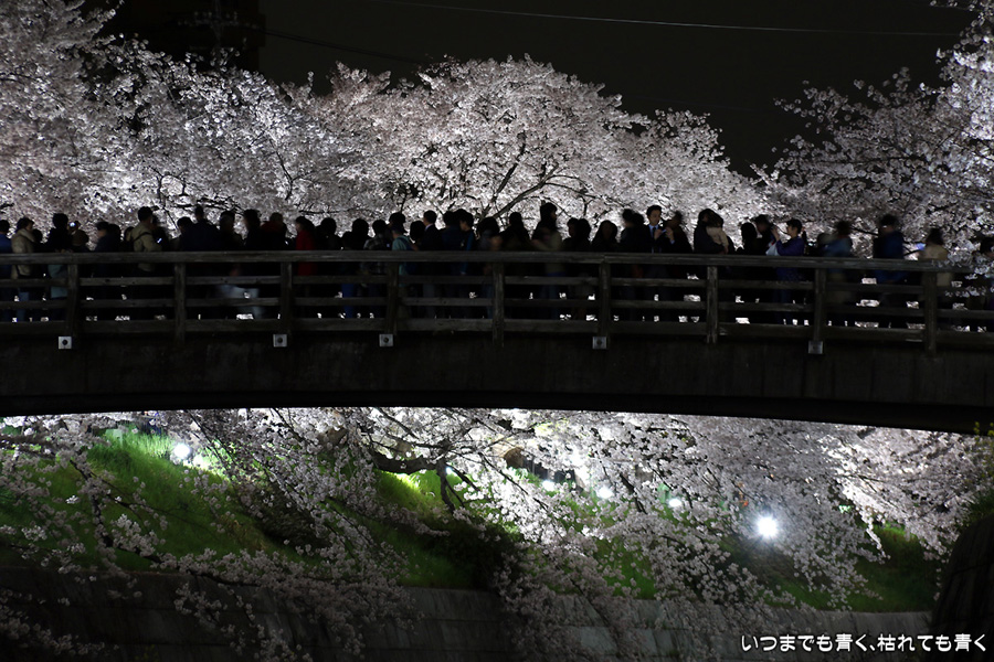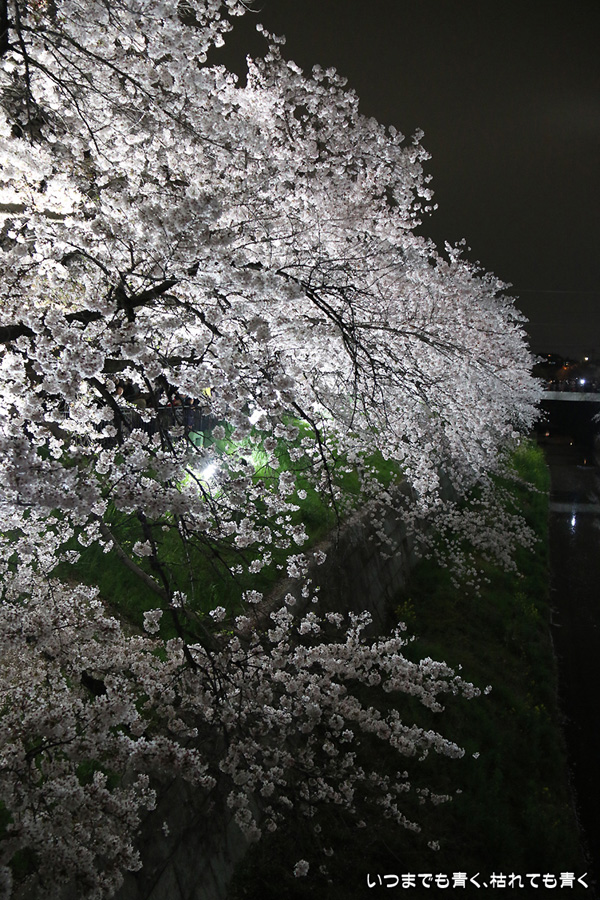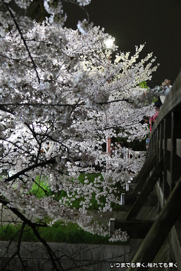 翌日から雨が続くという予報なので、この日で今年の桜は見納めかもしれないと思って、仕事が終わってから瑞穂陸上競技場の近くにある山崎川の桜のライトアップを見てきました。何度見に来ても、桜と鼎小橋(かなえこはし)は絵になりますね。露出をわざとプラス側にふって白飛び承知で白く輝くような桜に仕上げましたが、いかがでしょう。