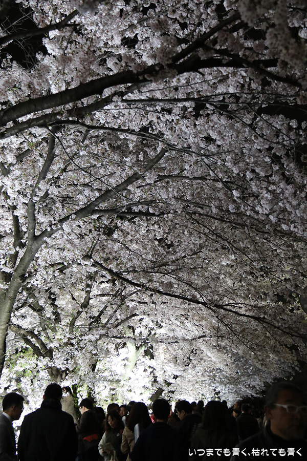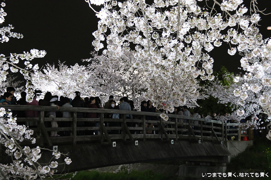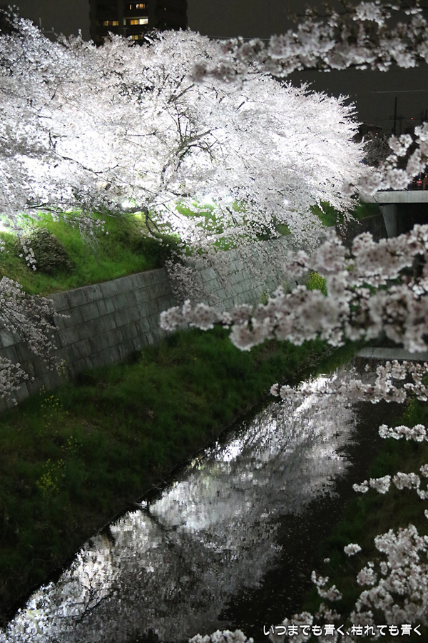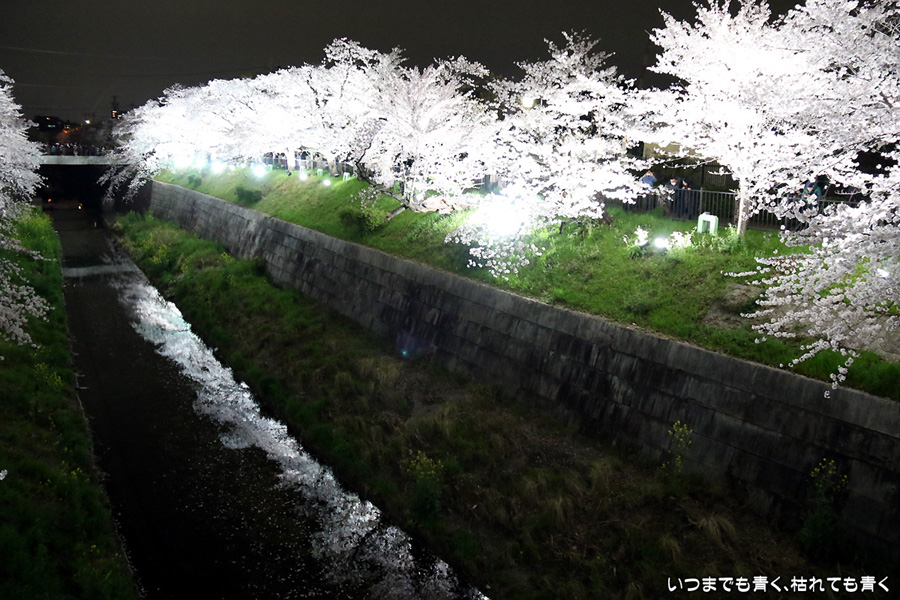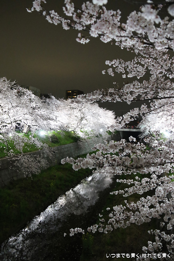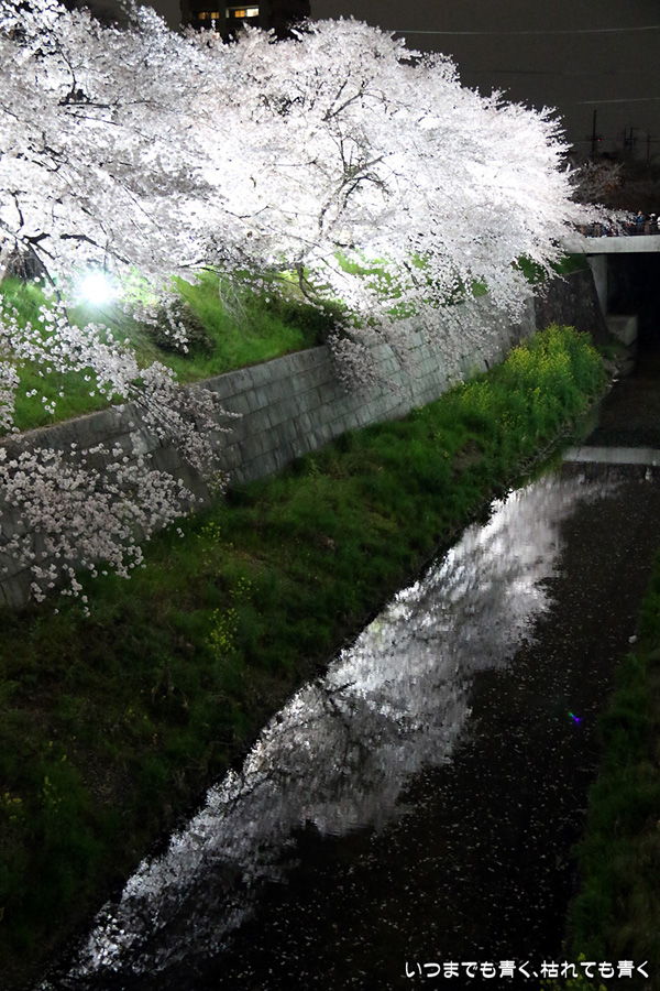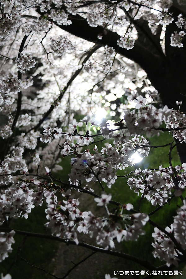 翌日から雨が続くという予報なので、この日で今年の桜は見納めかもしれないと思って、仕事が終わってから瑞穂陸上競技場の近くにある山崎川の桜のライトアップを見てきました。何度見に来ても、桜と鼎小橋(かなえこはし)は絵になりますね。露出をわざとプラス側にふって白飛び承知で白く輝くような桜に仕上げましたが、いかがでしょう。