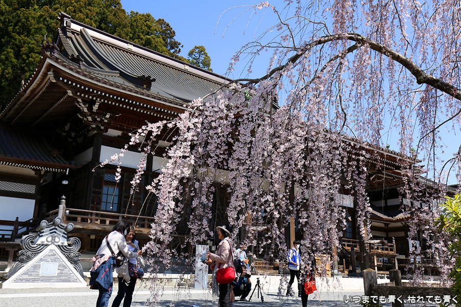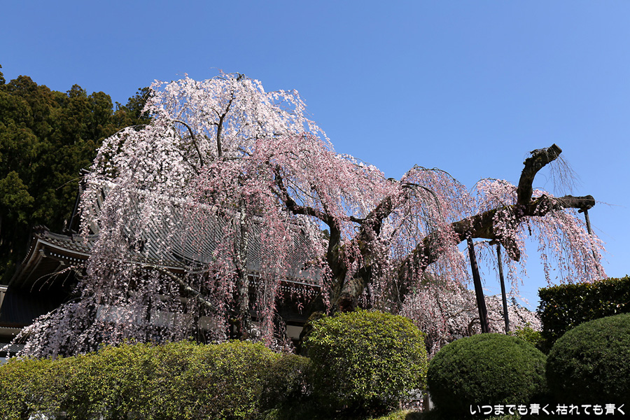 樹齢400年のしだれ桜がとてもきれいです。初めて訪れましたが、静かで落ち着くお寺でした。ちなみに、ここの石段は287段。一段の高さが高いので登りきる時は死にそうになります。