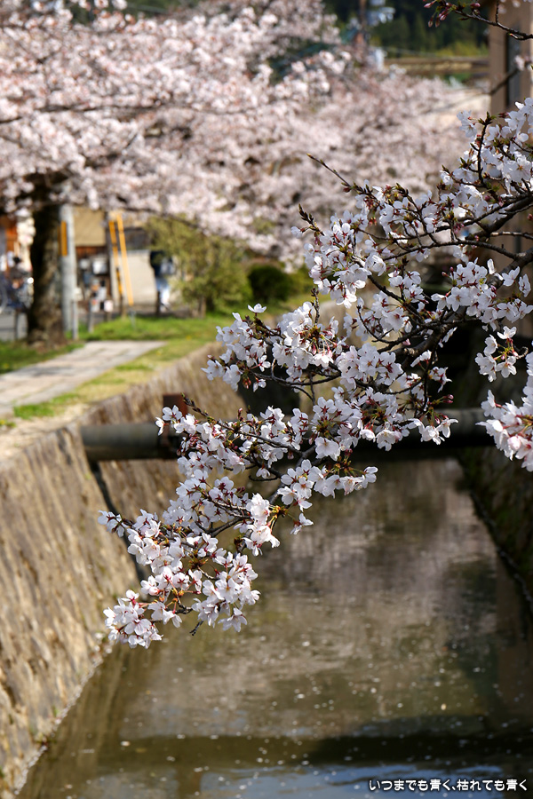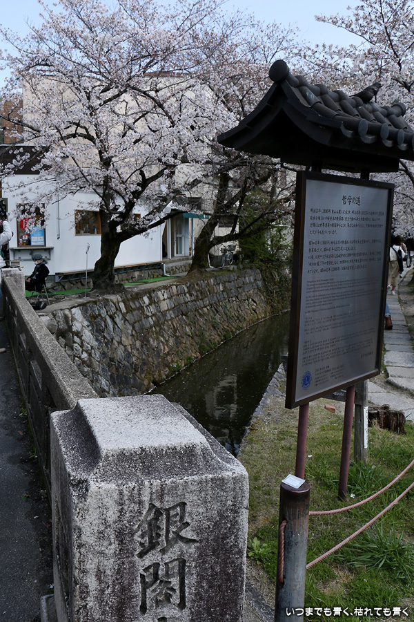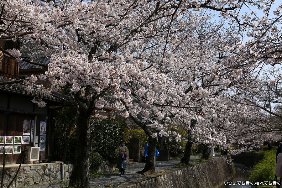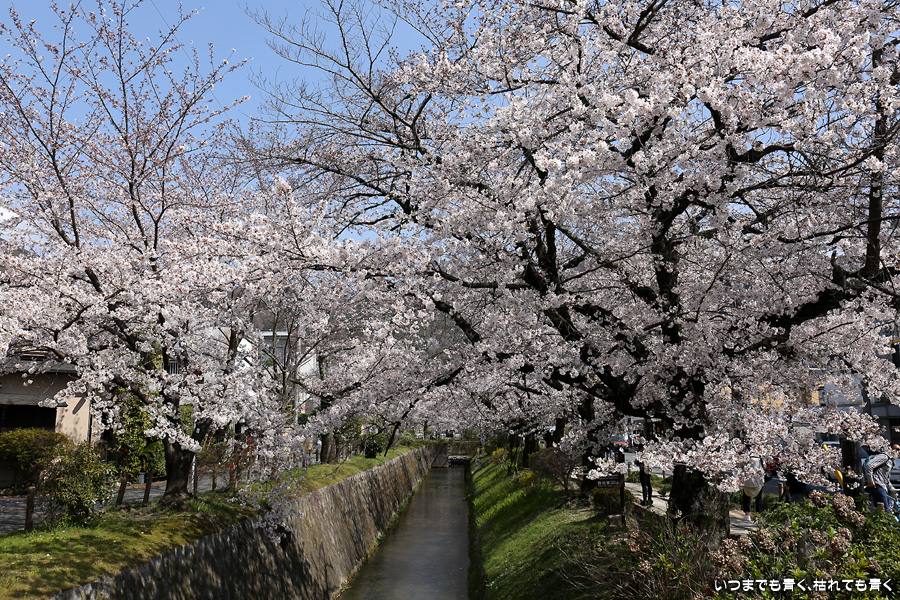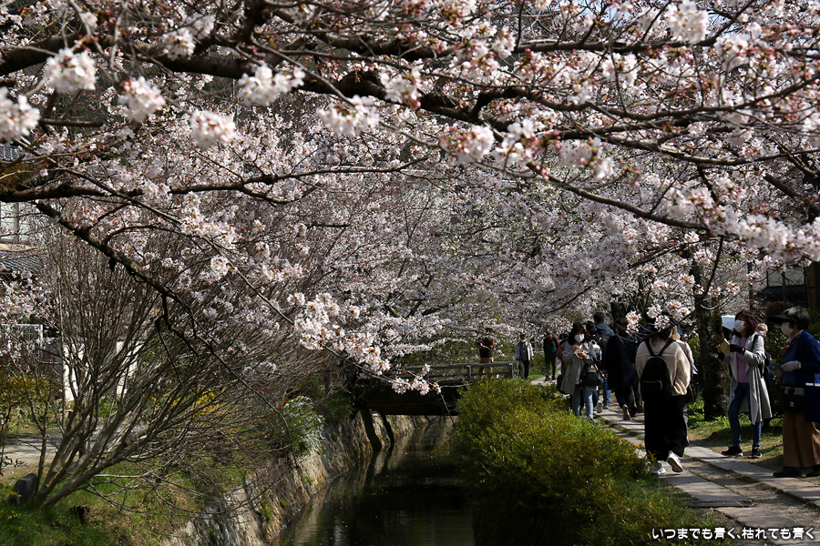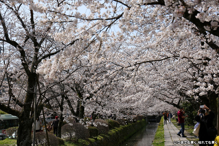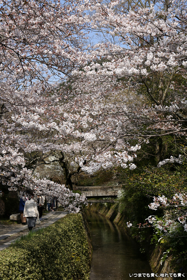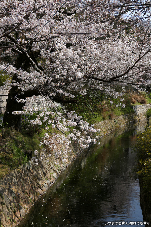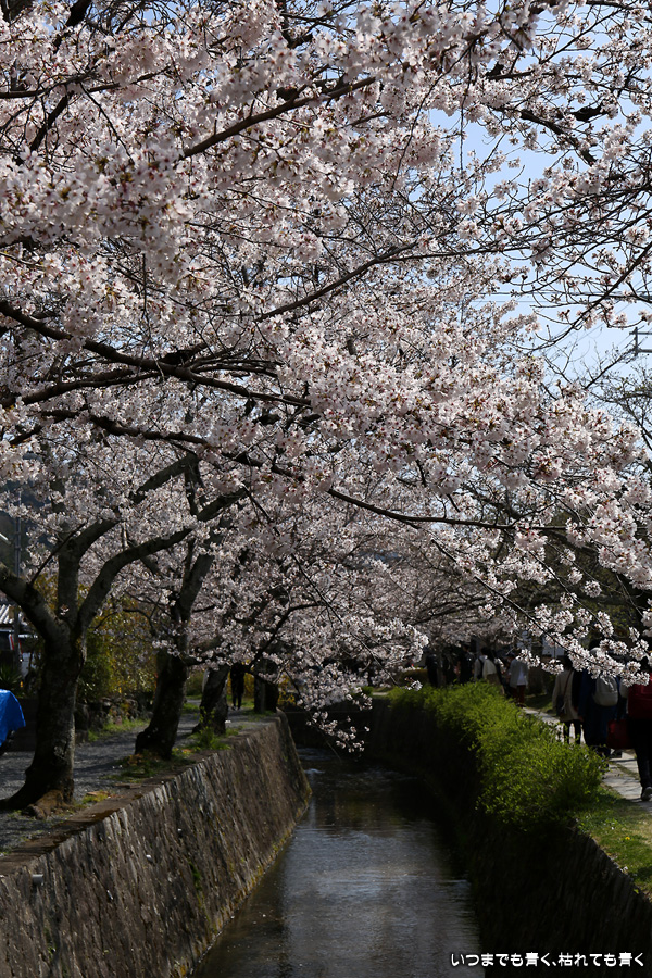 哲学の道の桜は、満開の時に訪れると琵琶湖疎水の上を桜がアーチのように覆っていて、とても美しい光景を見せてくれます。散り始めた時のピンクの花びらに染まる疎水の流れも素敵です。最初の4枚は疎水脇の桜ですが、銀閣橋の手前の写真ですので厳密には哲学の道ではありません。