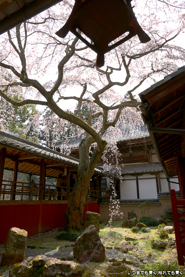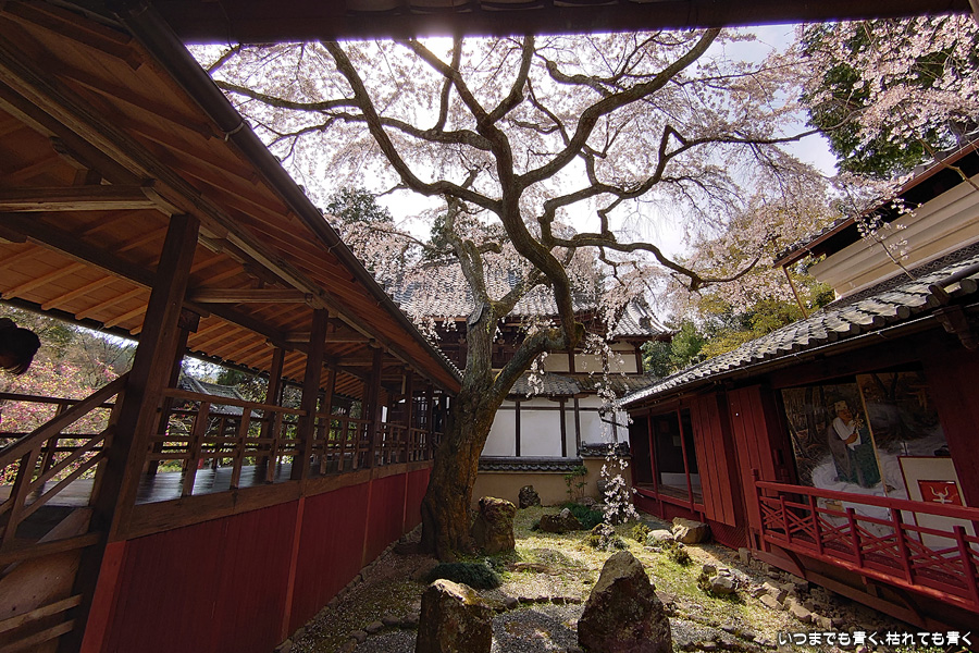 十輪寺は、昨年秋に紅葉を愛でに初めてきたお寺で、中庭のしだれ桜の咲いた光景を見たいと思って訪れました。すでに散り始めていましたが、まだ見頃で楽しめました。中からの写真は明暗の差が大きく、スマホならば美しく撮れますが一眼レフではあとでの現像作業が必須の悪条件でした。掲載した写真のうち、一枚はスマホで撮影した写真です。