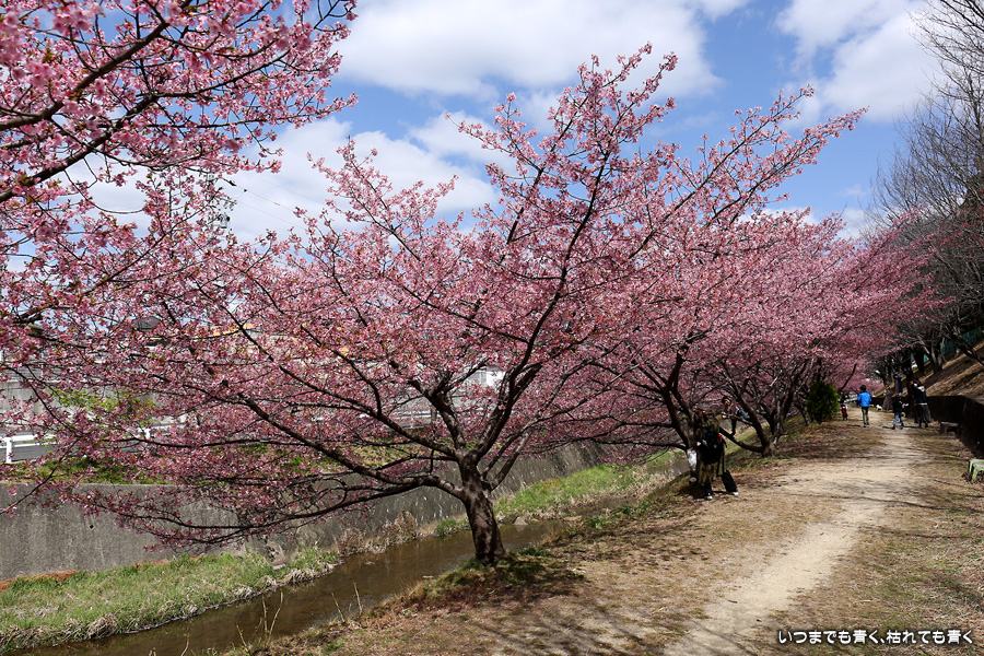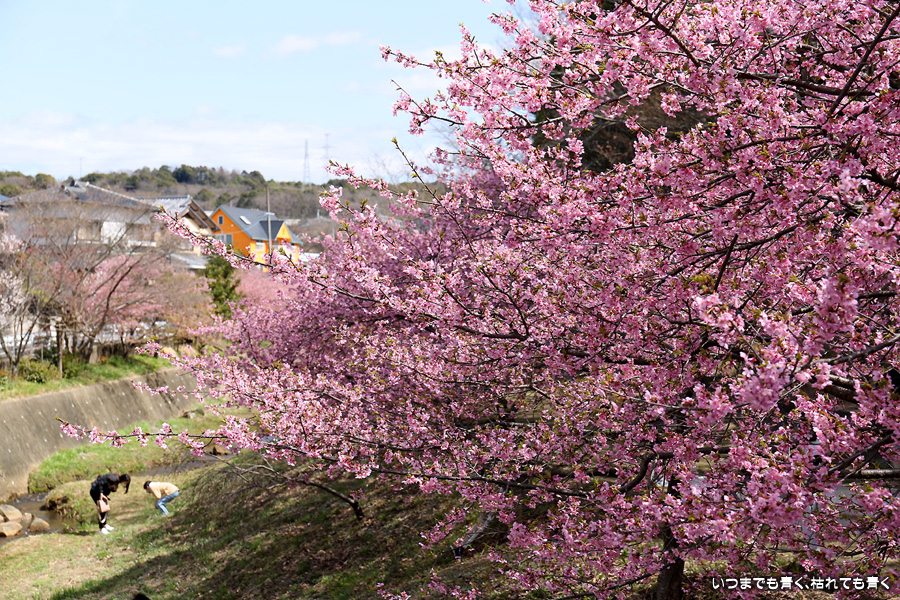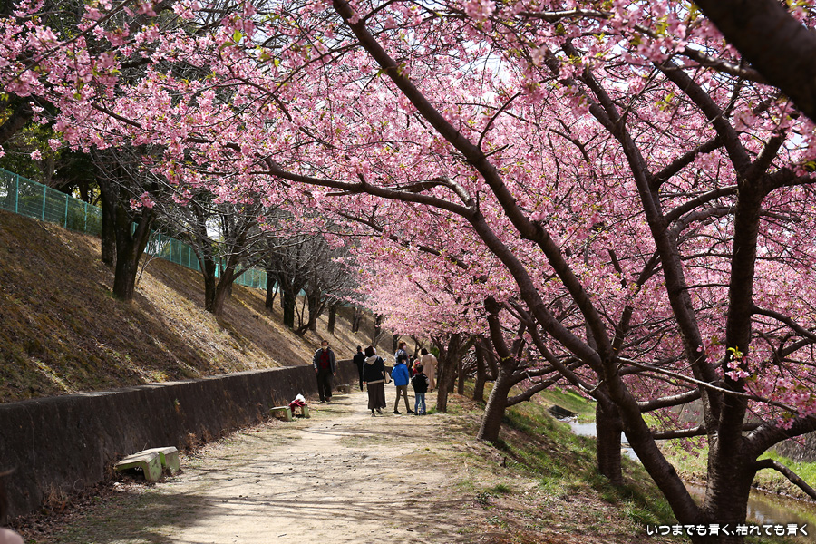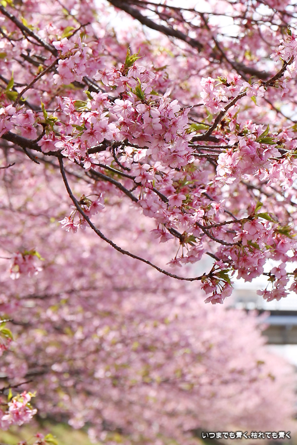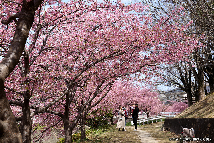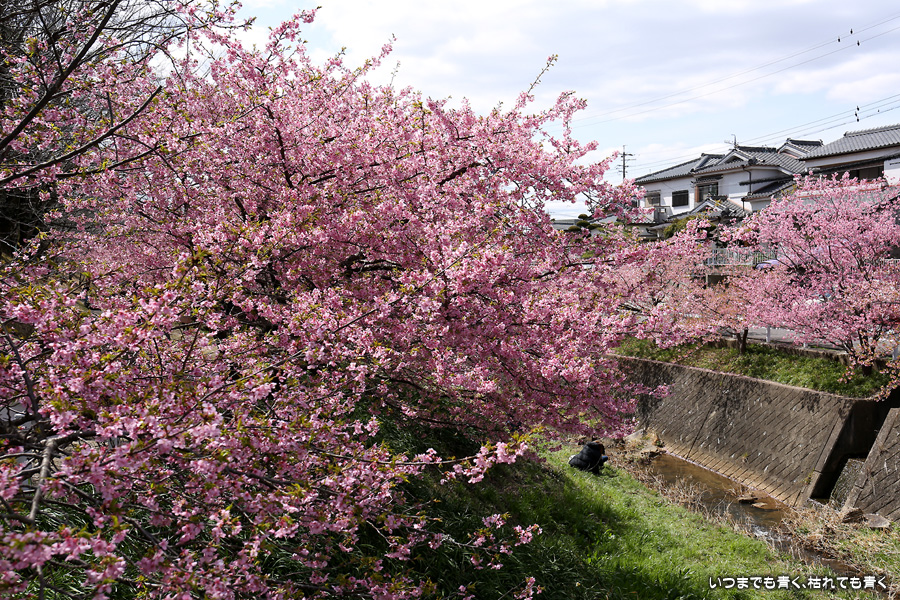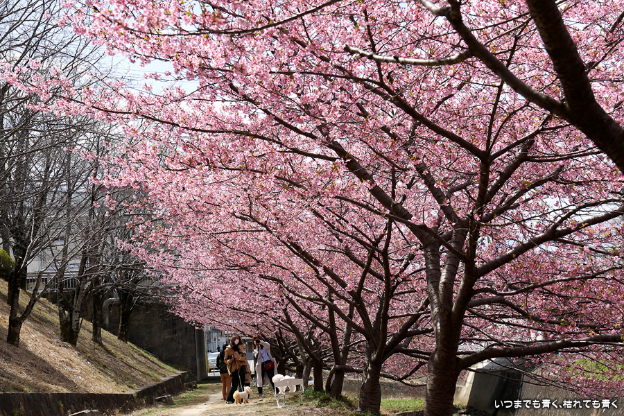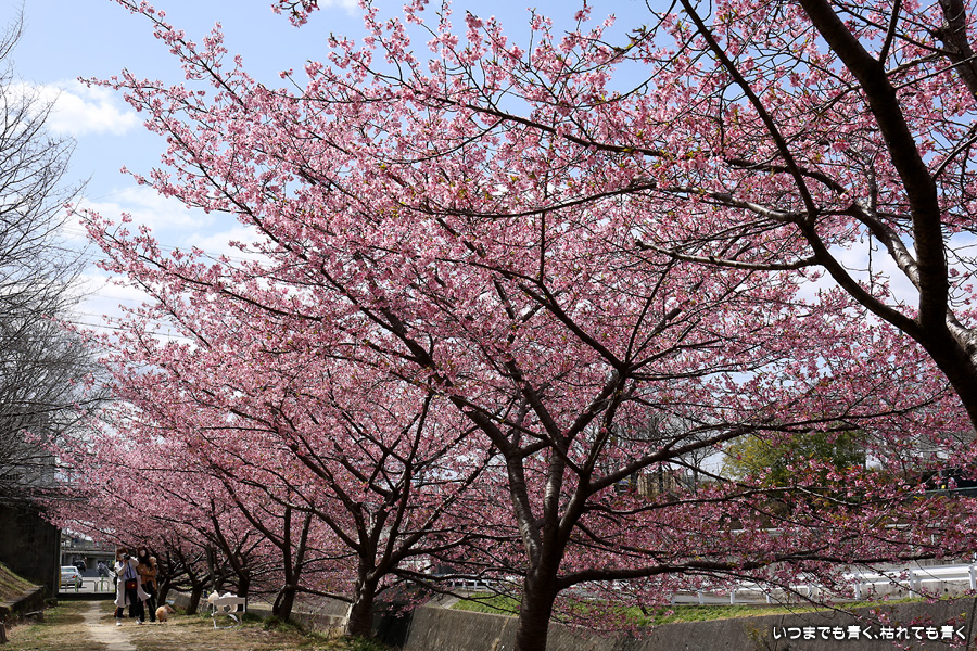 距離はそれほどありませんが、加茂川沿いにある河津桜並木です。水辺に降りることができるのでいろんな方向からの花見や撮影を楽しむことができます。