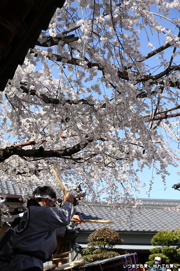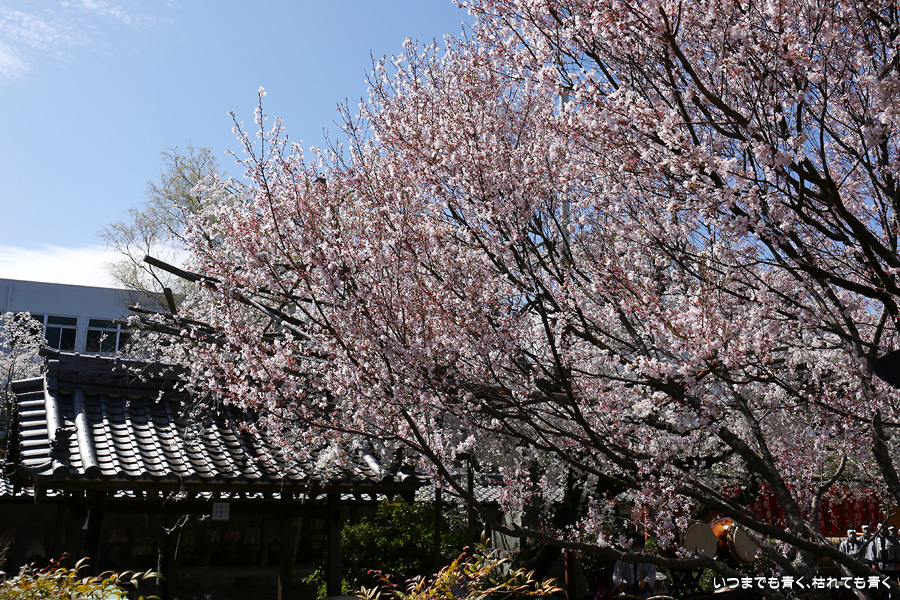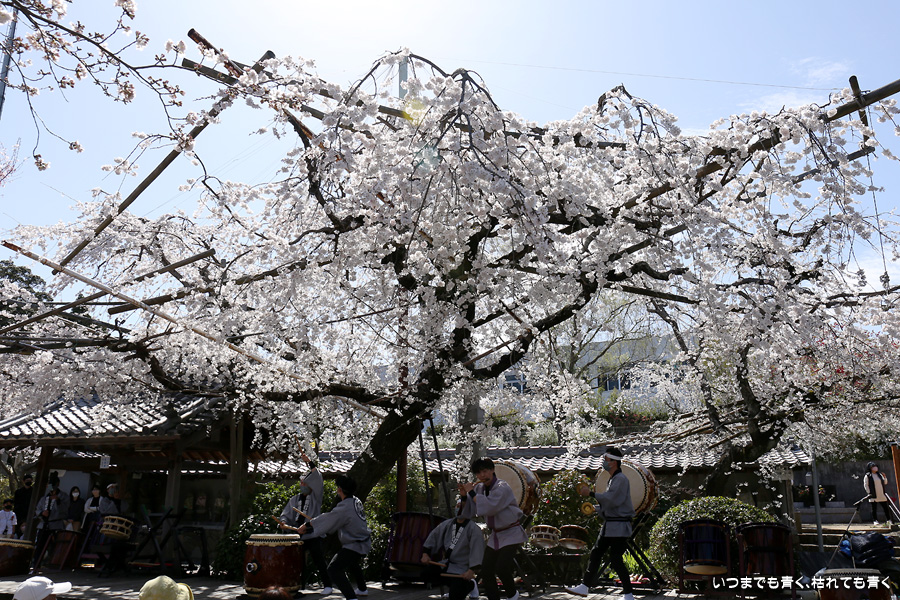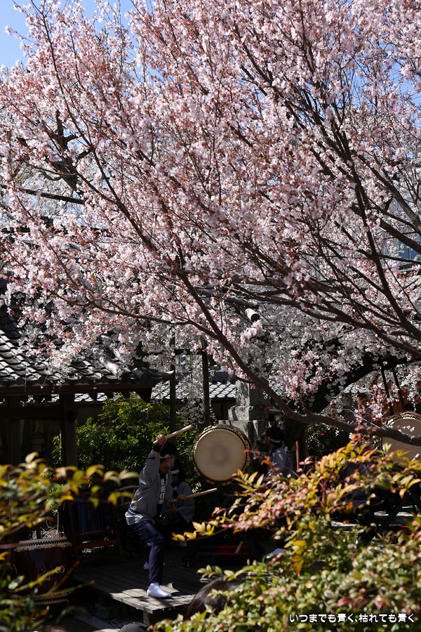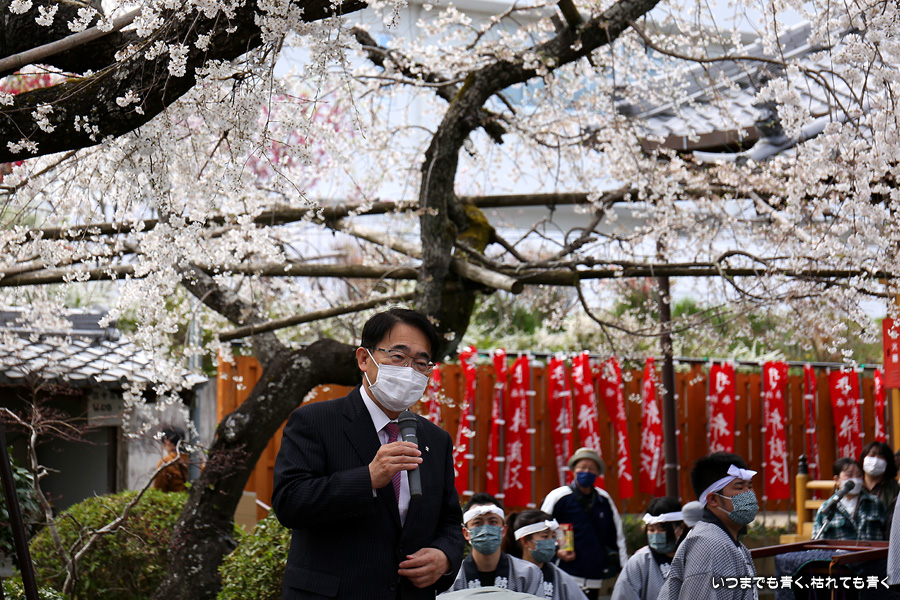 しだれ桜が見ごろの土日に行くのですから当然かもしれませんが、源空院を訪れるとよくイベントに遭遇します。今回は、源空院に着くとちょうど、西尾市を拠点とするプロ和太鼓集団「熱響打楽」の演奏中でした。桜の写真を撮るには不都合ですが、桜と演者という構図も面白いかもと思って撮影を楽しみました。最初は青かった空も二時間もすると白い空に変化し、雰囲気ががらっと変わったのも残念でしたが、それもまた面白いと思って楽しみました。最後の一枚は、写真撮影に行った場所でたまに遭遇する愛知県大村知事です。