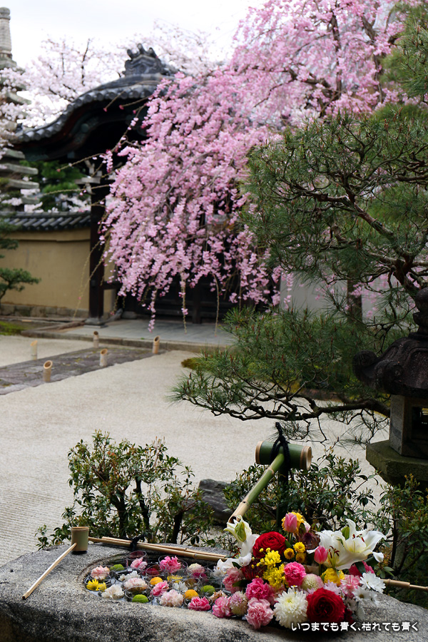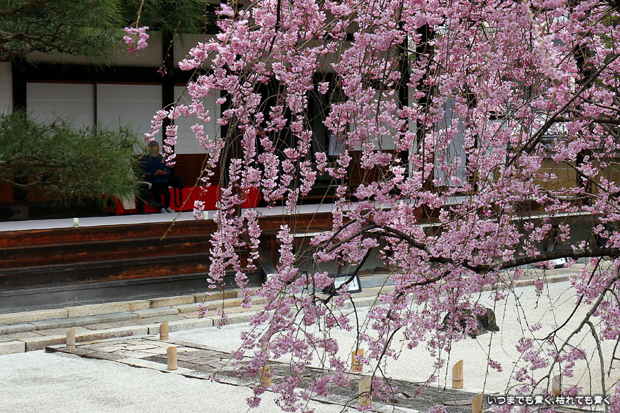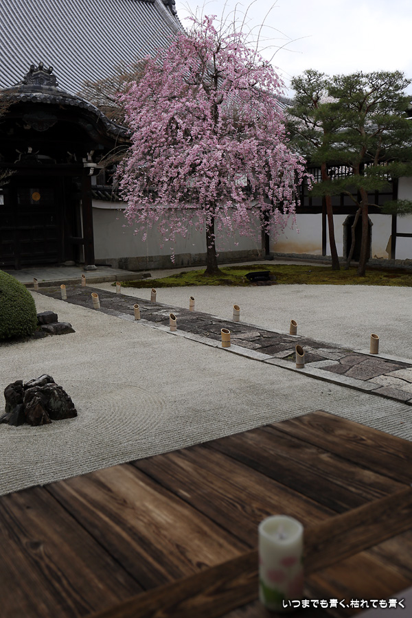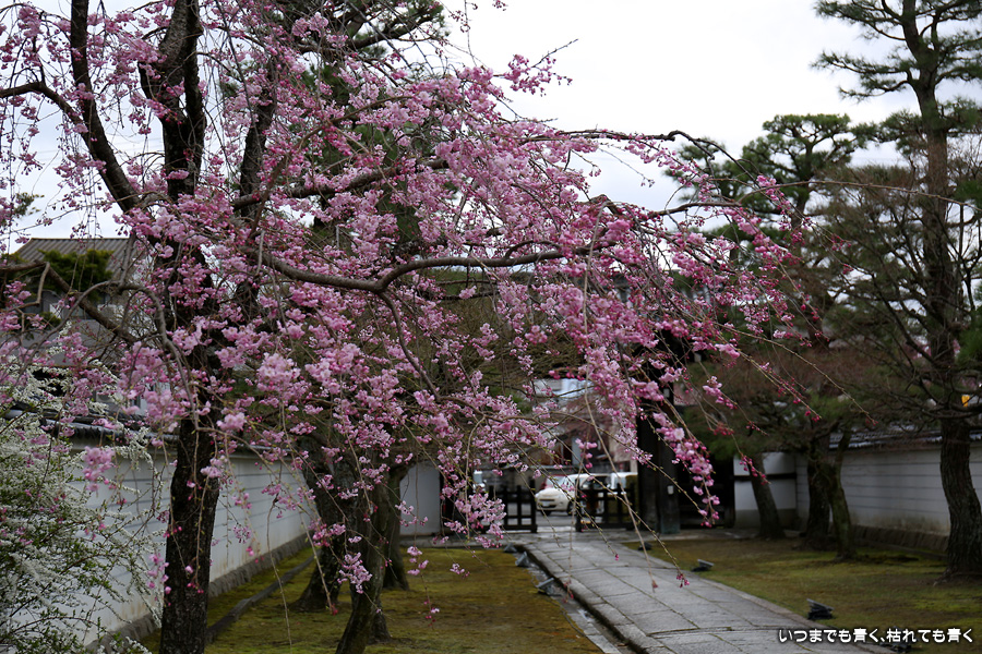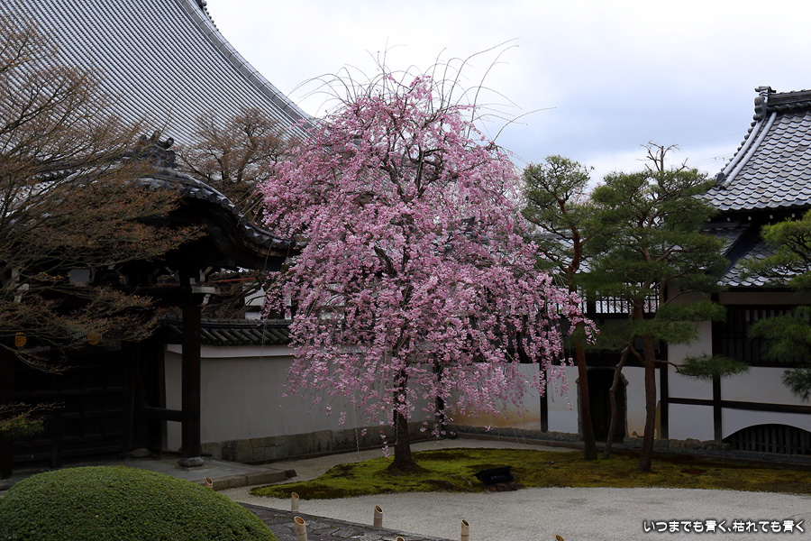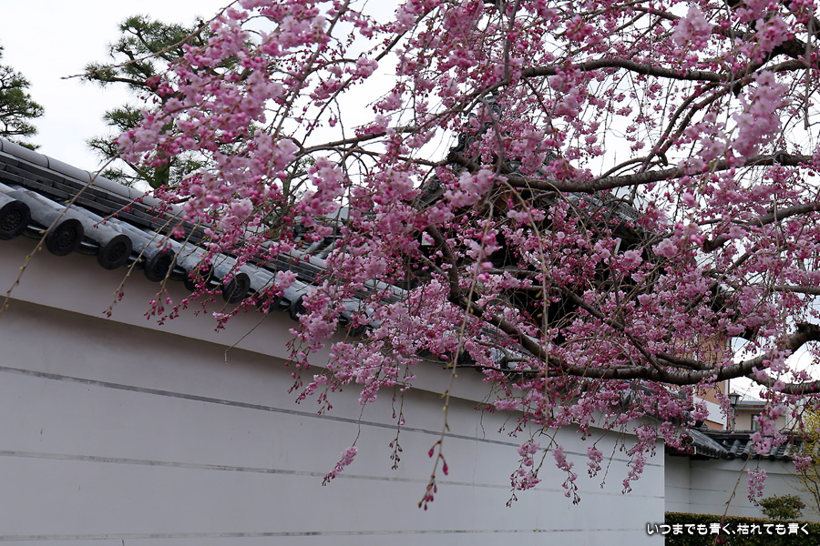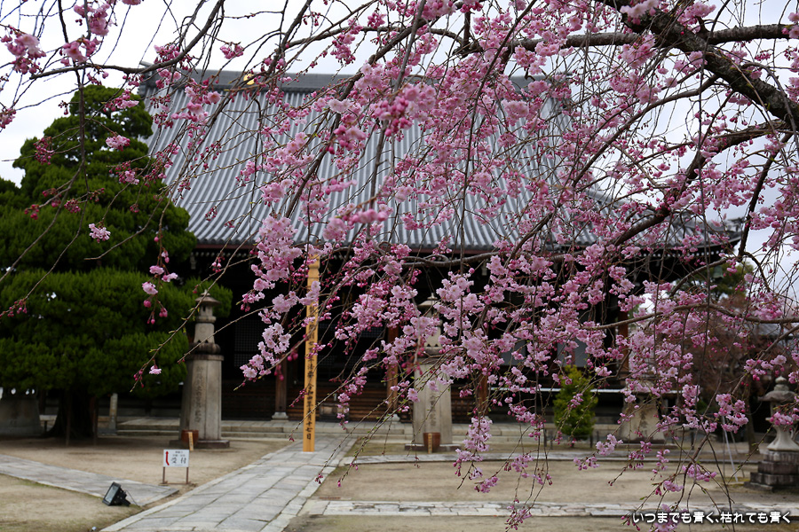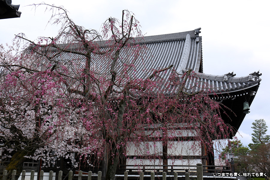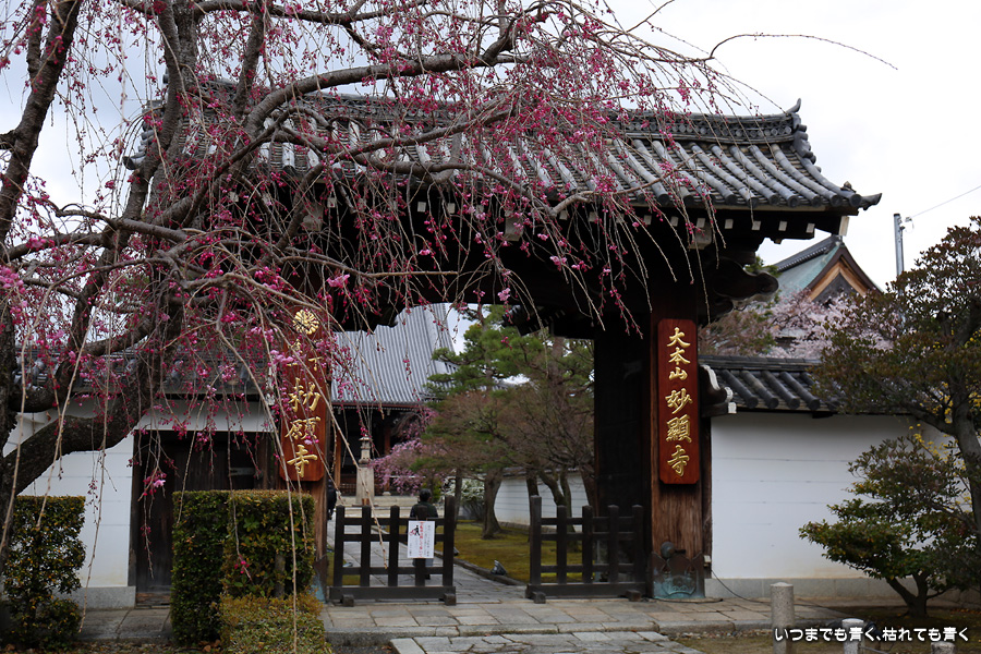 妙顕寺は2020年秋に紅葉を見に来ましたが、このお寺は春のほうが素敵に感じました。同じ場所でも視点の角度や焦点距離を少し変えれば違う印象の写真が撮れるので、時間を忘れて撮影していました。空も幾分明るくなったことと、紅しだれ桜の色のおかげで少しは華やかな印象の写真も撮ることができました。