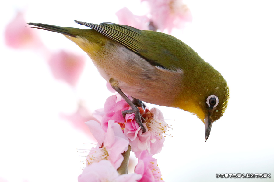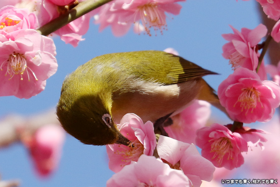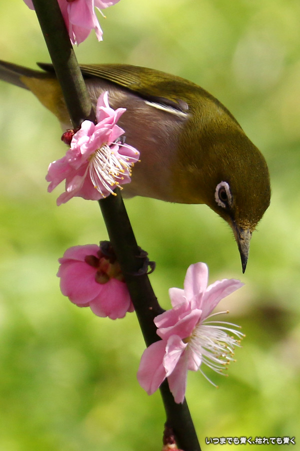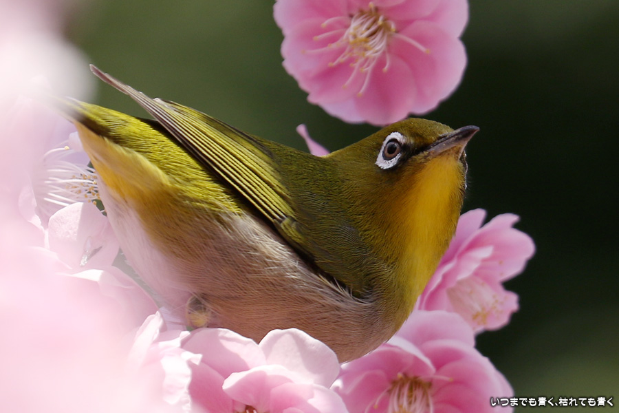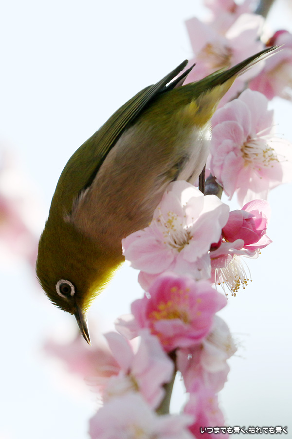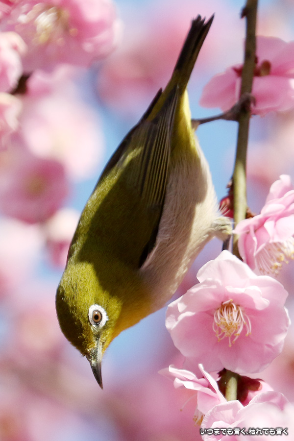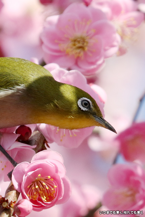 素晴らしい城南宮のしだれ梅にはたくさんのメジロが集っていました。しかし城南宮のメジロ撮影は、しだれ梅の枝が多くて邪魔になったり、花が多いのでメジロの動きが素早かったり、撮る側の人が多くて撮影ポジションを取れなかったり、けっこう難しい撮影でした。