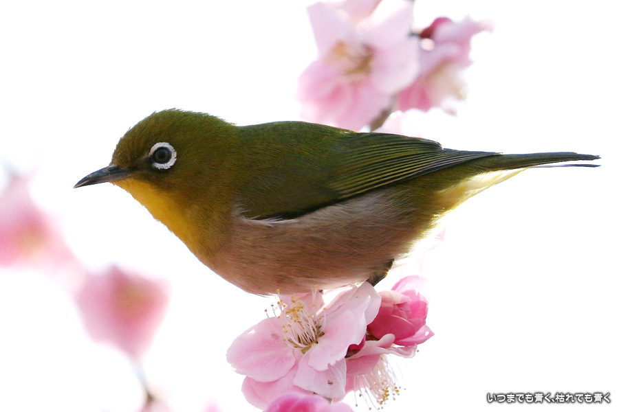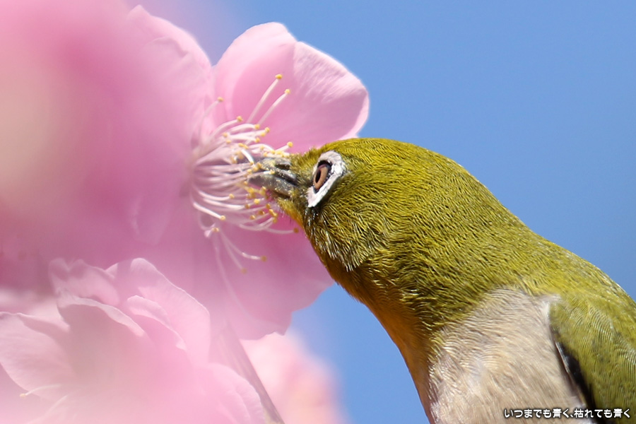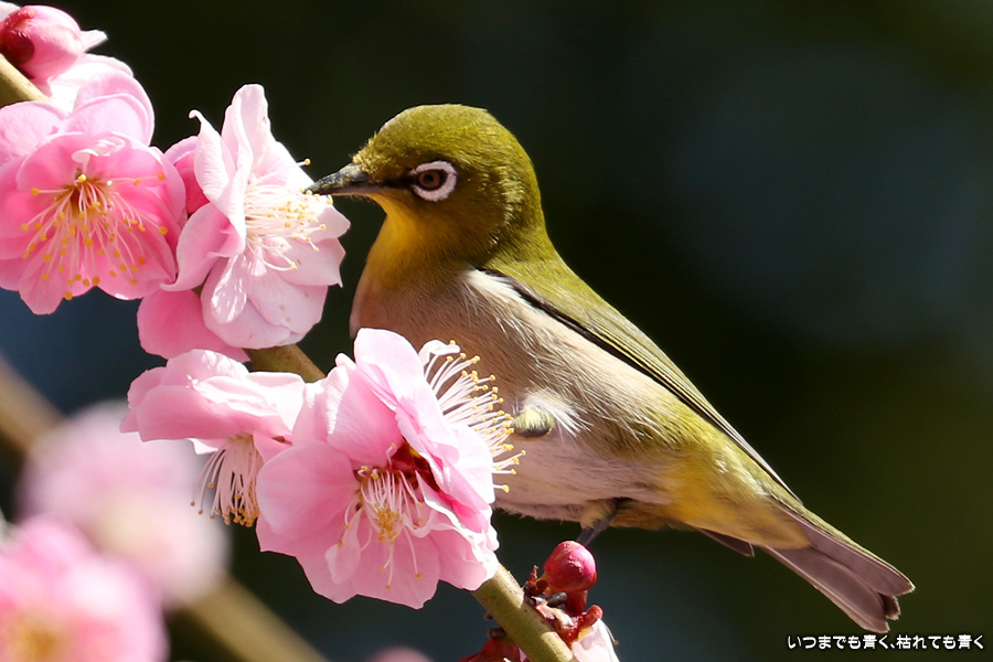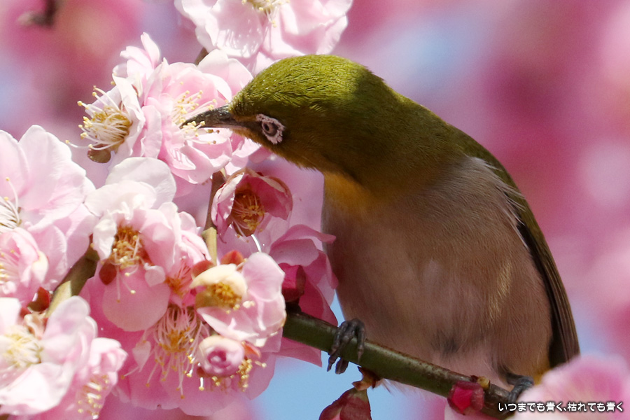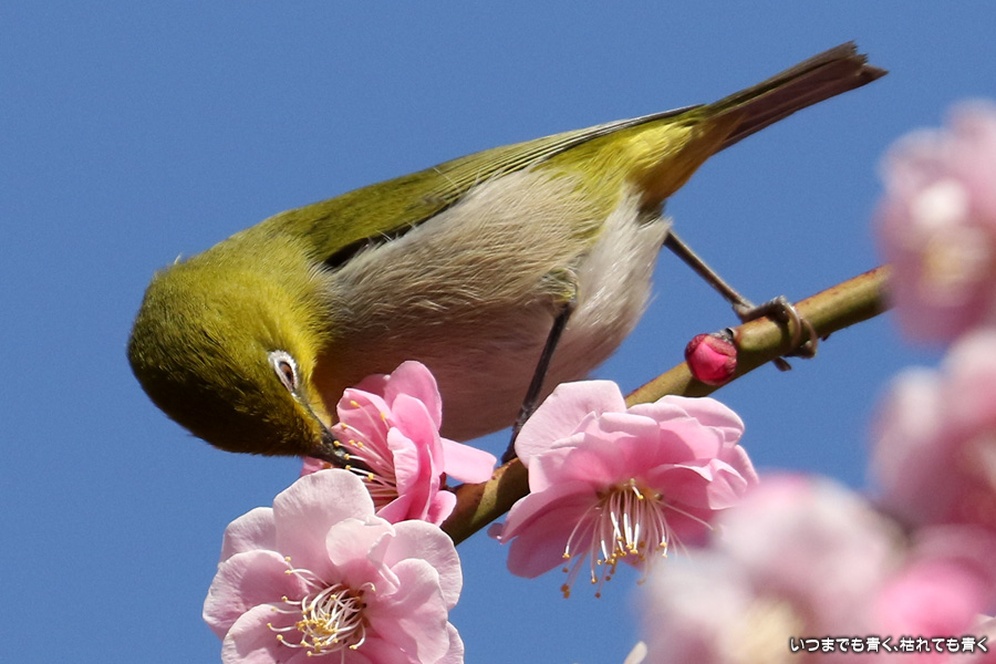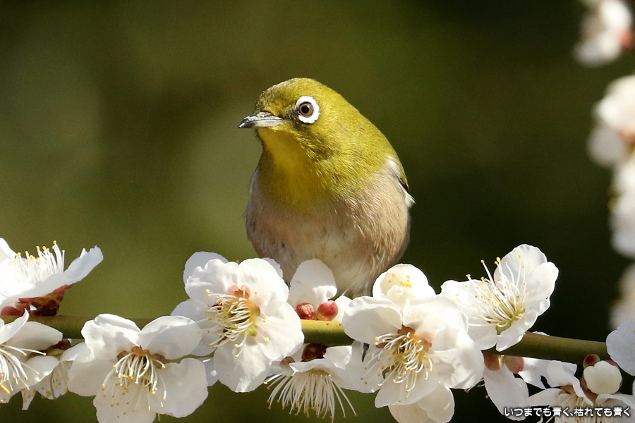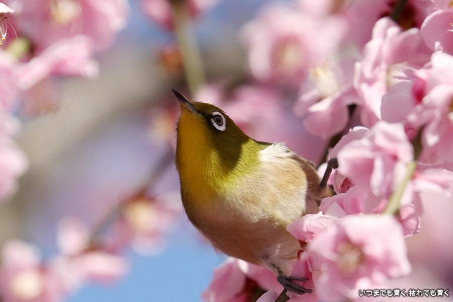 素晴らしい城南宮のしだれ梅にはたくさんのメジロが集っていました。しかし城南宮のメジロ撮影は、しだれ梅の枝が多くて邪魔になったり、花が多いのでメジロの動きが素早かったり、撮る側の人が多くて撮影ポジションを取れなかったり、けっこう難しい撮影でした。