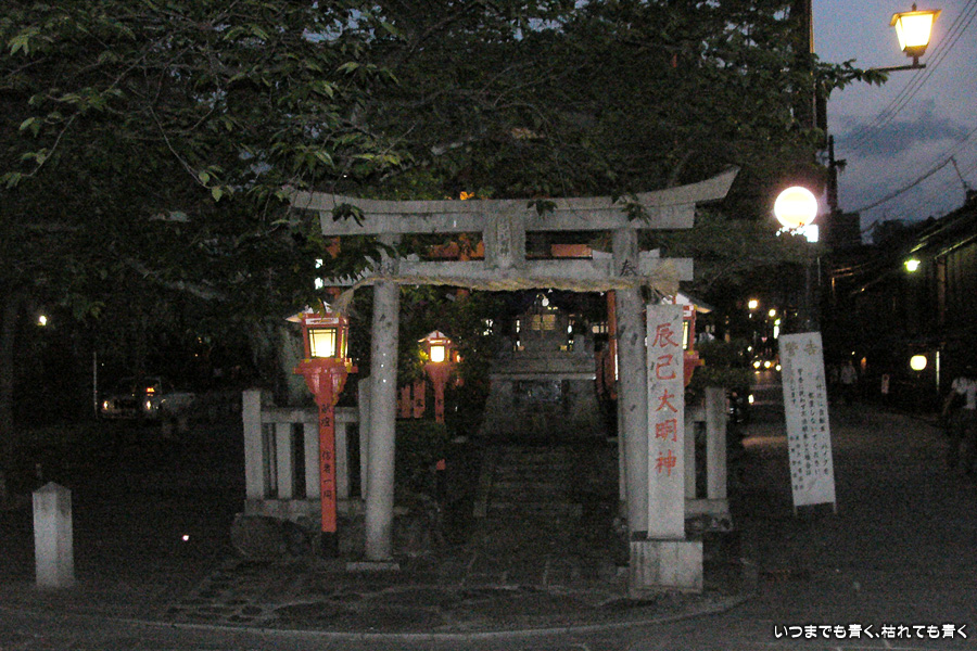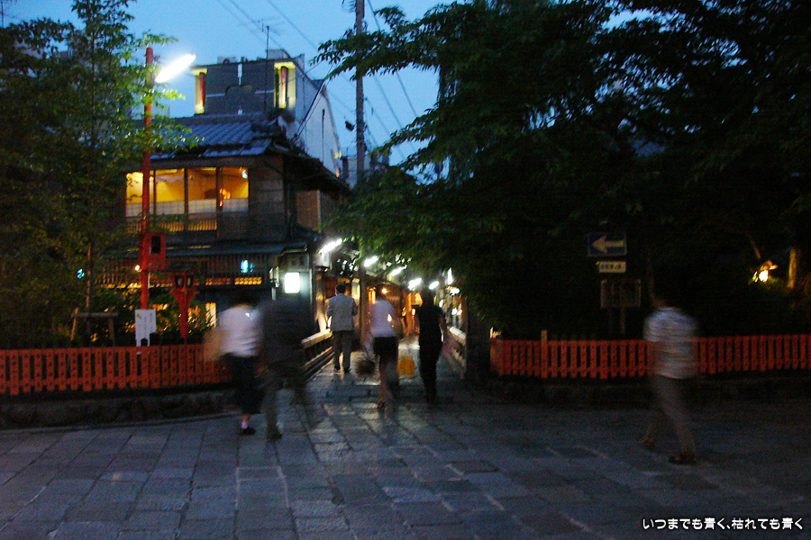 清水寺を後にしたら、来た道を戻って円山公園を通り八坂神社を抜け西楼門から東大路通に出ると、そこはもう祇園です。テレビドラマでもおなじみの祇園。ドラマ「京都祇園入り婿刑事事件簿」では、中村玉緒が何かあると必ずお参りに行く辰巳大明神があるところです。ずっと歩き詰めでしたので、八坂神社を出たところでベンチに座ってたこ焼きを食べたのですが、そのおいしかったこと。そういう何気ないこともいい思い出です。祇園のお茶屋さんが軒を連ねる花見小路通にはいって、夜の祇園の雰囲気を外から少し体験。いつかはこういうところで食事でもしたいものです。一通り散策したら、お目当ての巽橋と辰巳大明神のある場所に向かいます。行ってみるとどうってことないところなのですが、ここがいろんなドラマの舞台になったのだと思うだけで感慨深いものがあります。