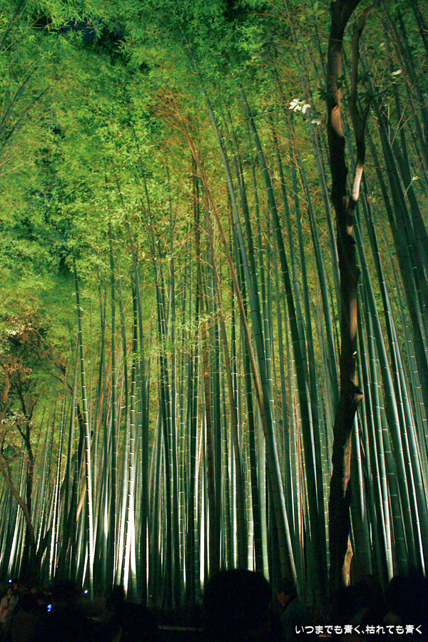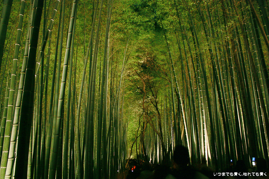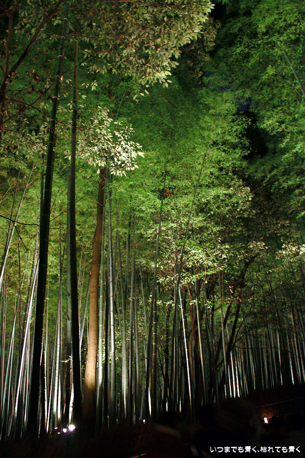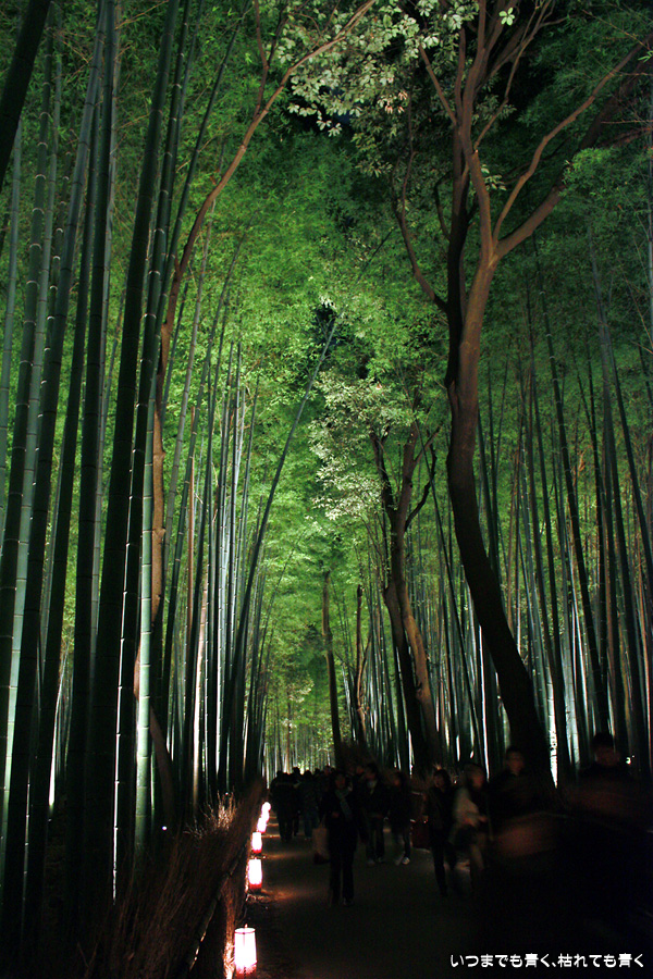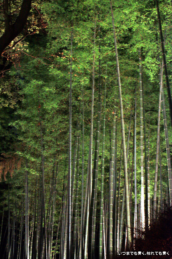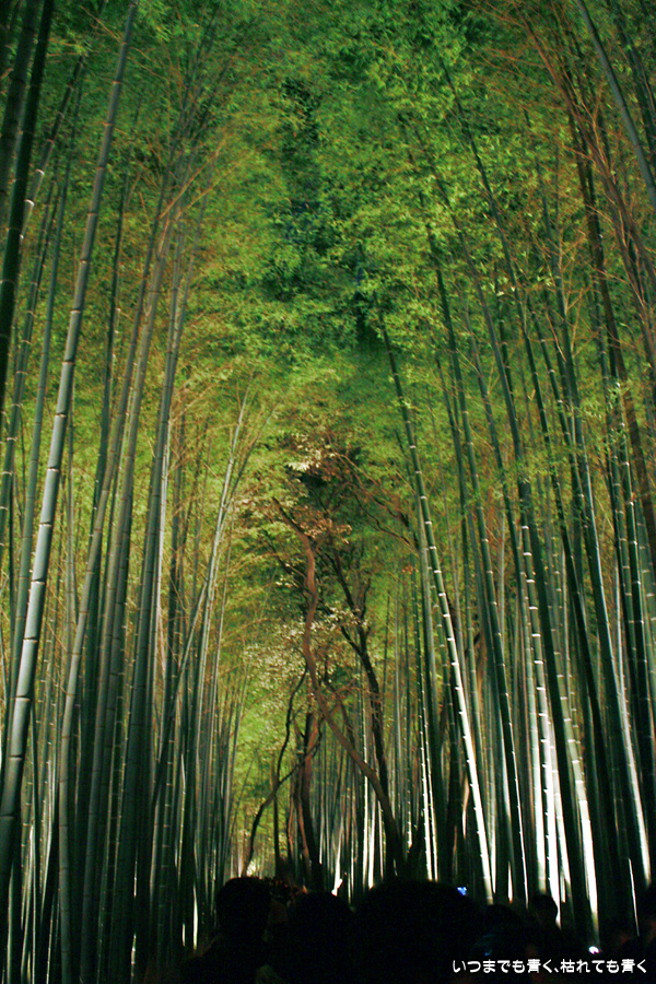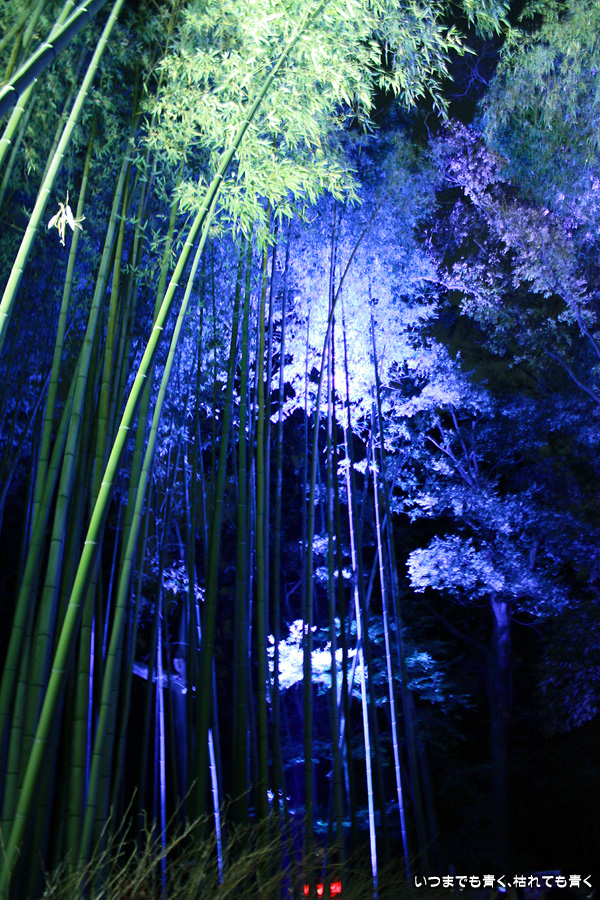 常寂光寺を出て南に進むと、クリスマスのようなライトアップが見えてきます。トロッコ嵐山の駅です。トロッコとJRの線路を跨ぐ道を上を通り、しばらくして左に折れると竹林の小径です。この竹林の小径のライトアップは、とても幻想的ですばらしい光景です。通常のライトの中に青いライトが混じってそれがまた不思議な世界を醸し出しています。この光景は一見の価値あり。来てよかったと思いました。写真は手持ちでのスローシャッター撮影でしたのでピント甘々の写真になってしまいました。