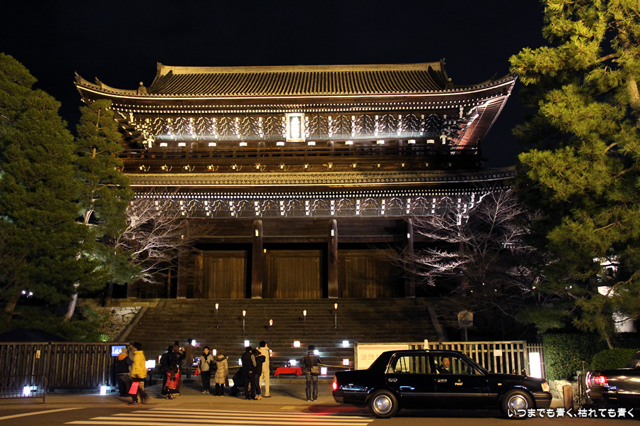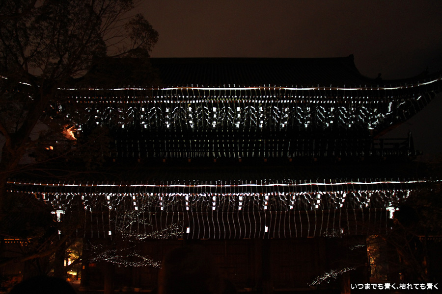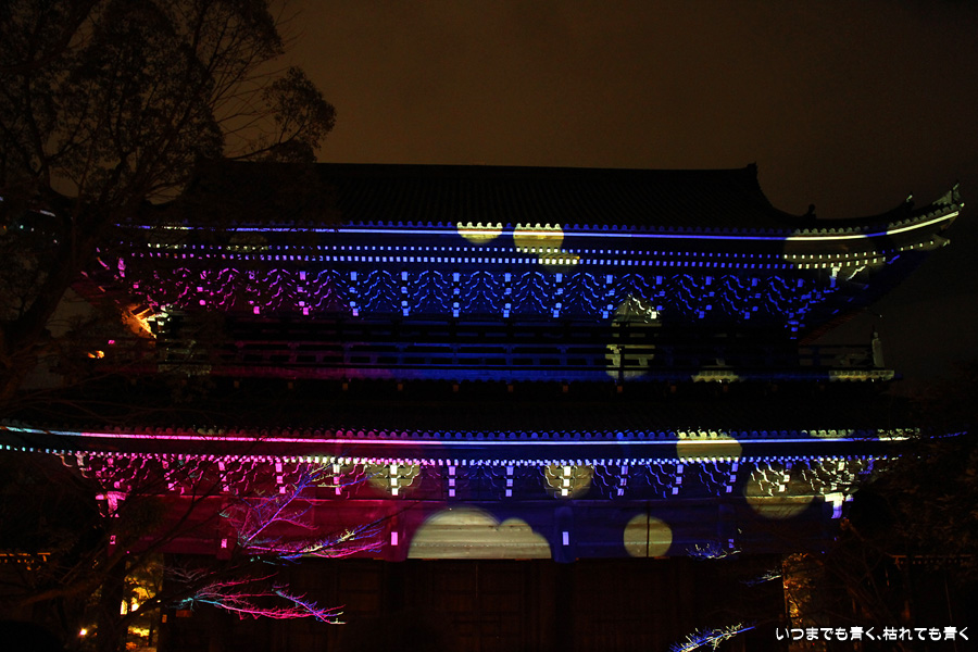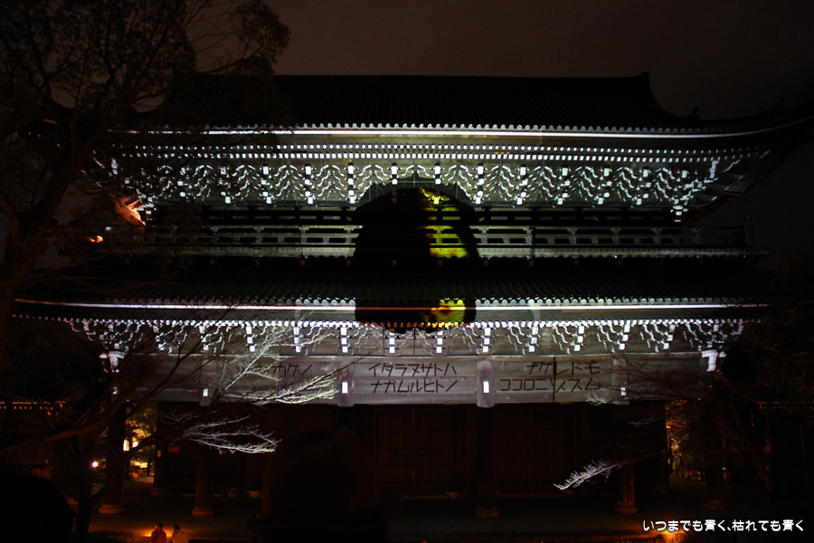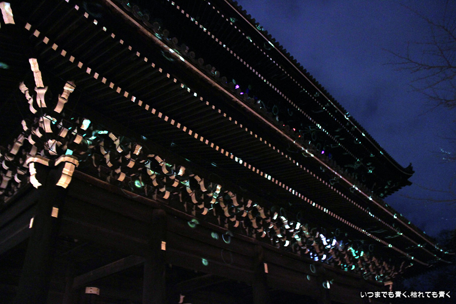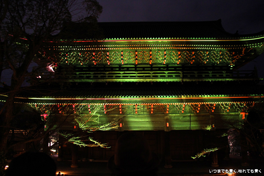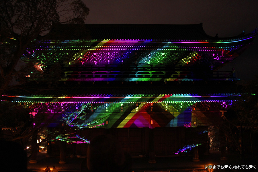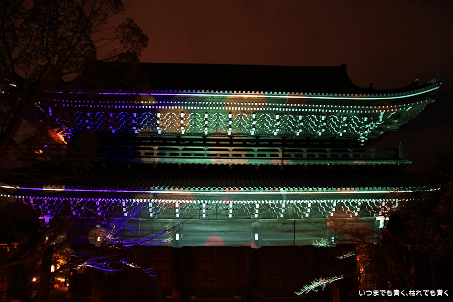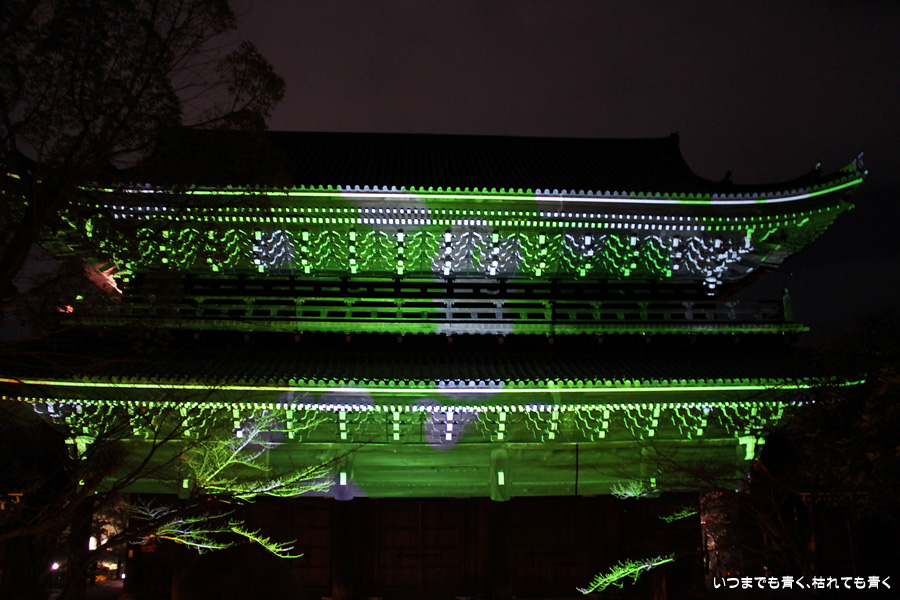 次は知恩院の三門に映し出される「幻想の灯り」を見に行きました。しかし、知恩院の三門前に着きましたが何も映っていません。三門の前にいたスタッフらしき女性に聞いてみると、三門の裏でやっているとのこと。脇の道から境内に入っていくと、やっていました。大きな三門をスクリーンにして、いろいろな光のアートを映し出していました。石段に座って巨大スクリーンを鑑賞するのはなかなか楽しかったです。ただ、花灯路が21時半までなのに対して、すでにこの時点で時刻は21時を過ぎており、「幻想の灯り」を楽しむのもそこそこにして、急いで知恩院の友禅苑に入りました。暗い中で一部がライトアップされた庭園は幻想的でしたが、ちょっと消化不良。ここは明るいときに楽しむ庭園かなという感じでした。