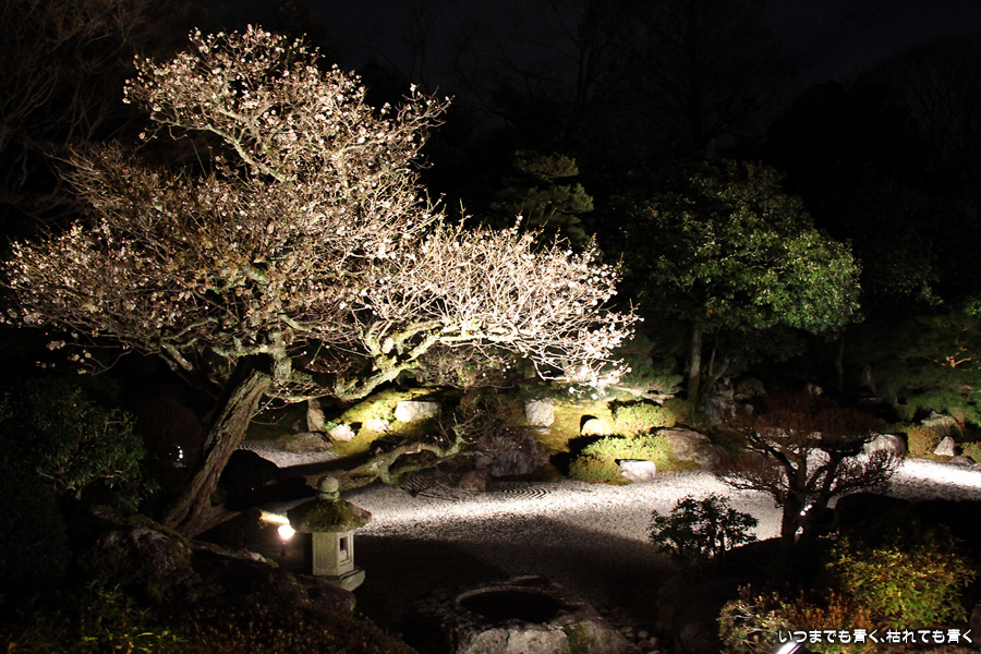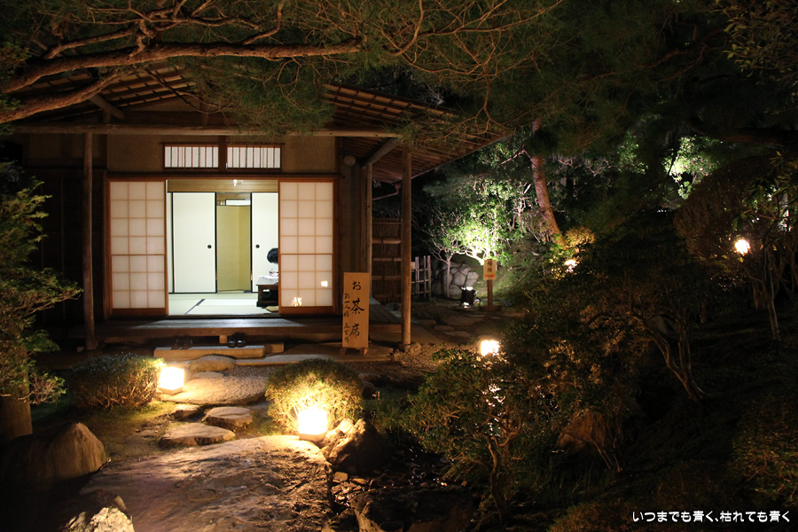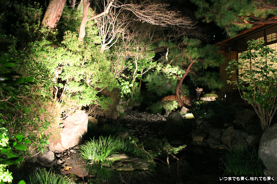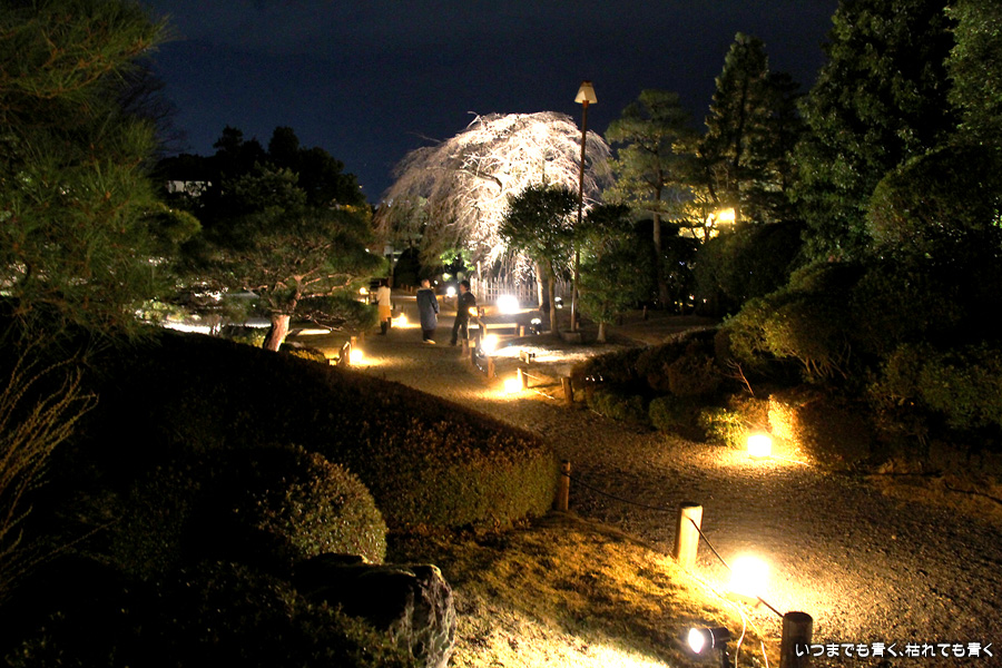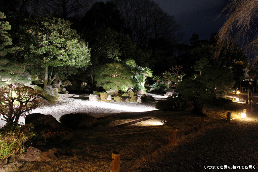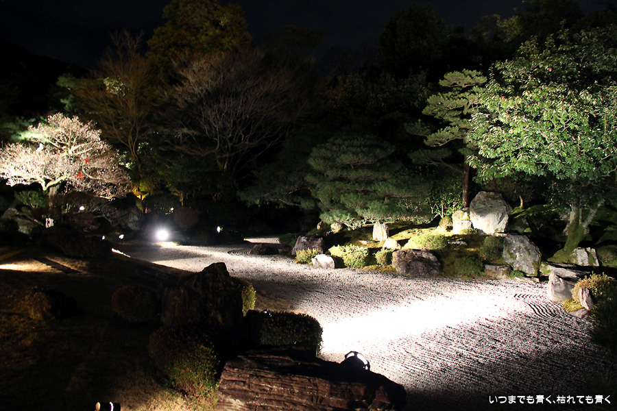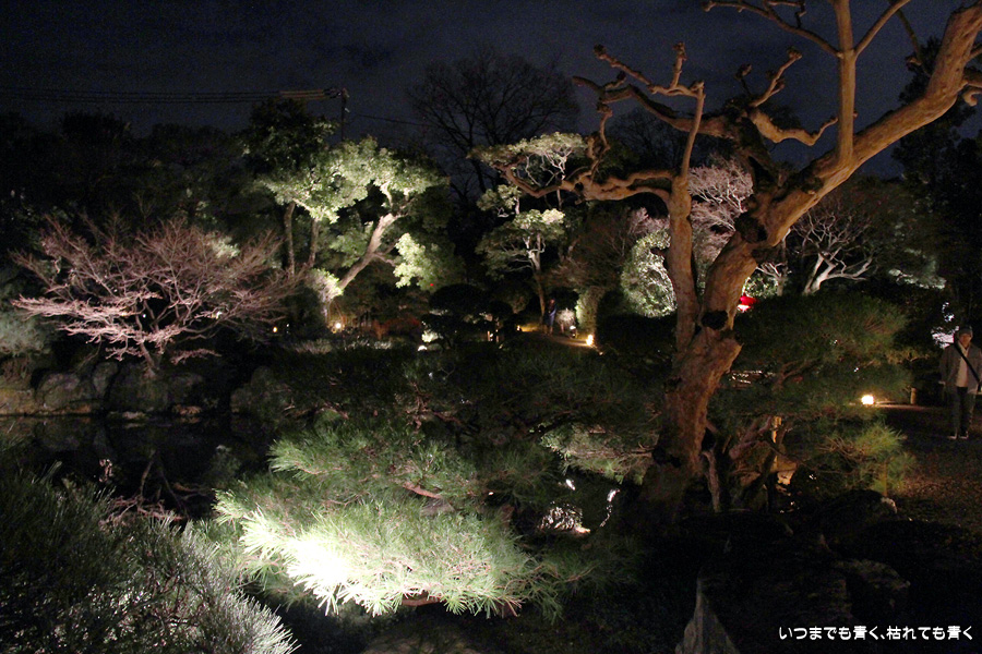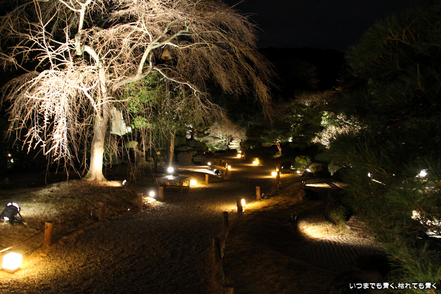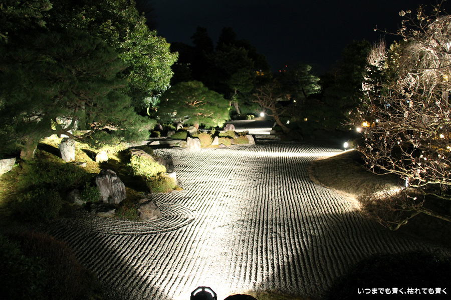 次は知恩院の三門に映し出される「幻想の灯り」を見に行きました。しかし、知恩院の三門前に着きましたが何も映っていません。三門の前にいたスタッフらしき女性に聞いてみると、三門の裏でやっているとのこと。脇の道から境内に入っていくと、やっていました。大きな三門をスクリーンにして、いろいろな光のアートを映し出していました。石段に座って巨大スクリーンを鑑賞するのはなかなか楽しかったです。ただ、花灯路が21時半までなのに対して、すでにこの時点で時刻は21時を過ぎており、「幻想の灯り」を楽しむのもそこそこにして、急いで知恩院の友禅苑に入りました。暗い中で一部がライトアップされた庭園は幻想的でしたが、ちょっと消化不良。ここは明るいときに楽しむ庭園かなという感じでした。