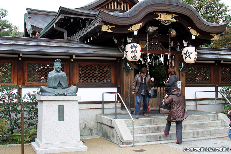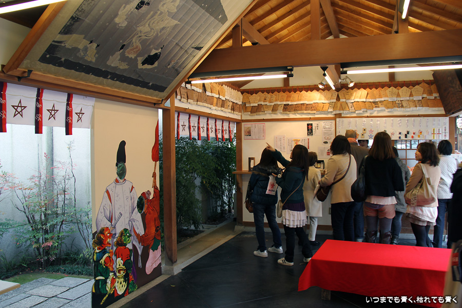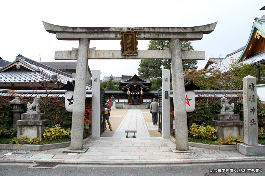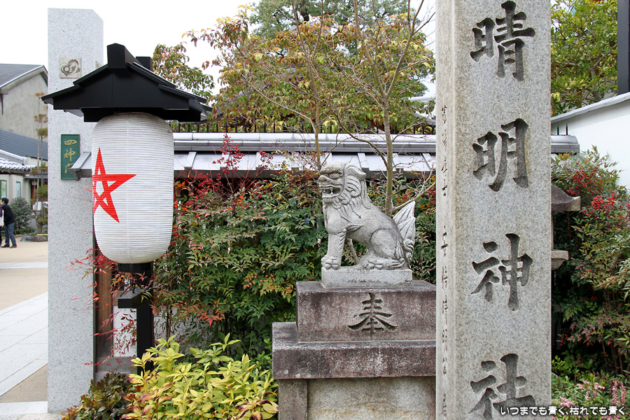 神社のいたるところに魔よけの記号である「五芒星」が掲げられています。販売所には、「五芒星」のついたお守りなどが売られていますので、パワーが必要な人はぜひ買ってみましょう。さらに境内には、病気平癒のご利益があるという安倍晴明が念力で湧出させた水が湧き出る「晴明井」があります。飲んでも問題ないそうですが、ご利益を後で知ったので飲まずに帰って来てしまいました。次に行く機会があれば、ぜひ飲んでみましょう。晴明神社の前には、大正11年から平成7年まで実際に使われていた旧一條戻橋が復元され、その脇には式神の石像がちょっと不気味な感じで鎮座されています。現在の一條戻橋は、晴明神社のすぐ南の堀川に架かかるところにあります。一條戻橋というのは、熊野の僧・浄蔵が父の訃報を聞いて紀州熊野から京都に駆けつけた時、葬列がちょうどこの橋の上を通っており、そこで浄蔵が棺にすがって泣き悲しみ神仏に祈願したところ、不思議なことに父が蘇生したという伝説から戻橋と名付けられ橋です。そういうことから、「あの世」と「この世」をつなぐ橋とも言われています。