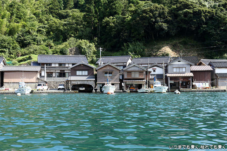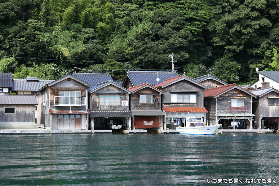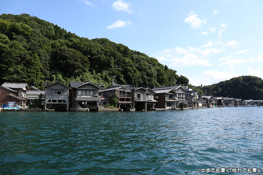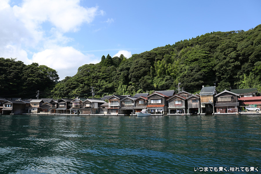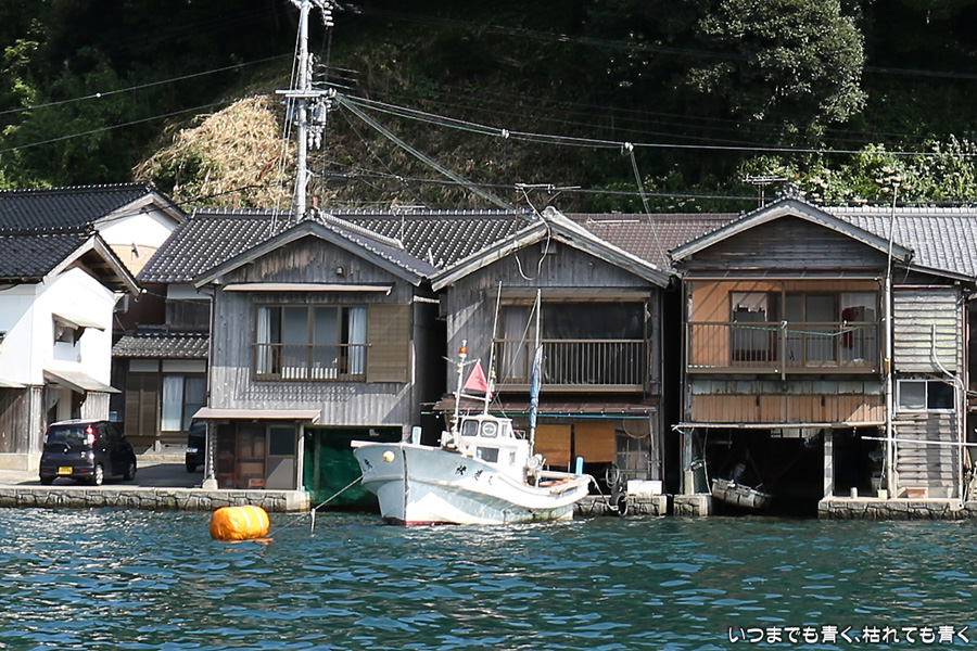 今回の旅でどうしても見たかった風景のひとつ、伊根の舟屋です。これだけの数の舟屋が並んでいる光景はここだけ。そのために、いろんなドラマのロケ地になった場所でもあります。奥の方まで舟屋が美しく連なっていて見ごたえがありますが、それを見るためには船が必須で、駐車場の近くにいろんな船の連絡先が書いてあります。今回は遊覧船ではなく海上タクシーを選んで頼みましたが、説明も楽しくて、要望にこたえて臨機応変に回ってくれてとても楽しめました。