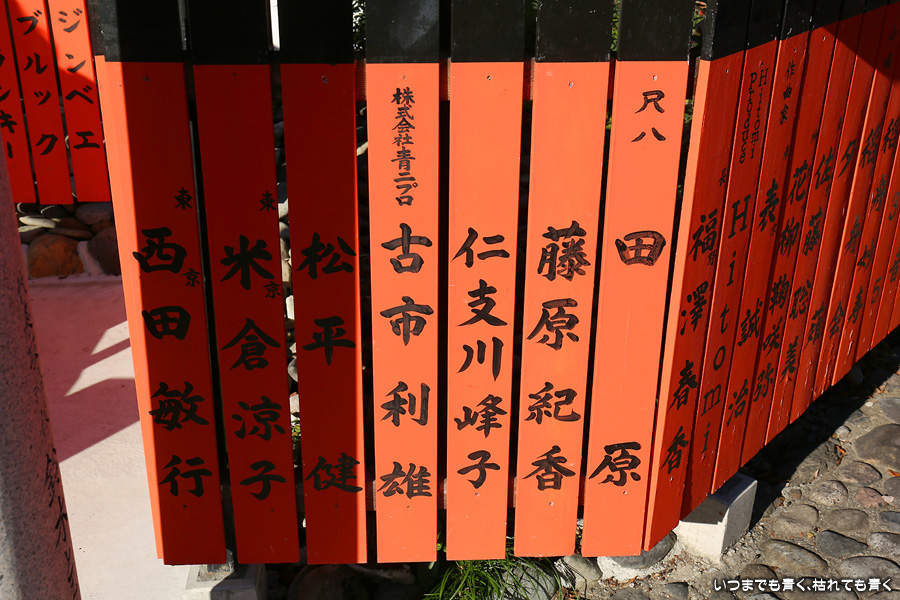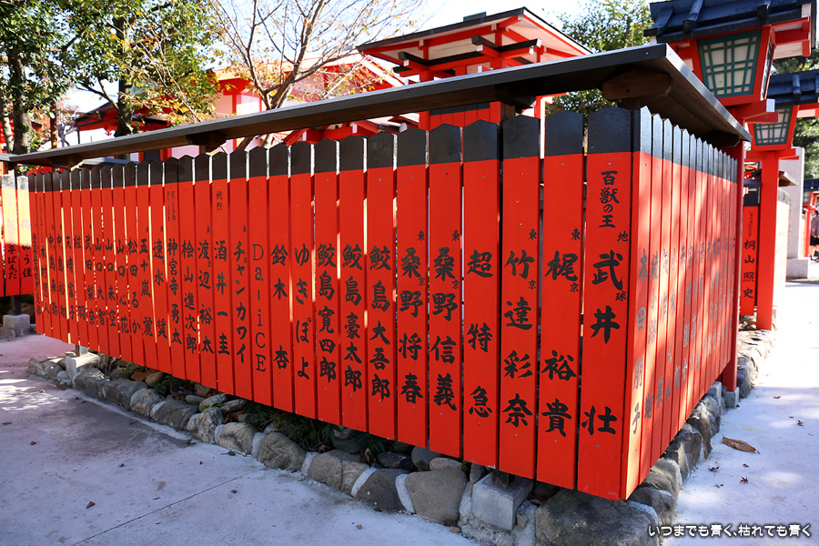 鹿王院の紅葉を見た後に歩いてやってきました。車折神社も今回は初めての参拝となります。車折神社には15の末社がありますが、その中でも最も有名なのは芸能神社です。有名人の名前が書かれた朱色の奉納板がずらりと並んでいるのが壮観です。紅葉は散ってしまっていたり青かったりしてあまりきれいではなかったので、紅葉の写真は諦めることにしました。帰りは車折神社の真ん前の駅から嵐電で嵐山まで戻りました。