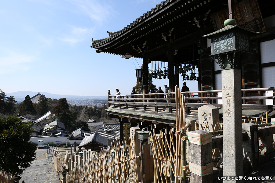 私の大好きなさだまさしの「修二会」を聴くたびに、頭の中でその世界を想像していました。修二会本行は3月1日から3月14日まで。この間は連夜、二月堂にお松明が走ります。いつかは見てみたいと思っていましたが、お水取りの日(3月12日)の大混雑は避けて、今夜を選んで出かることにしました。写真は、お松明の時刻を待つ昼間の二月堂の写真です。